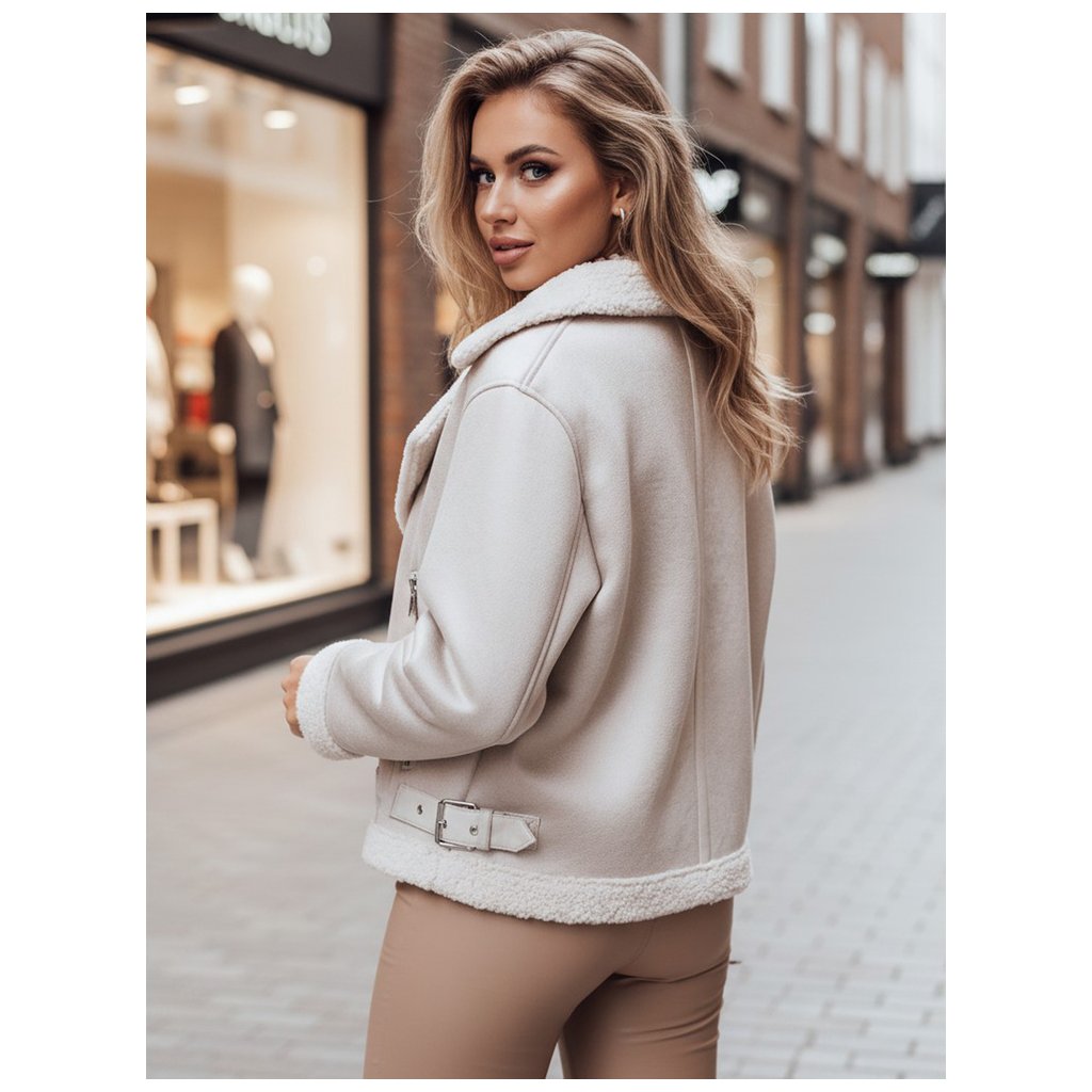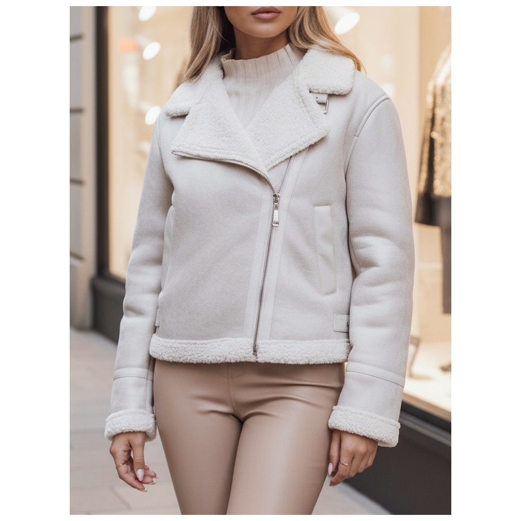 Dámska krátka bunda. Bez kapucne. Zapínanie na zips. Dve vonkajšie vrecká. Podšívka z ovčej kože. Farba: Biela. Zloženie: 100% polyester. Podšívka: 100% polyester. Miery modelky: