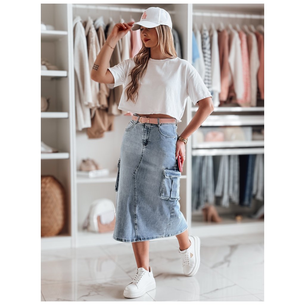 Táto midi džínsová sukňa má módny cargo strih, ideálny pre milovníčky ležérneho štýlu. Má veľké ozdobné bočné vrecká a decentné prešívanie, ktoré dodáva sukni jedinečný nádych. Vysoký pás lichotí postave a opticky predlžuje nohy, zatiaľ čo decentný rozparok vzadu zaisťuje pohodlné nosenie. Je ideálna na každodenné nosenie a dobre sa hodí k teniskám aj elegantným členkovým topánkam.