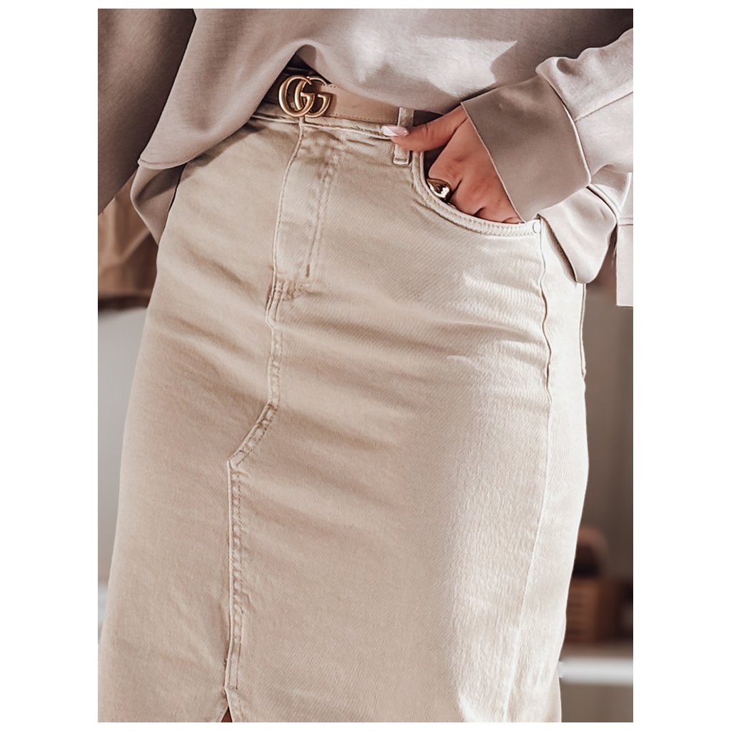Táto džínsová midi sukňa má klasický strih s vysokým pásom, ktorý zdôrazňuje siluetu a pás. Predná časť je zdobená rozparkom pre väčšiu ľahkosť a voľnosť pohybu. Model má ozdobné vrecká. Ideálne na každodenné nosenie aj elegantné outfity. Tento pohodlný strih sa bude hodiť k mnohým outfitom a kombinuje pohodlie s nadčasovou eleganciou.