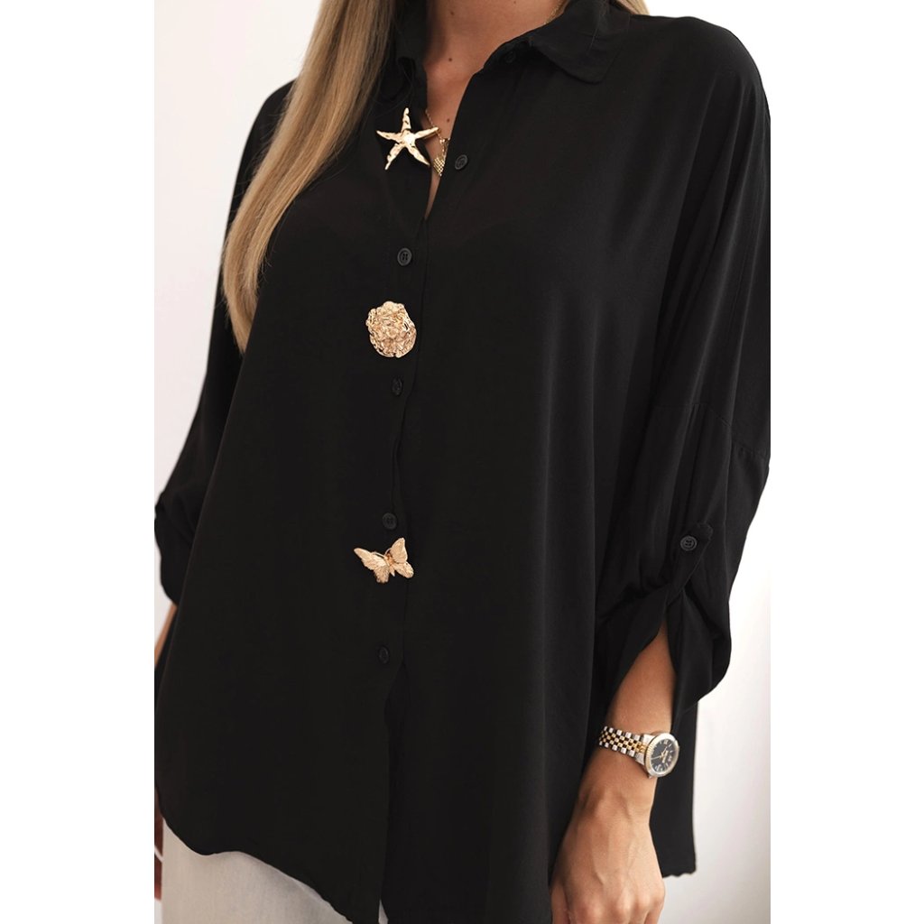 Elegantná dámska košeľa z viskózy je skvelým návrhom na každú príležitosť – ako na denné nosenie, tak do práce. Jemný, príjemný na dotyk materiál zaisťuje komfort a voľnosť pohybu. Klasický golier dodáva celku štýlový charakter a dekoratívne gombíky – vrátane motívu hviezdy a motýľa – zdôrazňujú originálny štýl.