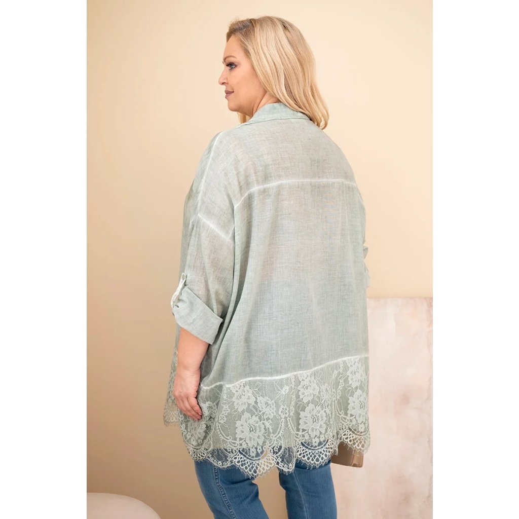 Ak hľadáte originálnu a štýlovú košeľu, ktorá priťahuje pozornosť a zároveň zaisťuje pohodlie pri nosení – táto praná dámska košeľa s čipkovaným lemom bude skvelou voľbou! Jemný, praný materiál jej dodáva jedinečný, ľahko retro charakter a ľahká bavlna zaručuje komfort po celý deň.