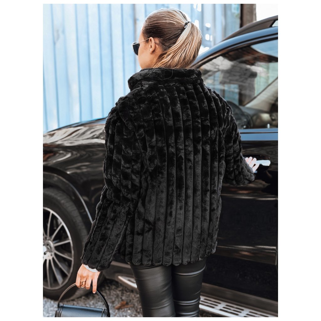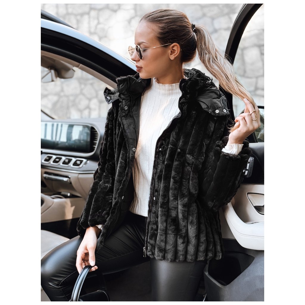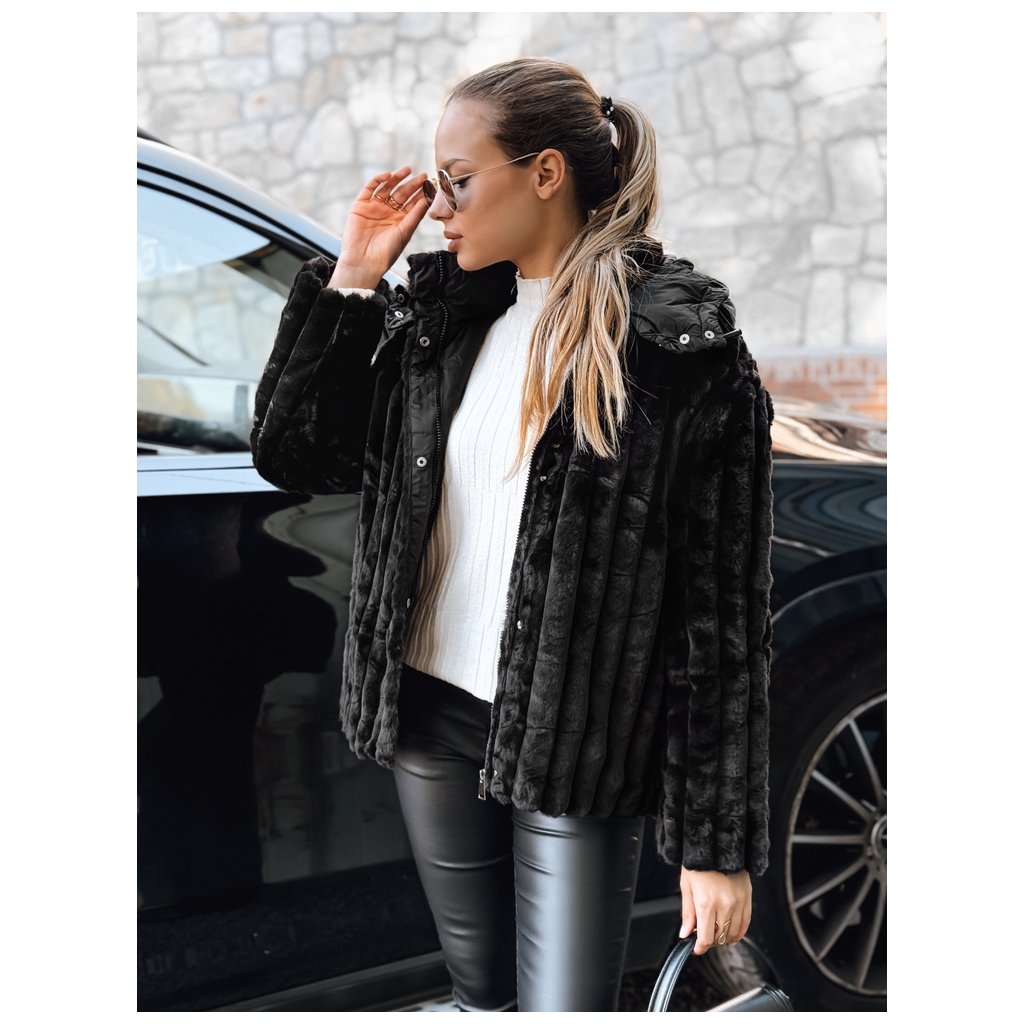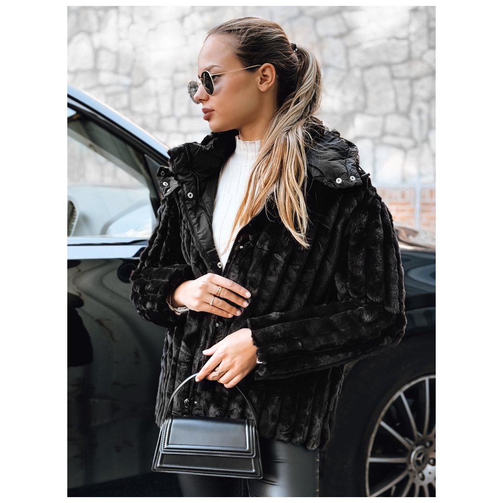 Dámska čierna kožušinová bunda s kapucňou TY5276