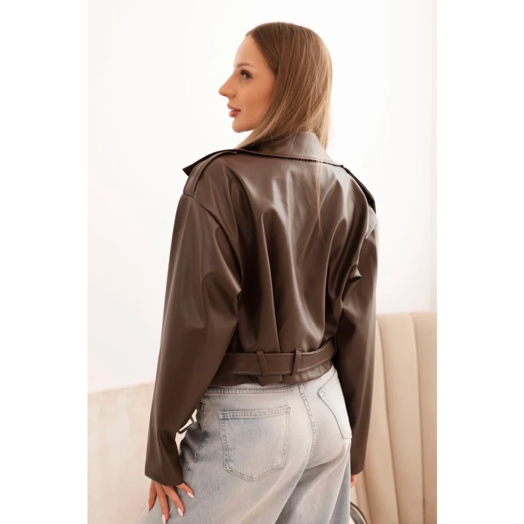 Dámska krátka bunda z eko kože s opaskom a golierom