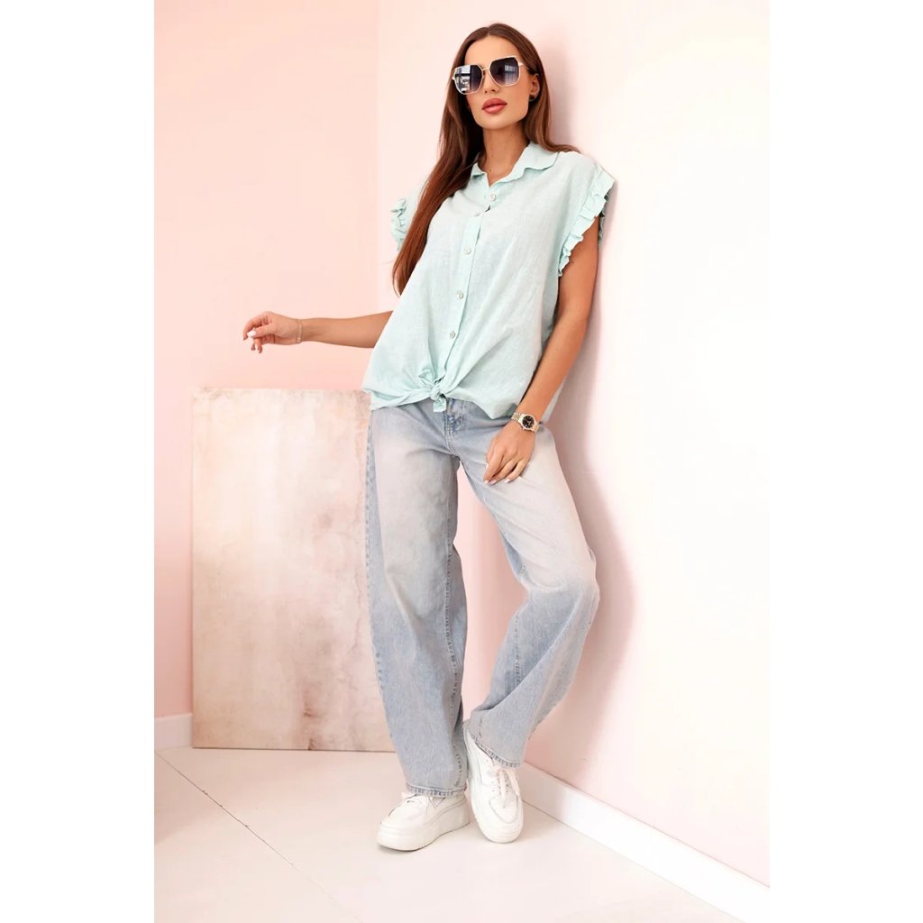 Dámska ľanová košeľa bez rukávov s volánmi a zaväzovaním - tmavo mentolová