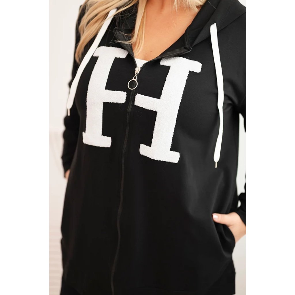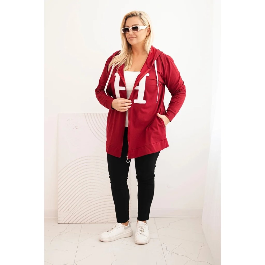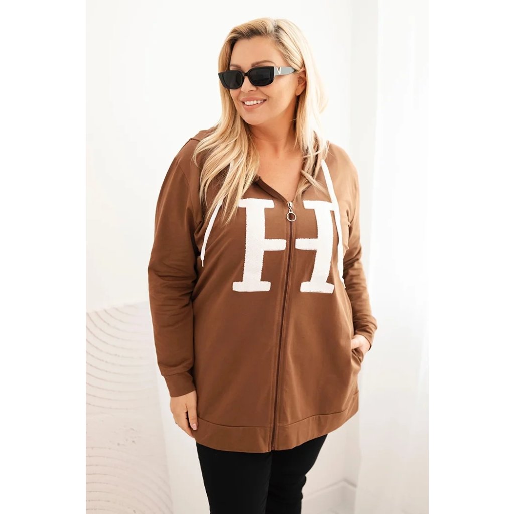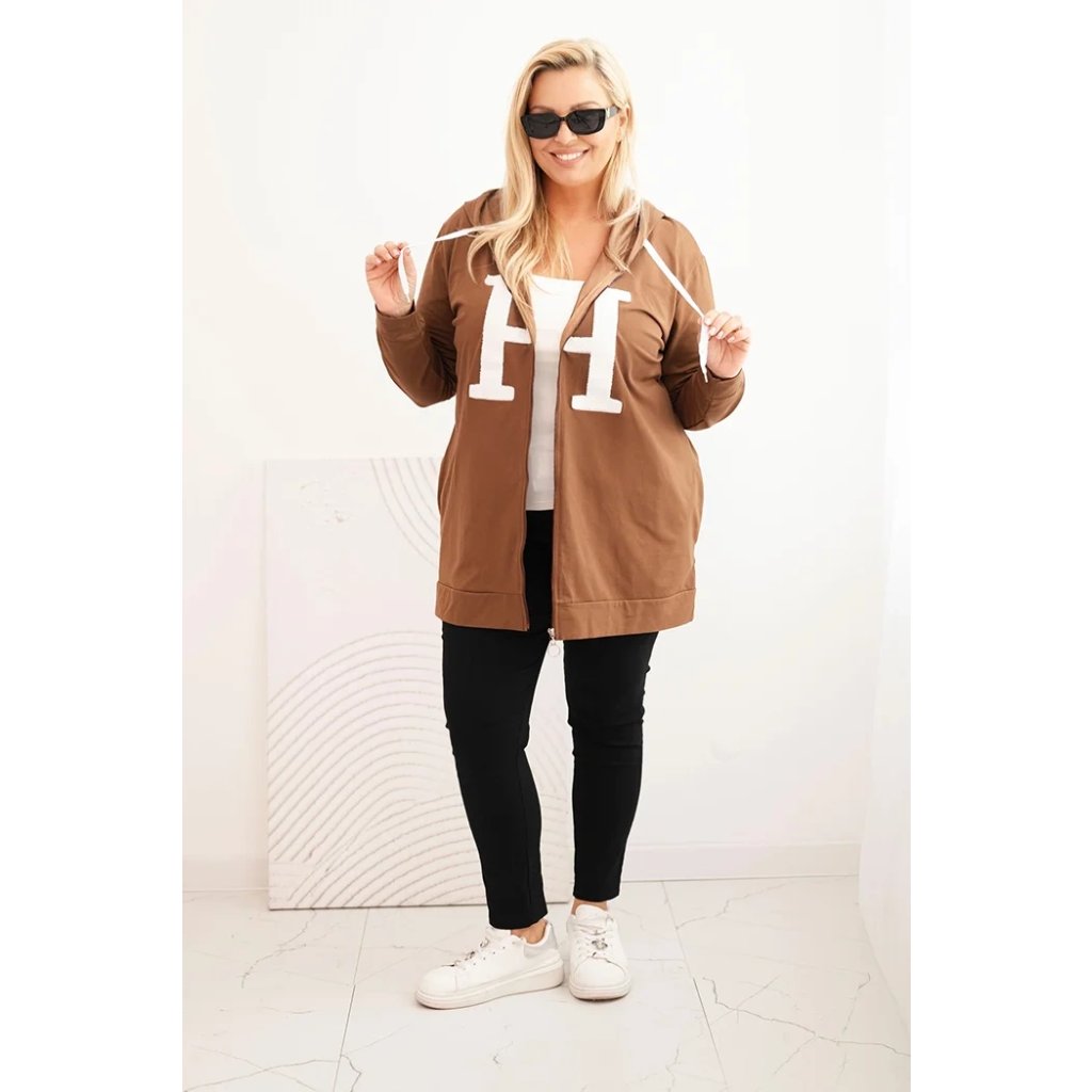 Dámska mikina Plus Size s kapucňou a ozdobným písmenom „H” na prednej strane je kombináciou mestského štýlu a maximálneho komfortu. Pohodlný strih, praktická kapucňa so šnúrkou a zips robia tento model ideálnym ako na každodenné nosenie, tak na prechádzky alebo víkendové výlety.