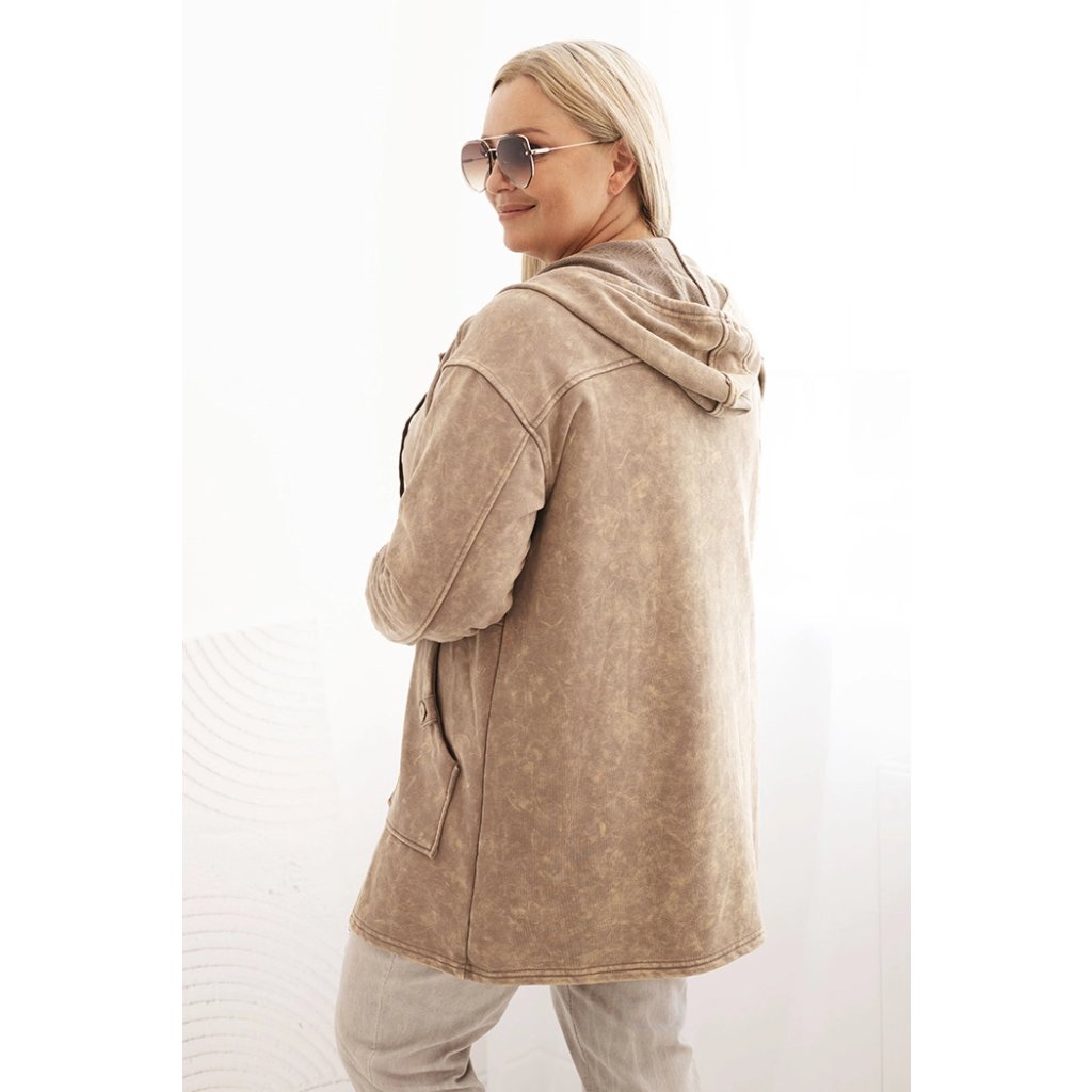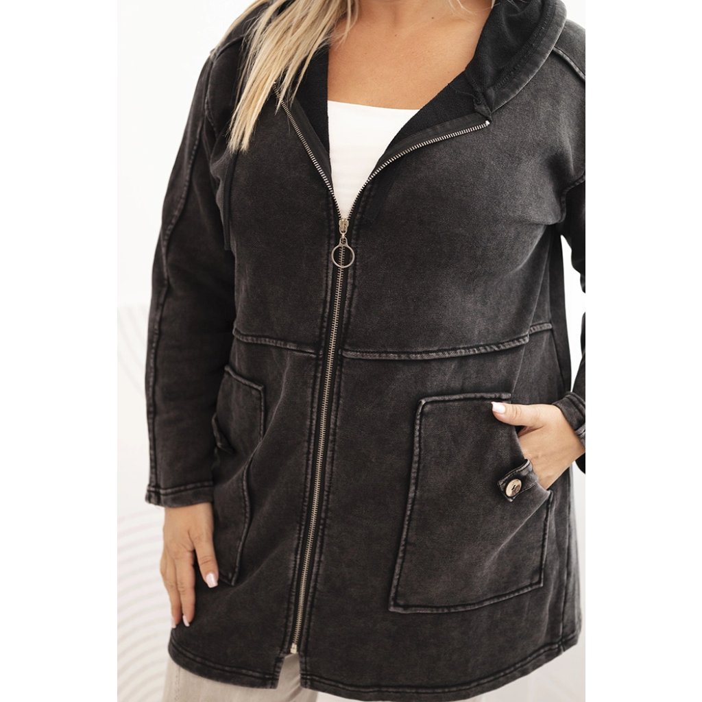 Štýlová dámska mikina Plus Size s efektom destilácie je ponukou pre ženy, ktoré majú rady pohodlie a neobvyklý štýl. Model vo voľnom strihu zaisťuje voľnosť pohybu a vďaka bavlnenej tkanine sa skvele hodí na každodenné nosenie. Mikina má kapucňu so šnúrkami, zips po celej dĺžke a dve priestranné vrecká s ozdobnými gombíkmi, ktoré dodávajú charakter. Surovo zakončené rukávy a spodná časť podčiarkujú jej moderný štýl.