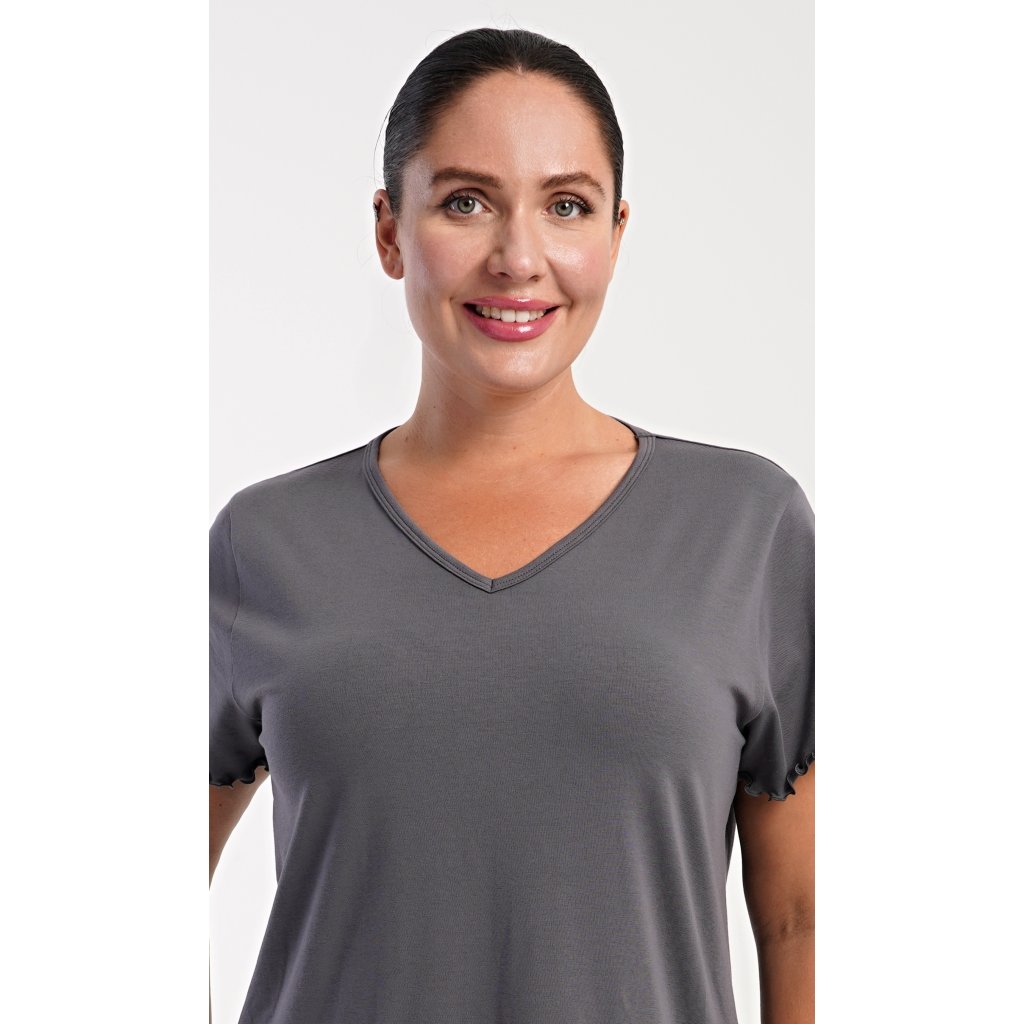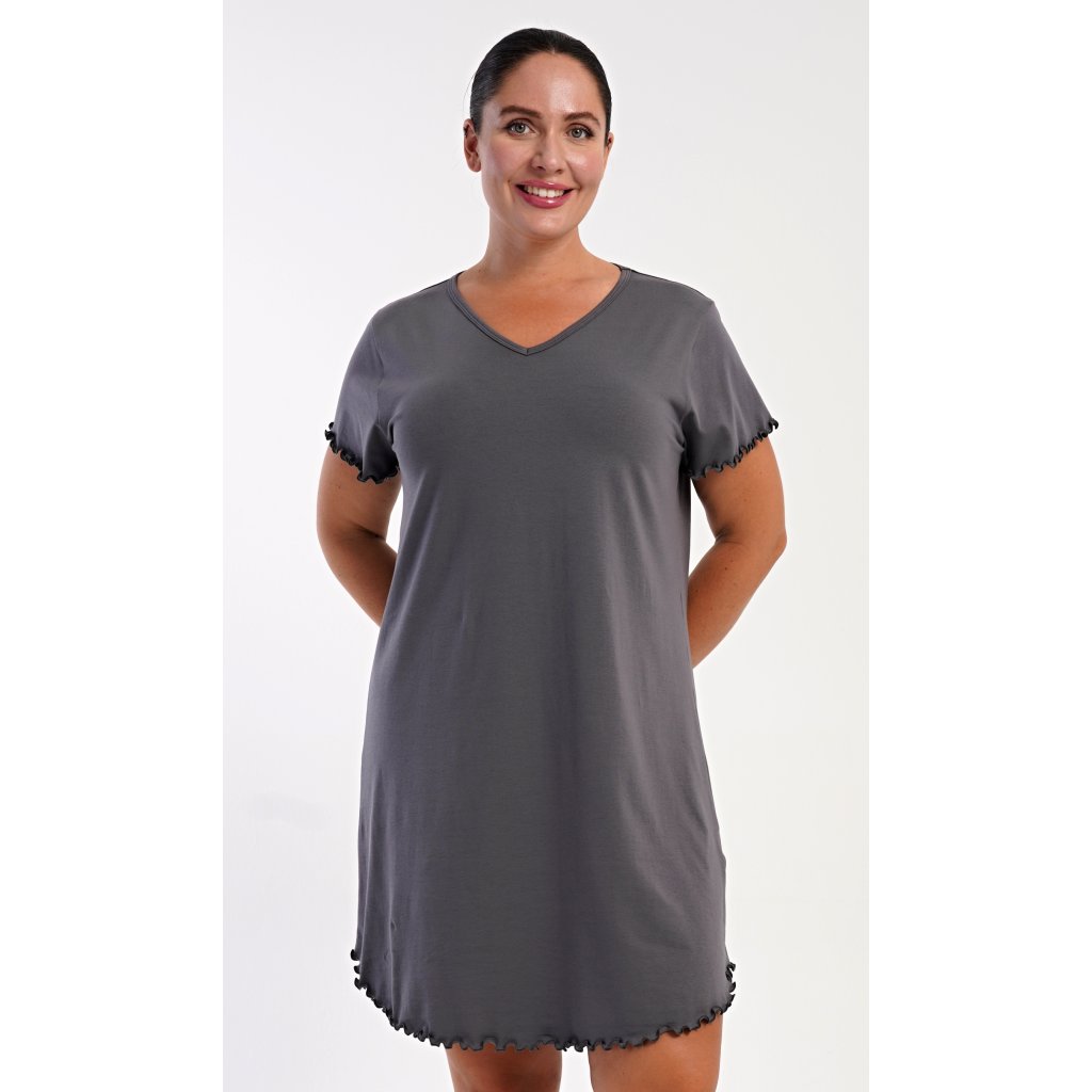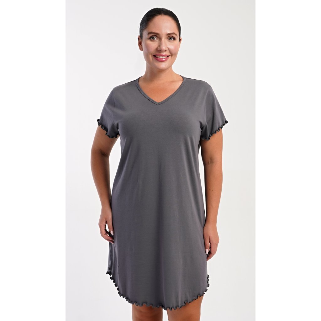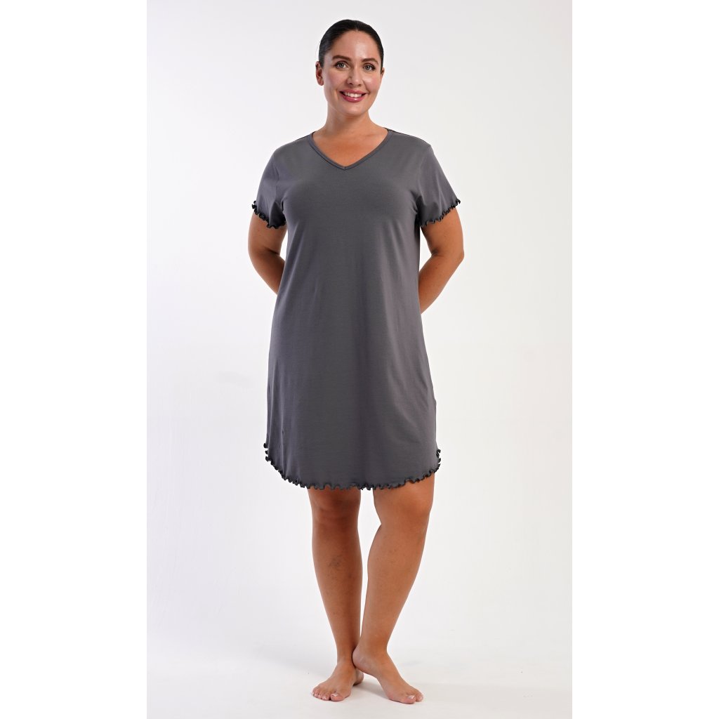 Dámska bavlnená nočná košeľa s krátkym rukávom Alexandra. Košeľa má príjemnú dĺžku nad kolená a výstrih do V, je zdobená vrúbkovaním na rukávoch a spodnom leme. Použitý materiál s podielom bavlny 95% je príjemný a poddajný na dotyk.