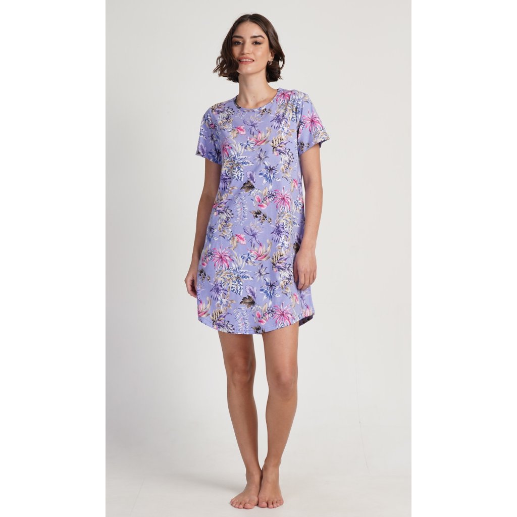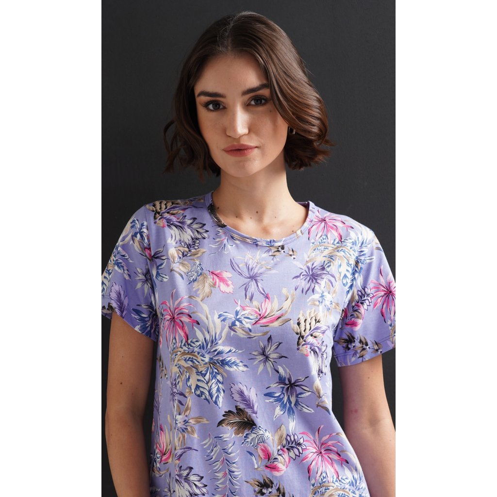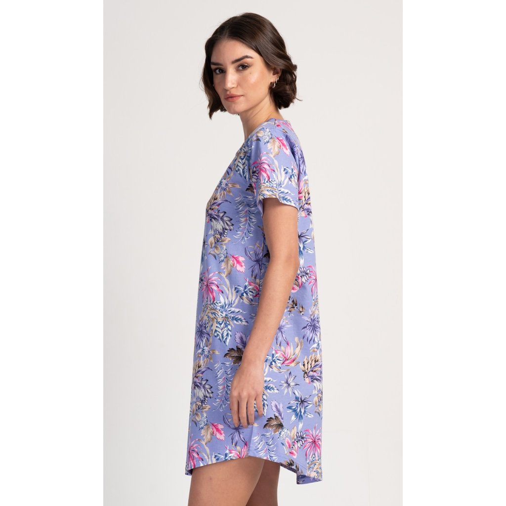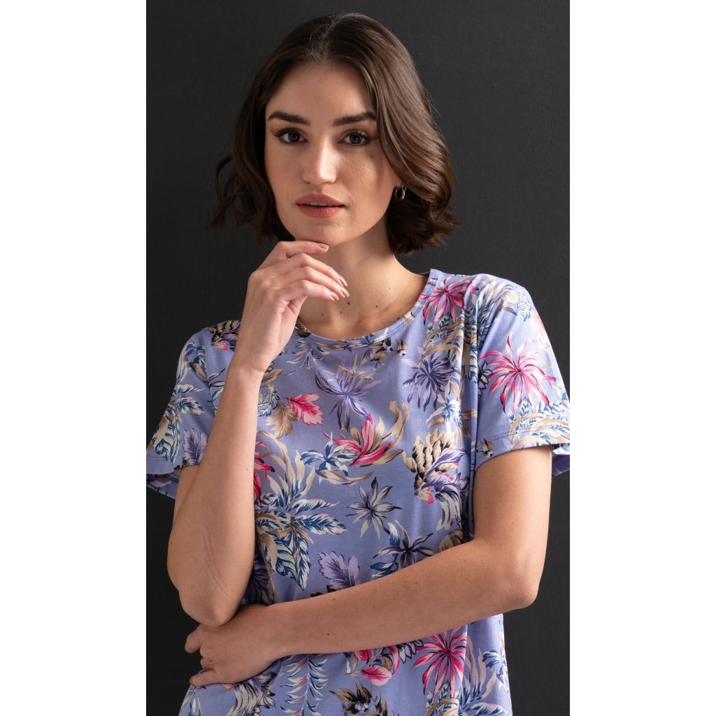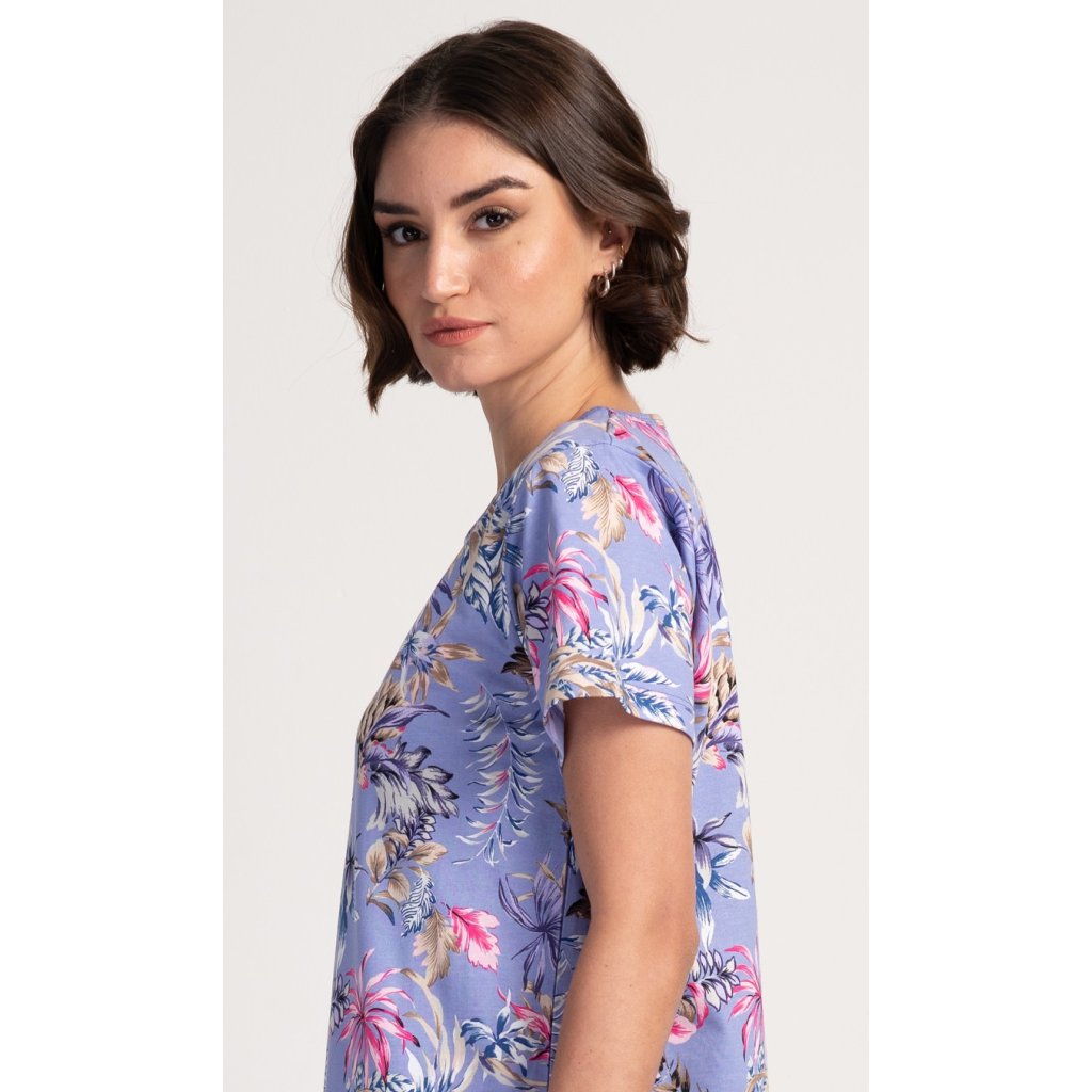 Dámska bavlnená nočná košeľa s krátkym rukávom Elizabeth. Táto dámska nočná košeľa s okrúhlym výstrihom má príjemnú dĺžku nad kolená. Tričko s krátkymi rukávmi je potlačené exotickými kvetmi. Použitý bavlnený materiál je príjemný a pružný na dotyk.