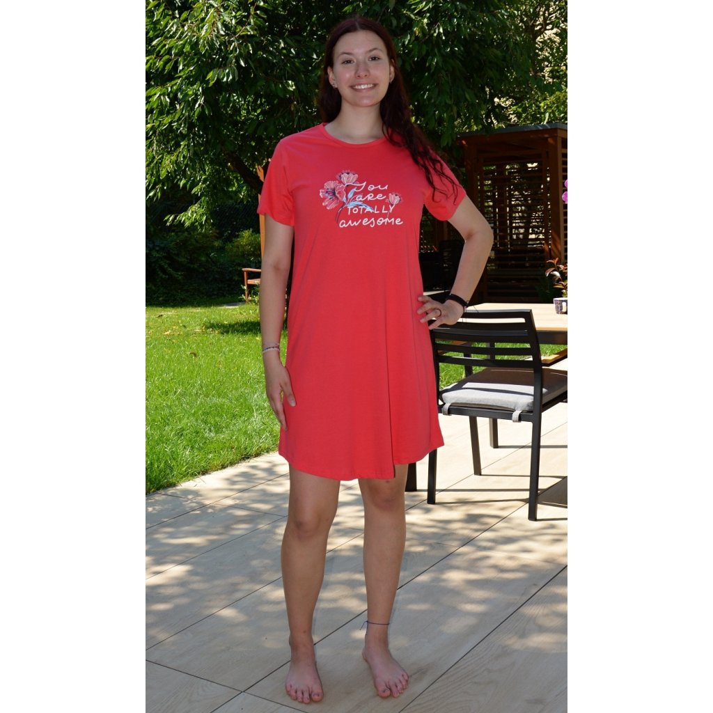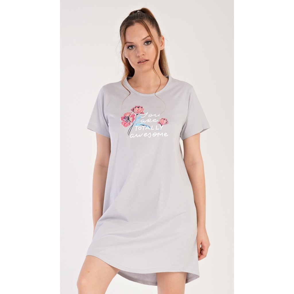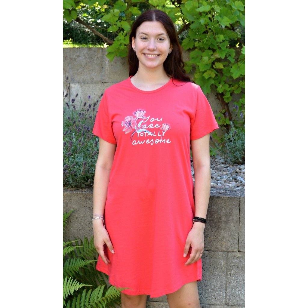 Dámska bavlnená nočná košeľa Cassie s krátkym rukávom. Táto nočná košeľa s okrúhlym výstrihom má na hrudi obrázok kvetov a nápis "You are totally awesome". Použitý bavlnený materiál je príjemný a pružný na dotyk.