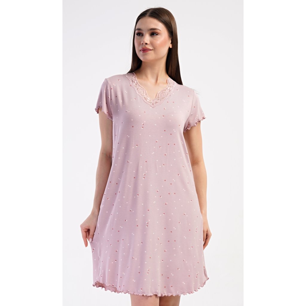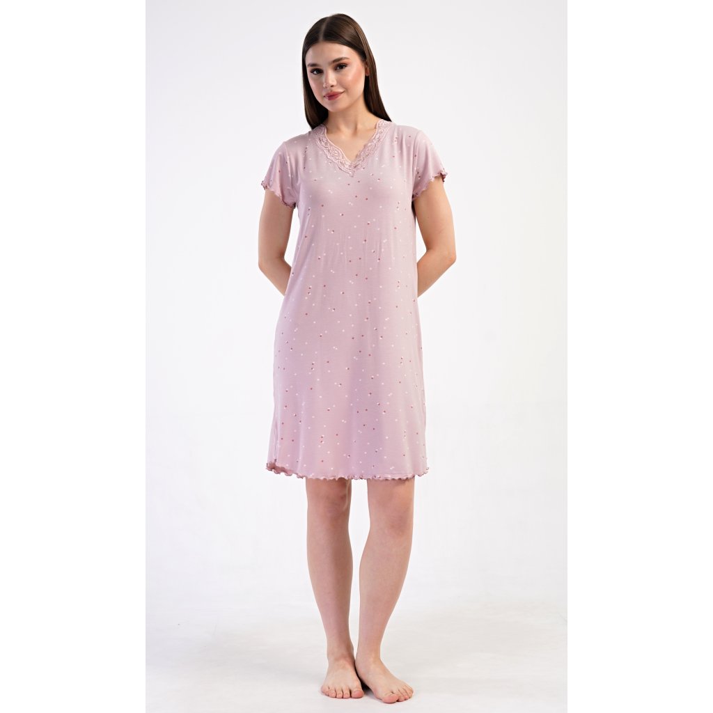 Dámska nočná košeľa s krátkym rukávom Isabela. Táto pohodlná nočná košeľa s dĺžkou po kolená má riasenie na rukávoch a spodnom okraji a výstrih zdobí čipka. Na látke trička sú vytlačené malé bodky. Viskózový materiál s lycrou je príjemný a pružný na dotyk.