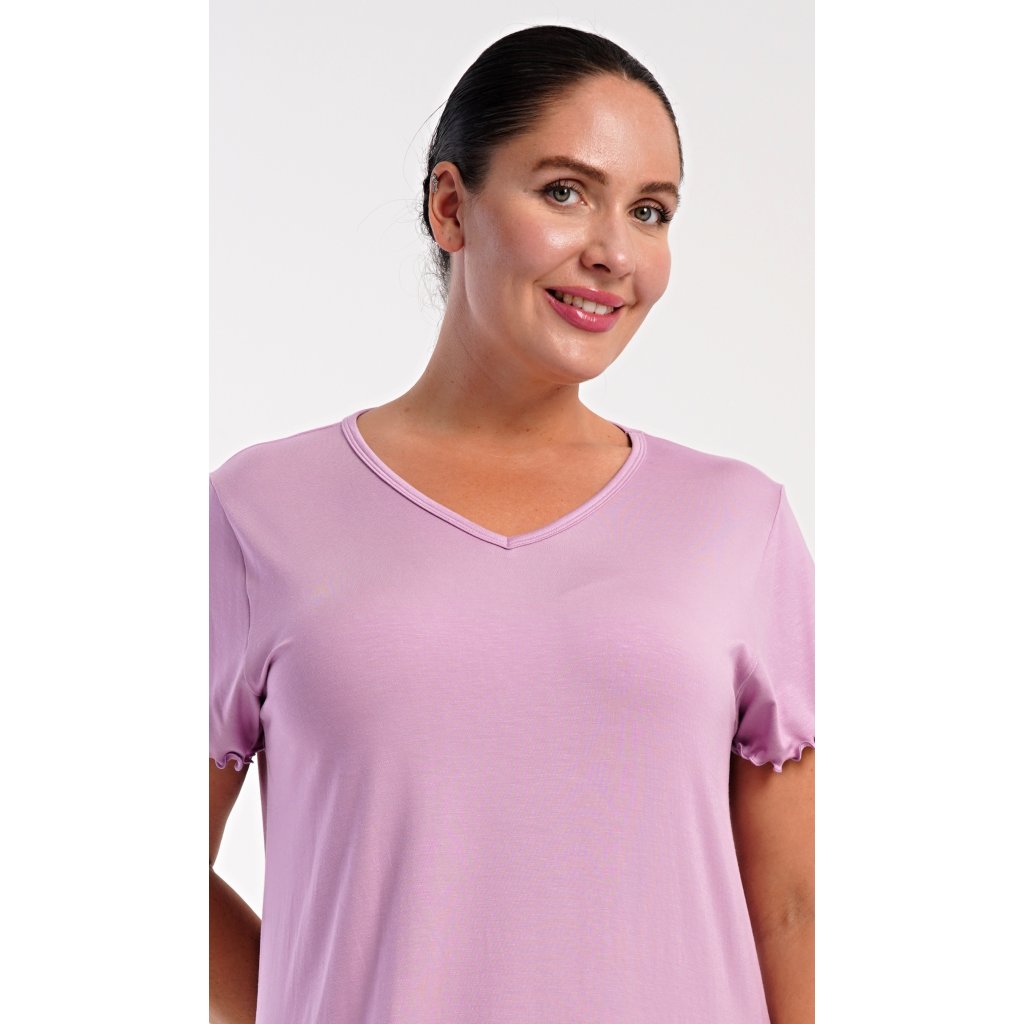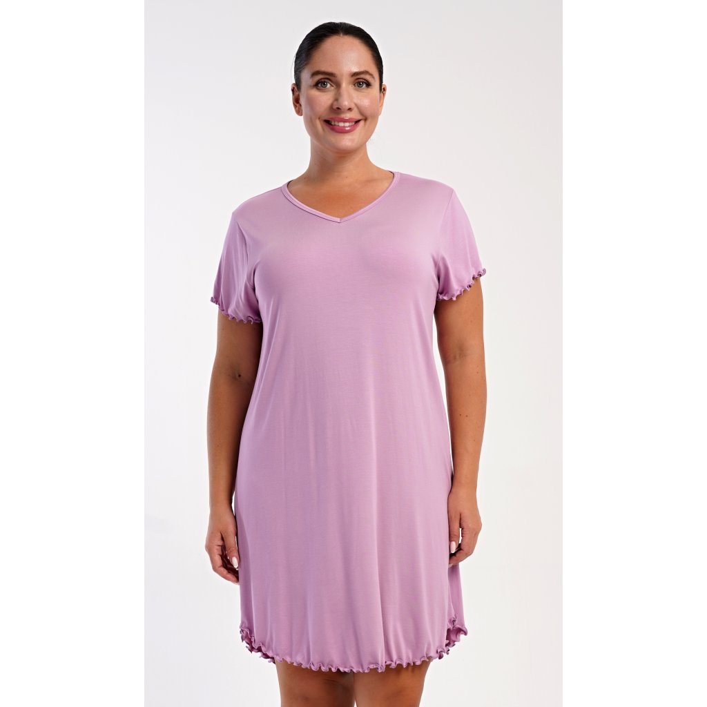 Dámska bavlnená nočná košeľa s krátkym rukávom Liliana. Košeľa má príjemnú dĺžku nad kolená a výstrih do V, je zdobená vrúbkovaním na rukávoch a spodnom leme. Použitý materiál s podielom bavlny 95% je príjemný a poddajný na dotyk.