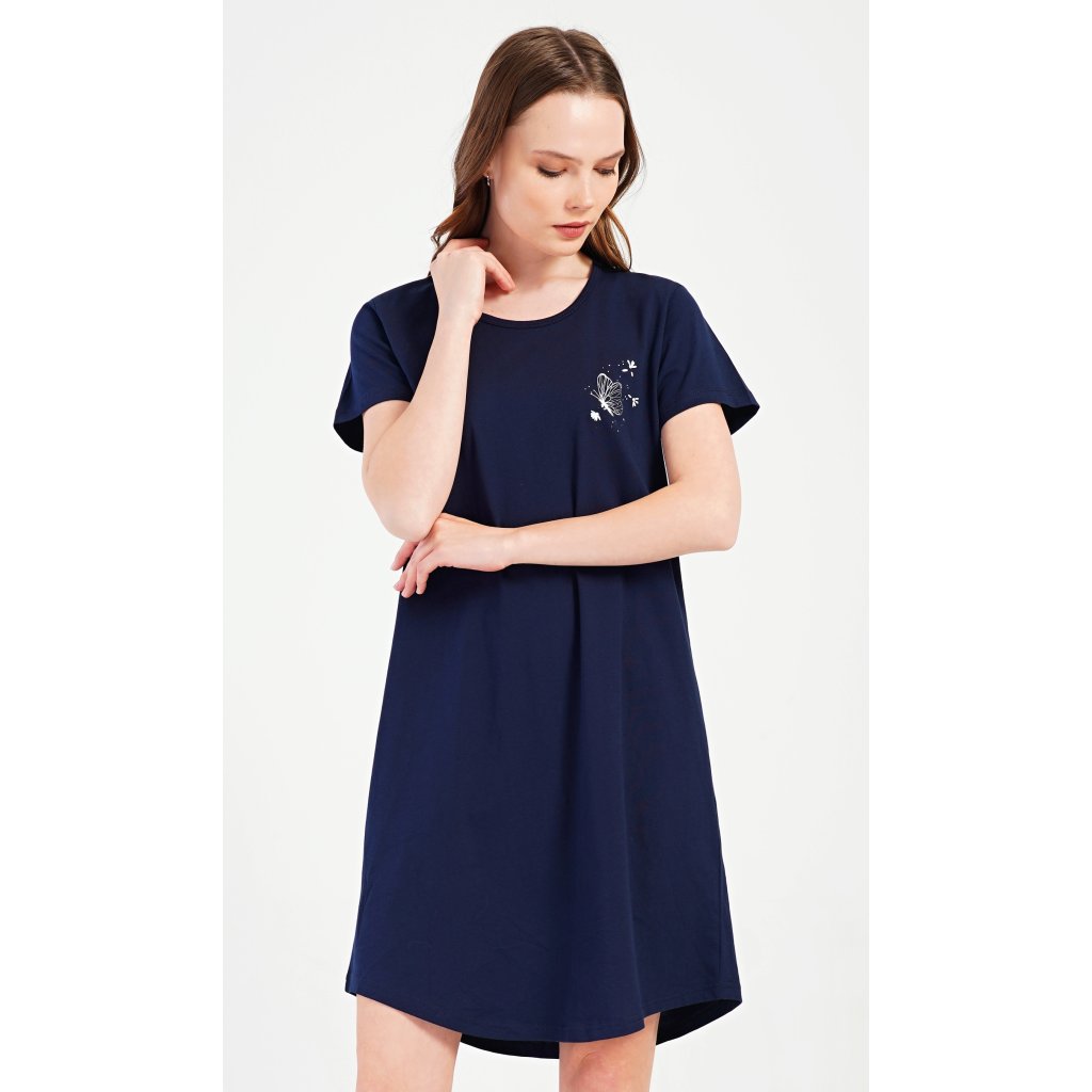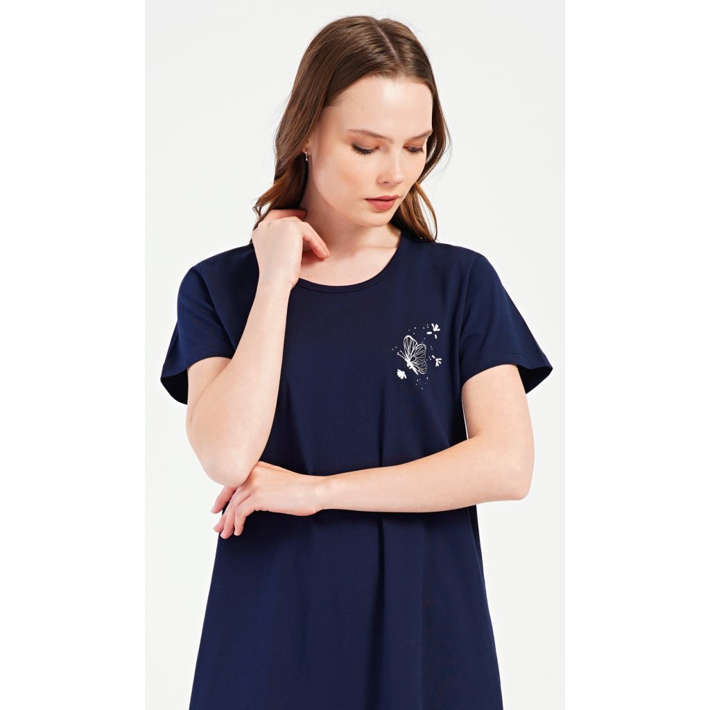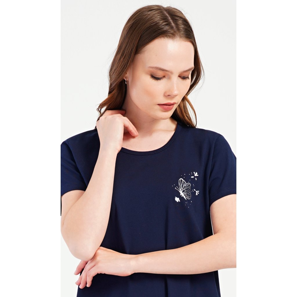 Dámska bavlnená nočná košeľa s krátkym rukávom Butterfly. Táto nočná košeľa s okrúhlym výstrihom a pohodlnou dĺžkou nad kolená má na hrudi jemný motýlí obrázok. Materiál zo 100 % bavlny je príjemný a hebký na dotyk.