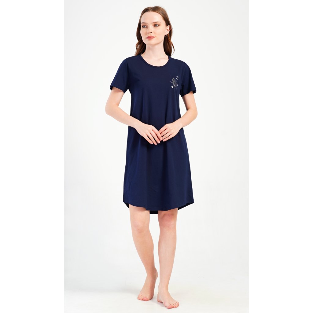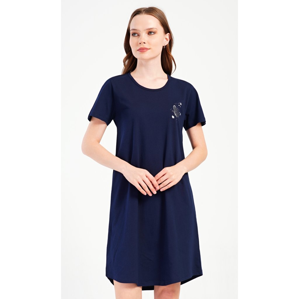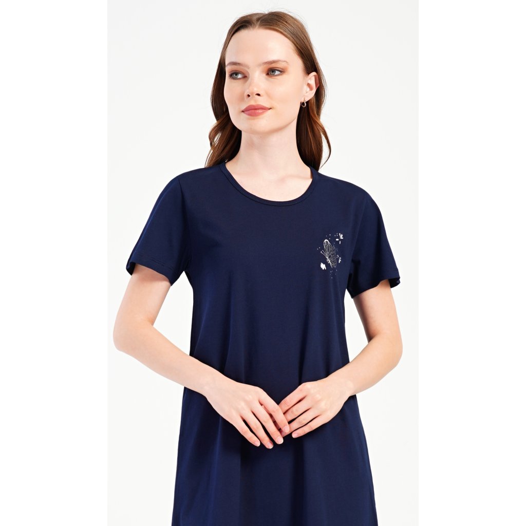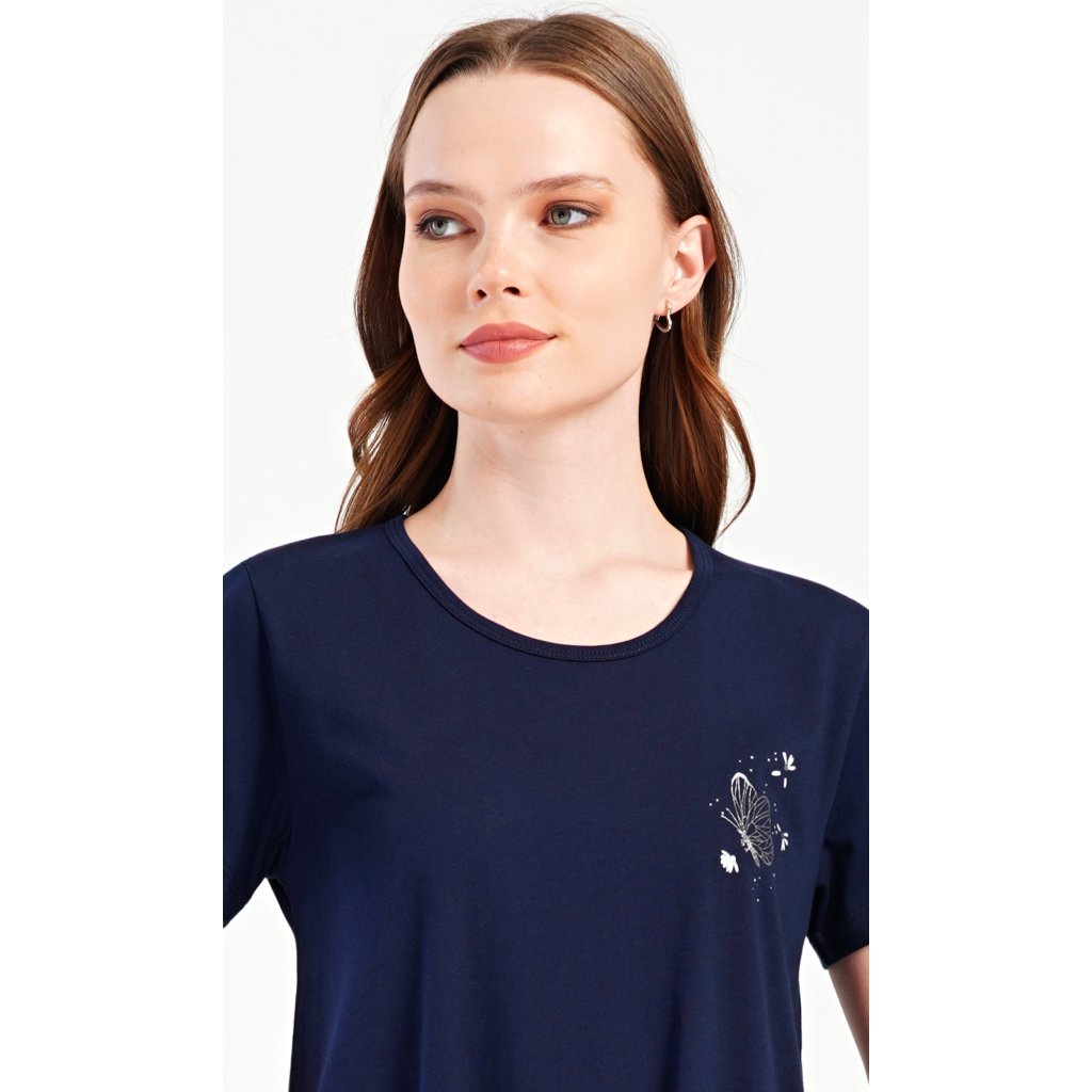 Dámska bavlnená nočná košeľa s krátkym rukávom Butterfly. Táto nočná košeľa s okrúhlym výstrihom a pohodlnou dĺžkou nad kolená má na hrudi jemný motýlí obrázok. Materiál zo 100 % bavlny je príjemný a hebký na dotyk.