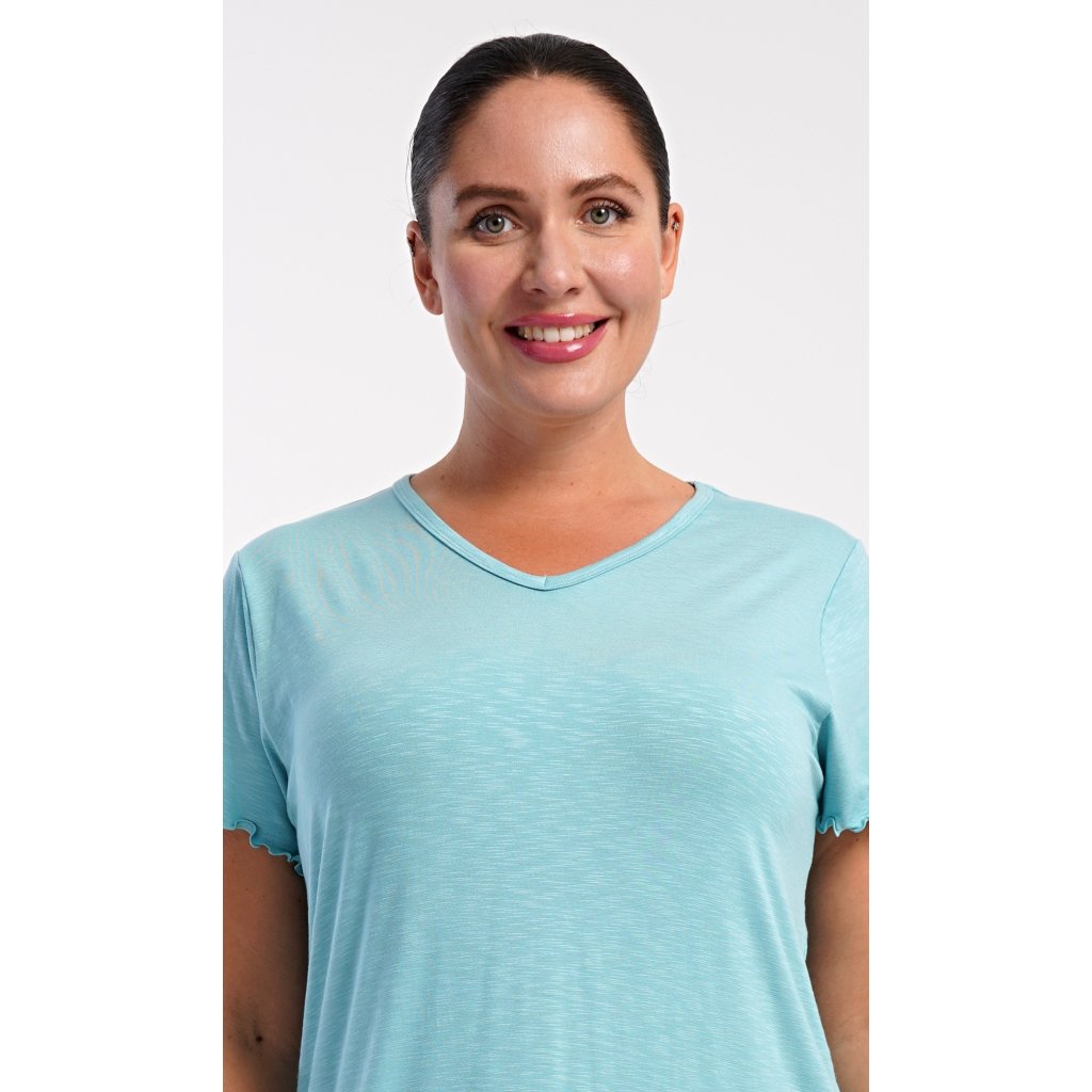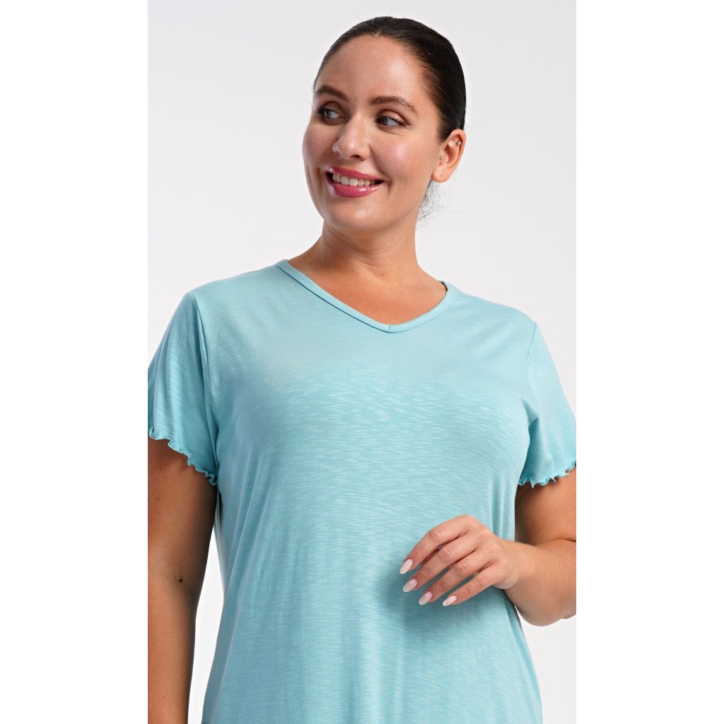Dámska bavlnená nočná košeľa s krátkym rukávom Sabrina. Košeľa má príjemnú dĺžku nad kolená a výstrih do V, je zdobená vrúbkovaním na rukávoch a spodnom leme. Použitý materiál s podielom bavlny 95% je príjemný a poddajný na dotyk.