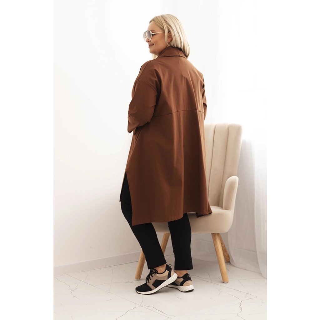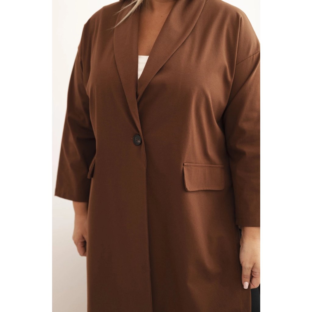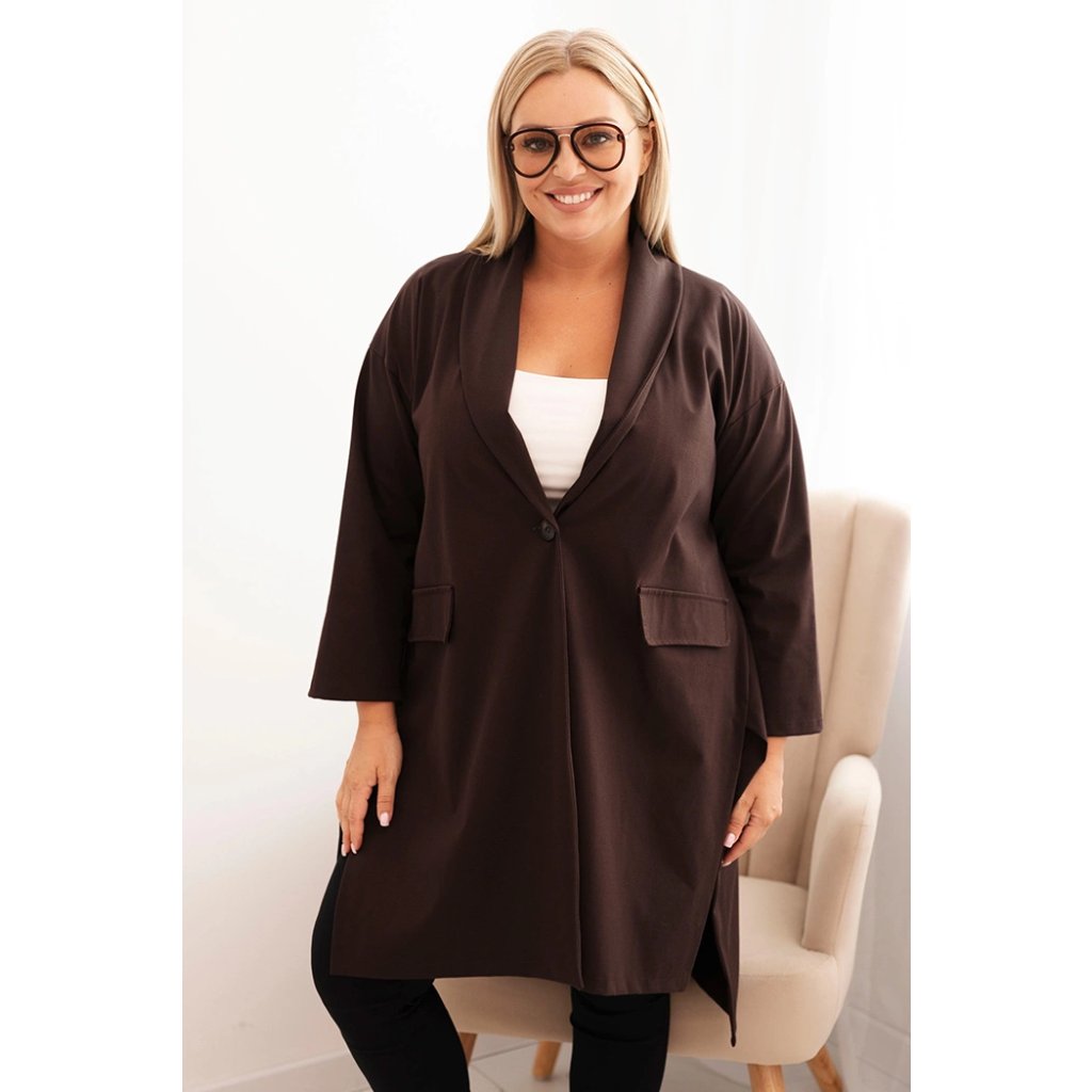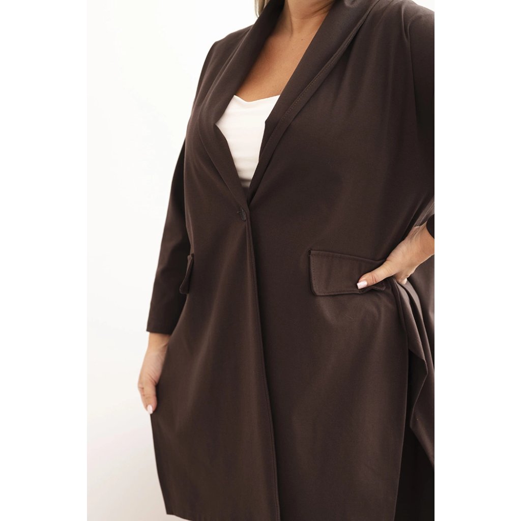 Dámske sako plus size punto s bavlnou je must-have v každom šatníku. Elastický materiál punto sa krásne prispôsobí postave a klasický strih s šálovým golierom a gombíkovým zapínaním dodáva eleganciu. Model má vrecká a predĺžený zadný diel, ktorý opticky zoštíhľuje postavu. Ideálne do práce, na schôdzky alebo každodenný styling.