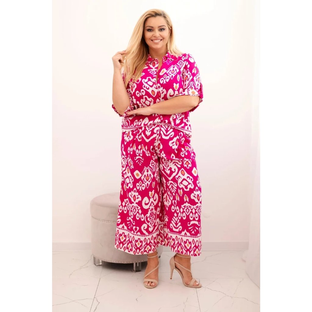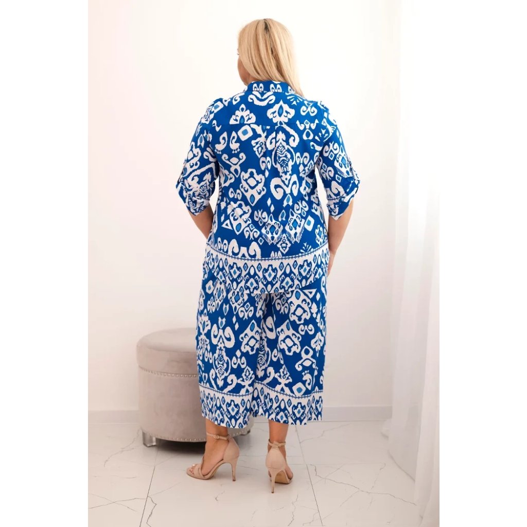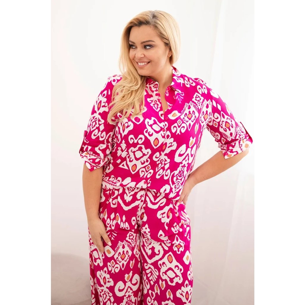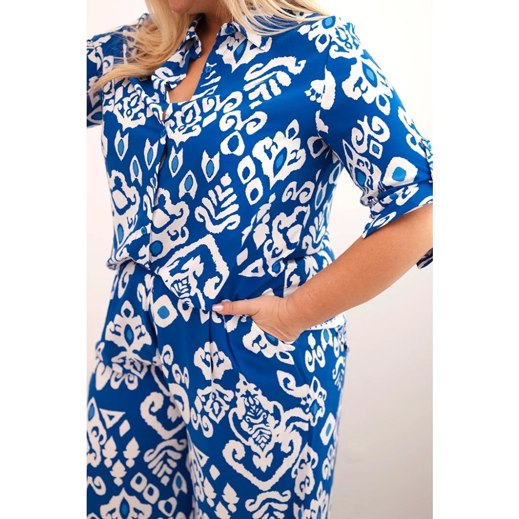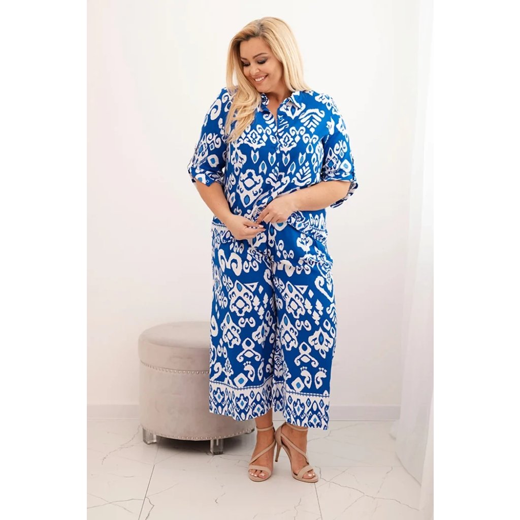 Táto štýlová dámska súprava z ľahkej, priedušnej viskózy je ideálnou voľbou na teplejšie dni. Súprava obsahuje voľnú blúzku s golierom a dlhým rukávom s možnosťou ohrnutia a široké, pohodlné nohavice s elastickým pásom. Geometrická potlač v orientálnom štýle dodáva celku jedinečný charakter a módny vzhľad. Blúzka sa skvele hodí ako pre každodenné outfity, tak aj na letné výlety. Nohavice poskytujú plnú voľnosť pohybu vďaka širokým nohaviciam a elastickému pásu. Je to súprava, ktorú je možné nosiť spoločne alebo kombinovať s inými kúskami šatníka, čím vytvoríte mnoho módnych variantov.