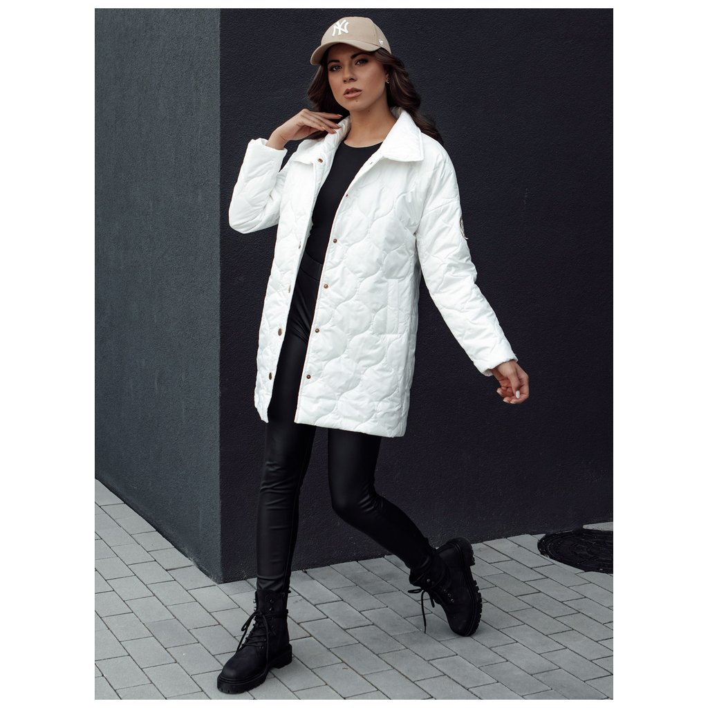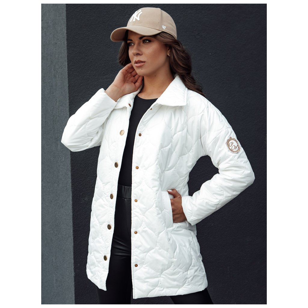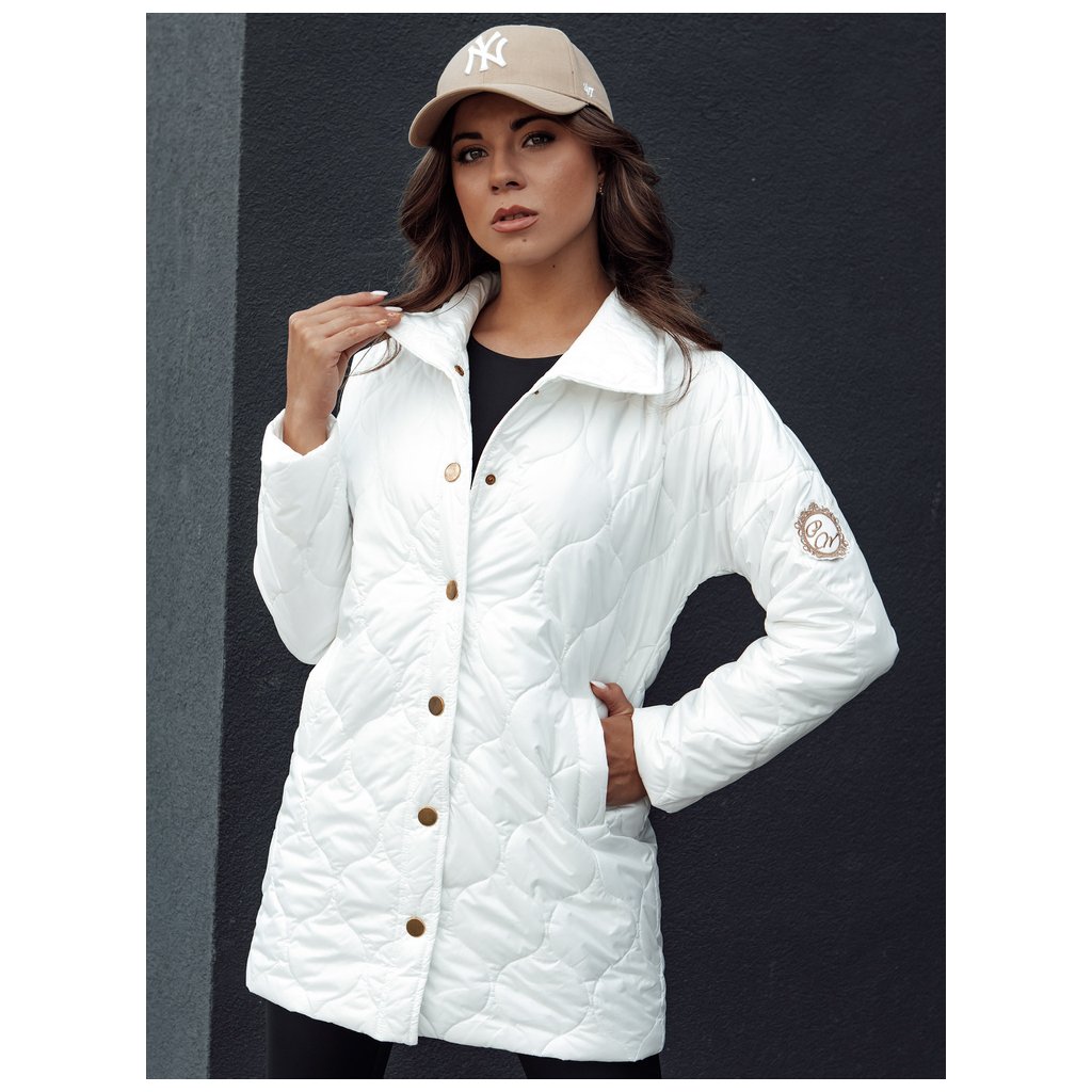 Táto dlhšia prešívaná bunda má výrazný golier a je vyrobená z mäkkej látky. Má vrecká v páse a zapínanie na ozdobné cvoky. Na rukáve je ozdobná nášivka. K dispozícii v troch farbách.