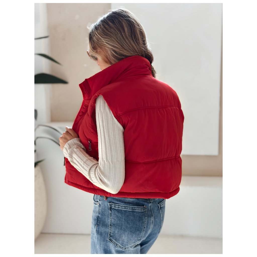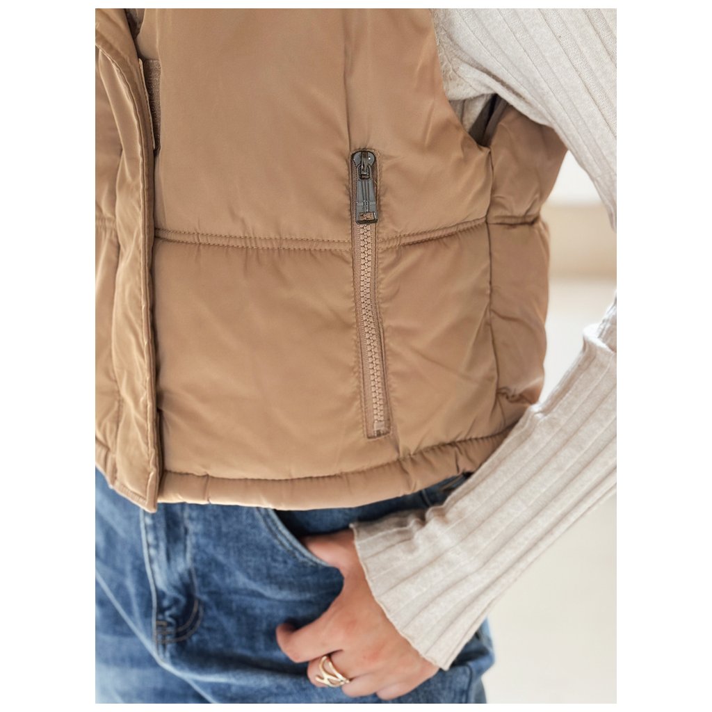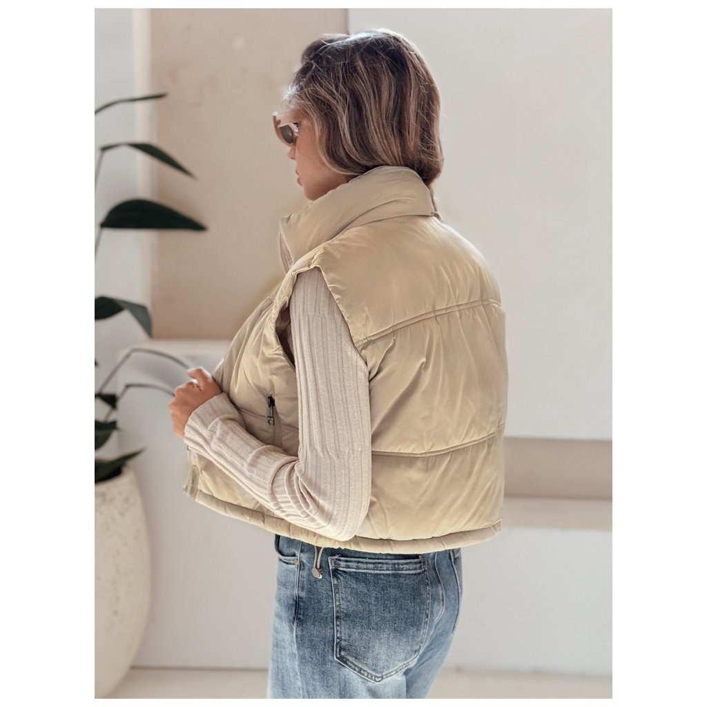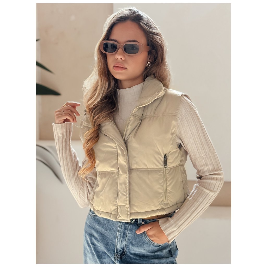 Krátka prešívaná vesta s vysokým golierom je všestranný kúsok, ideálny pre prechodné ročné obdobia. Minimalistický strih ponúka množstvo možností stylingu a praktické detaily prispievajú k pohodliu.