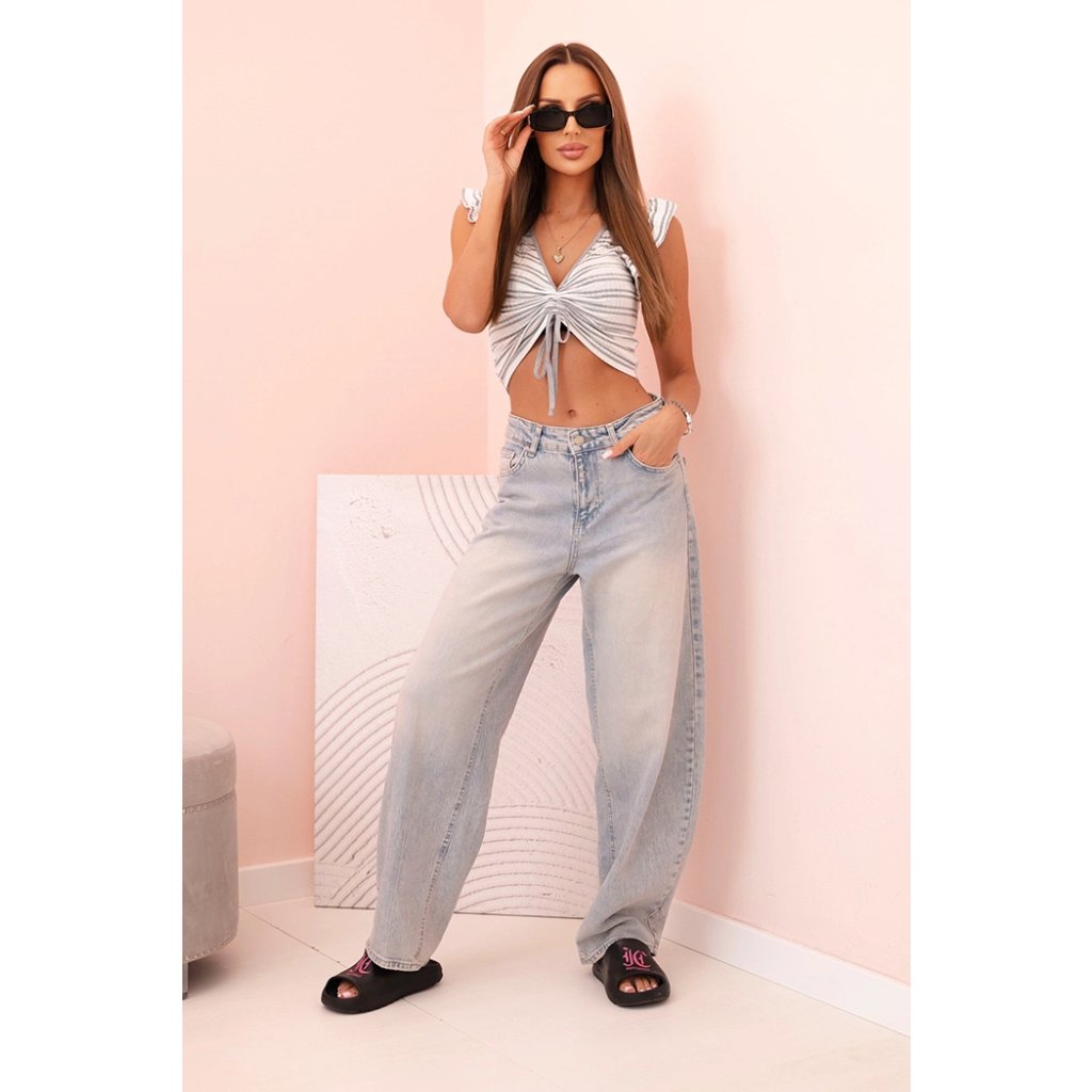 Rozkošná dámska blúzka z rebrovanej tkaniny je skvelou voľbou na teplejšie dni. Model s krátkym rukávom zakončeným ozdobnou volánikovou lemovkou a výstrihom do V podčiarkuje ženskú siluetu a dodáva dievčenský pôvab. Charakteristické nariasenie vpredu s viazaním umožňuje jemne regulovať dĺžku, prispôsobujúci strih vašej postave.