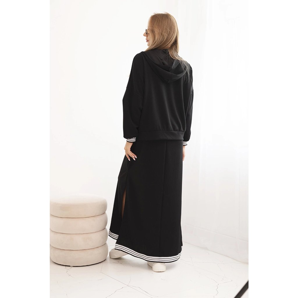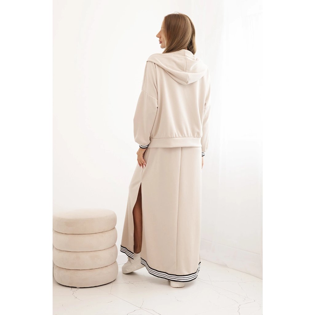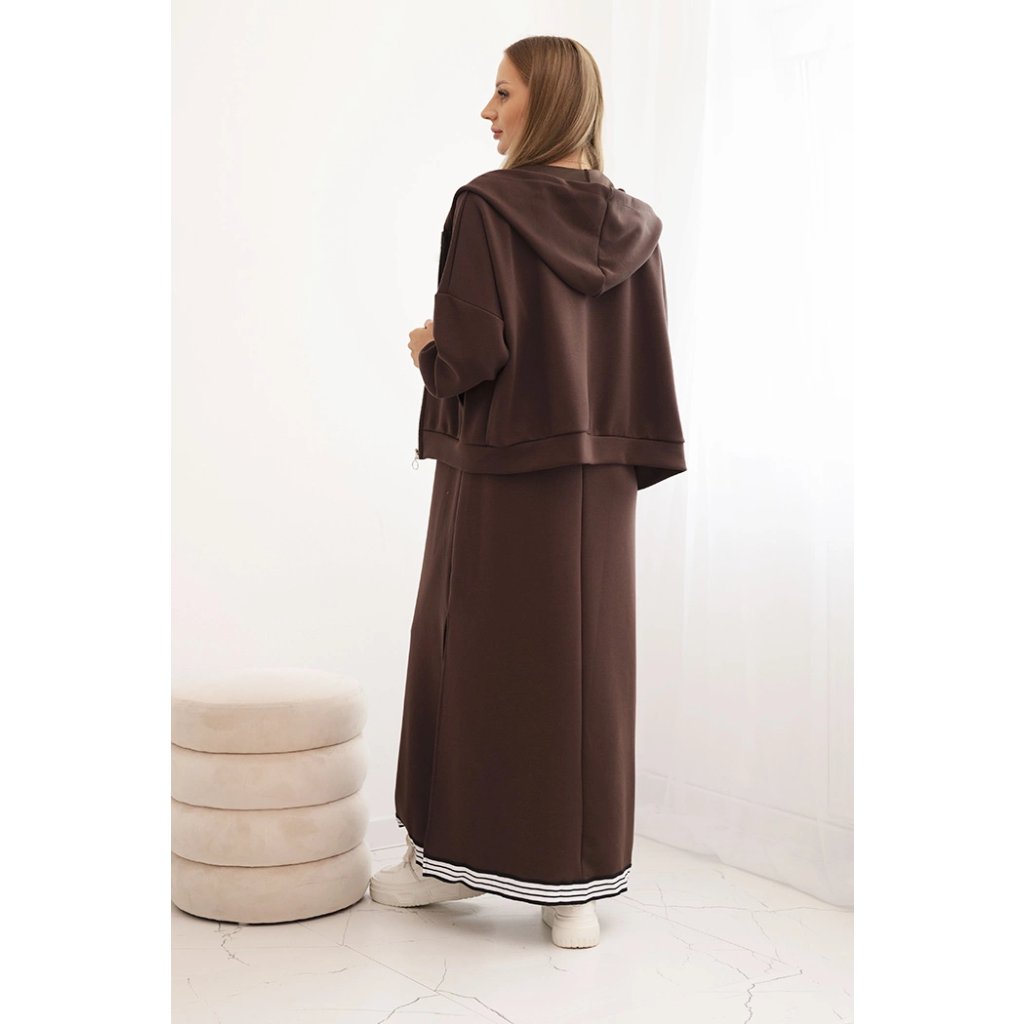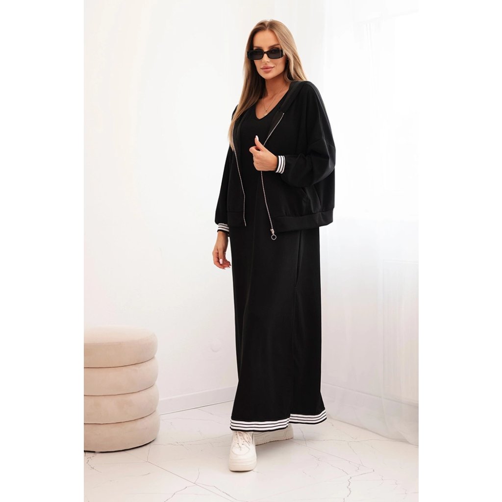 Pohodlný a módny dámsky komplet z viskózy, ktorý sa skladá z dlhých šiat a krátkej mikiny s kapucňou a zipsom. Šaty majú jednoduchý strih s jemne rozšíreným spodným lemom, vďaka čomu sa skvele prispôsobujú postave. Mikina s praktickými vreckami a kontrastnými nápletmi dodáva športový charakter a robí, že súprava vyzerá moderne a uvoľnene.