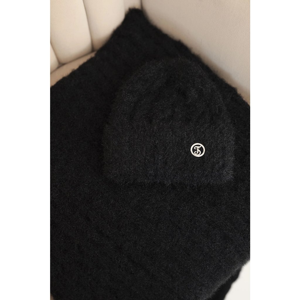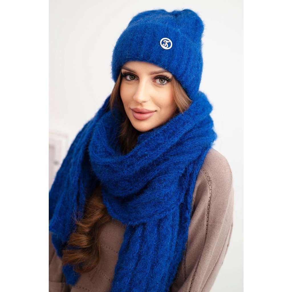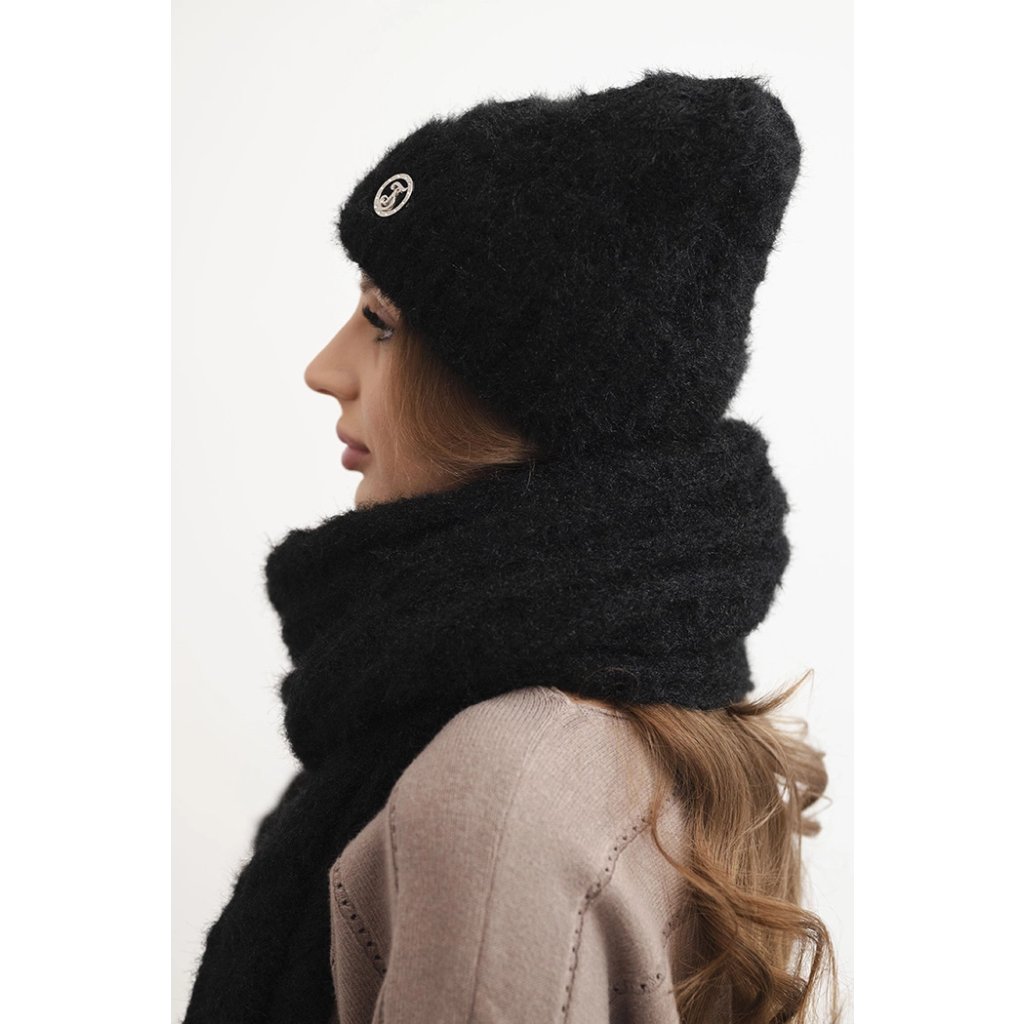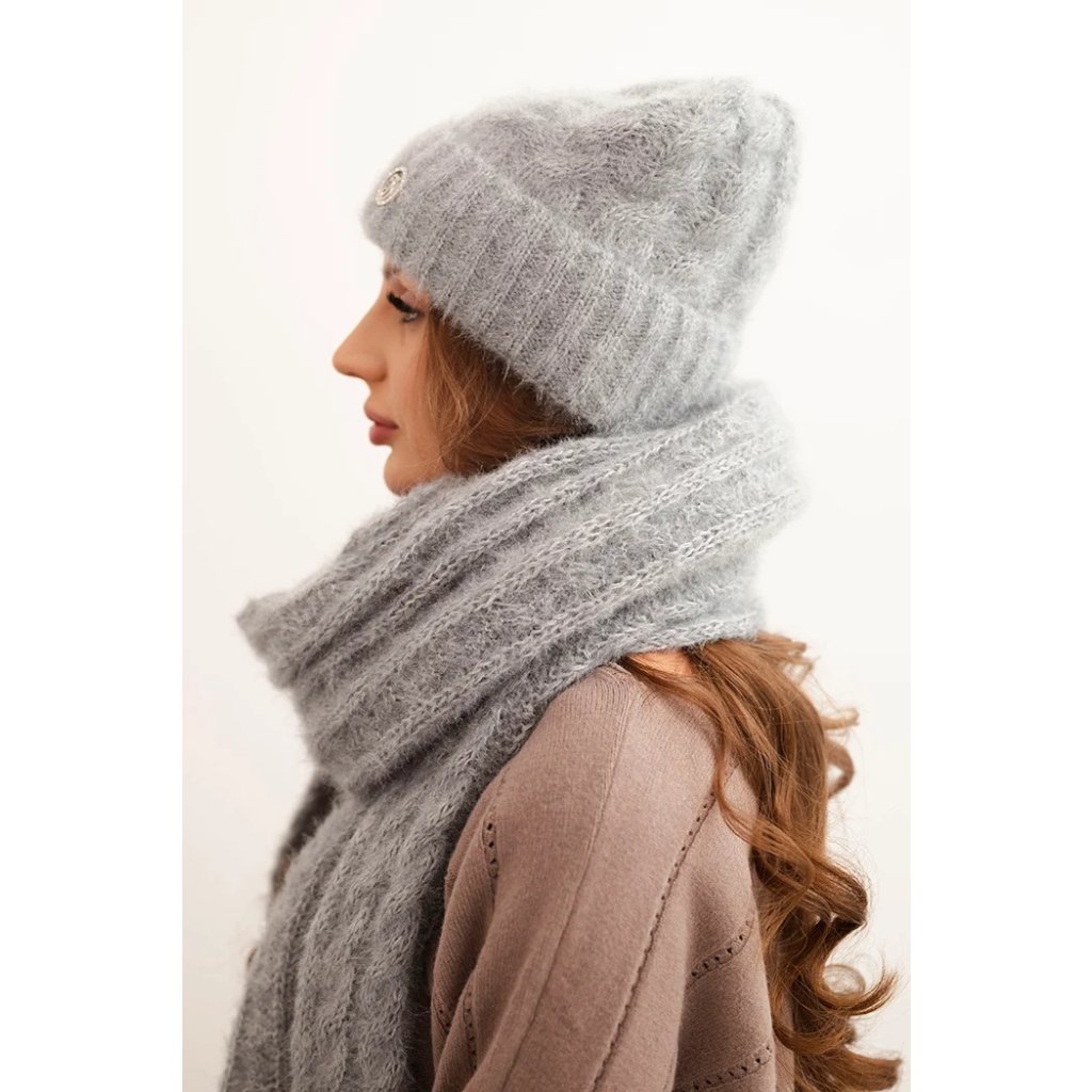 Čiapka má klasický strih s módnym ohnutím a zlatou ozdobou vpredu, ktorá dodáva celku eleganciu. Šál je dlhý a široký – dá sa voľne omotať okolo krku, čo zabezpečuje dodatočnú ochranu pred zimou.