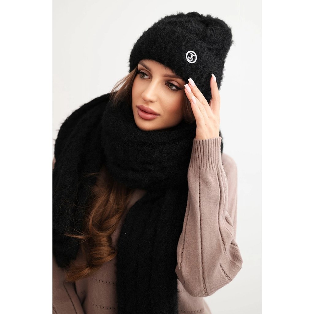 Čiapka má klasický strih s módnym ohnutím a zlatou ozdobou vpredu, ktorá dodáva celku eleganciu. Šál je dlhý a široký – dá sa voľne omotať okolo krku, čo zabezpečuje dodatočnú ochranu pred zimou.