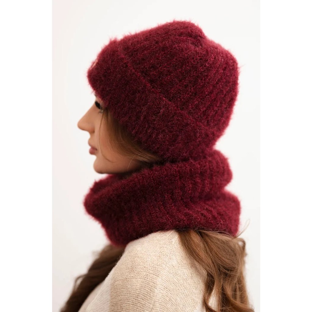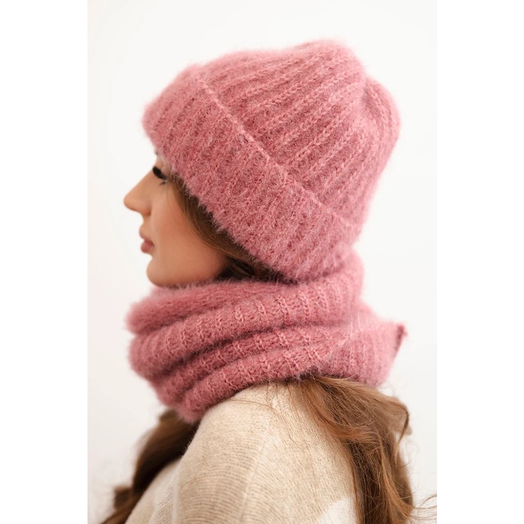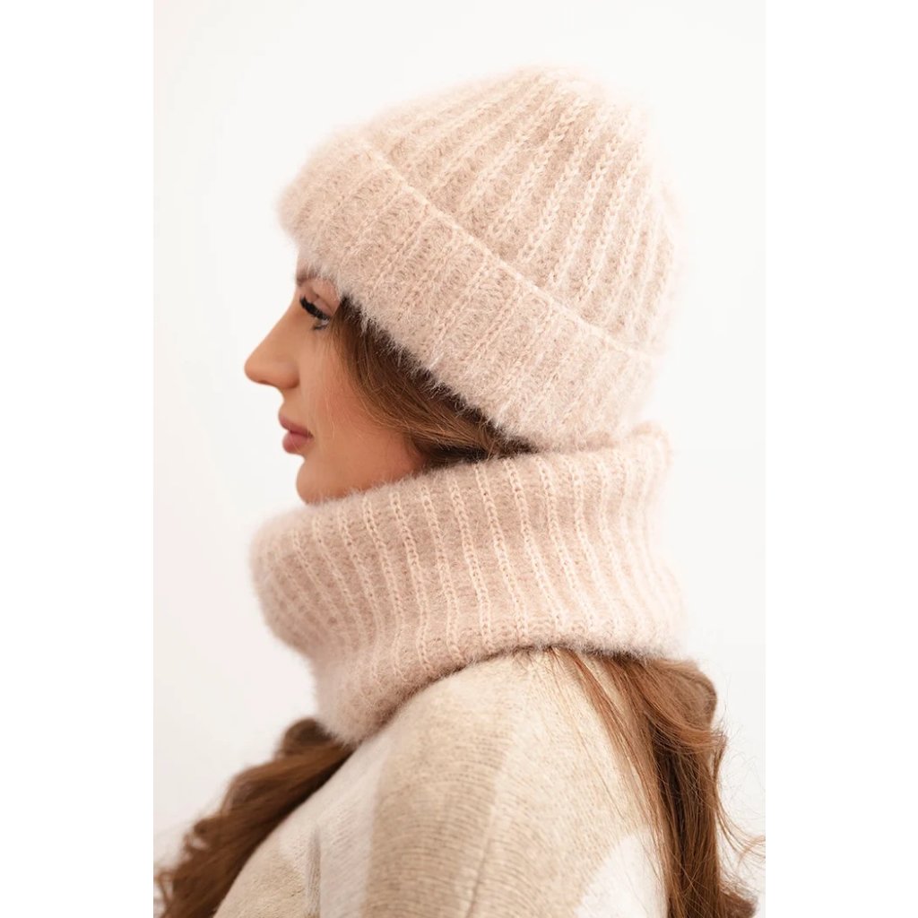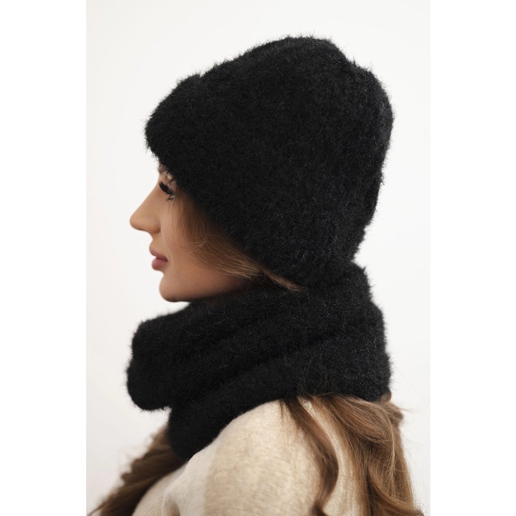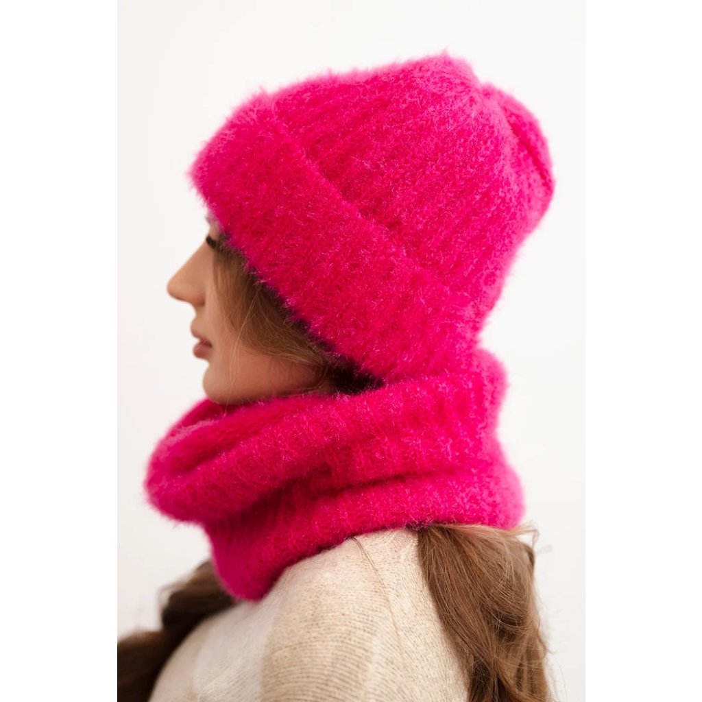 Súprava pozostávajúca z čiapky a nákrčníka, vyrobená z nadýchanej a mäkkej pleteniny s príjemnou štruktúrou. Materiál je elastický a dobre sa prispôsobuje hlave a krku, poskytujúc komfort a teplo v chladných dňoch.