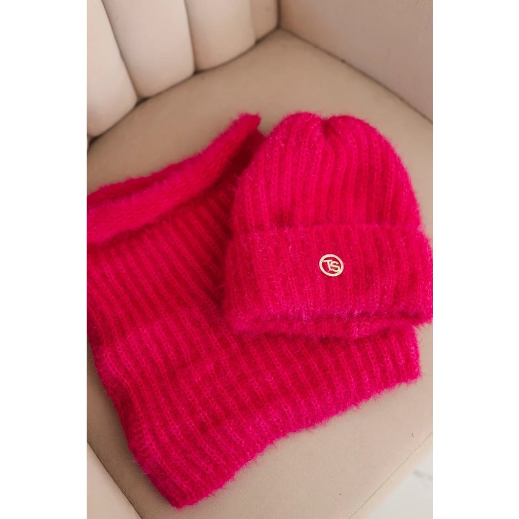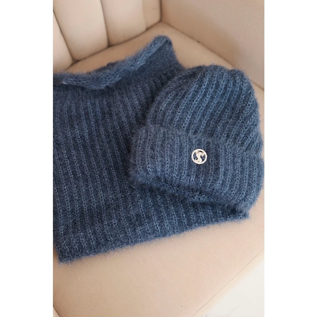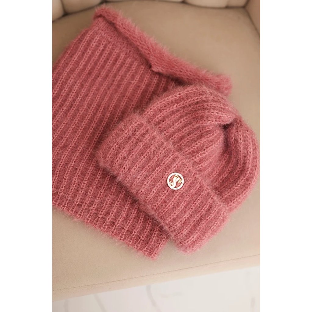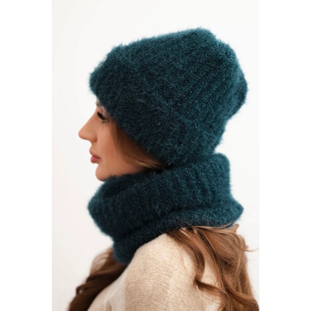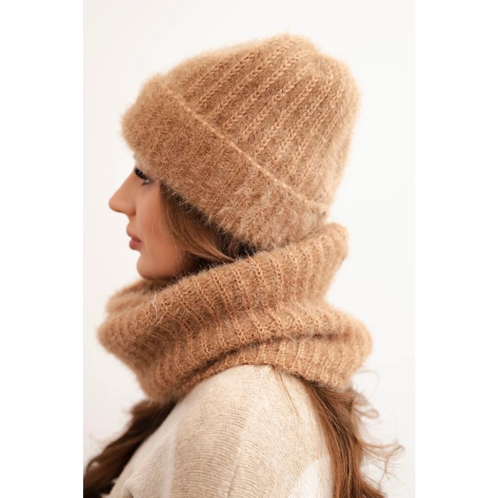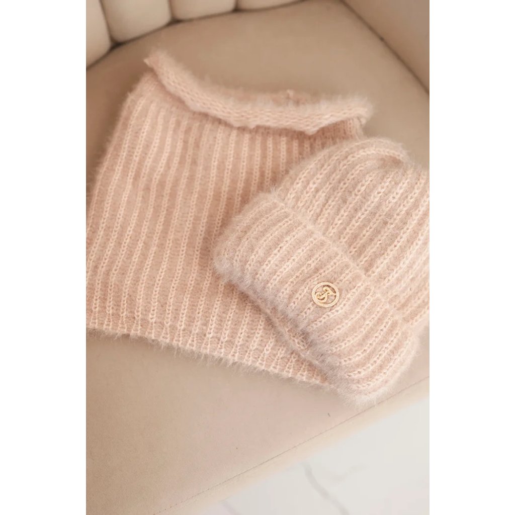 Súprava pozostávajúca z čiapky a nákrčníka, vyrobená z nadýchanej a mäkkej pleteniny s príjemnou štruktúrou. Materiál je elastický a dobre sa prispôsobuje hlave a krku, poskytujúc komfort a teplo v chladných dňoch.