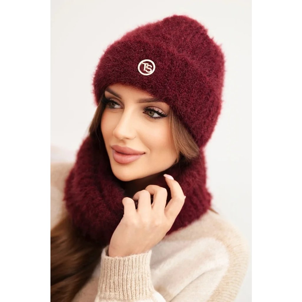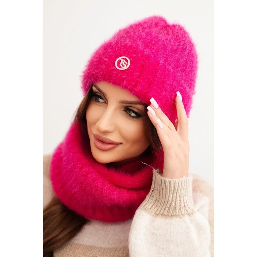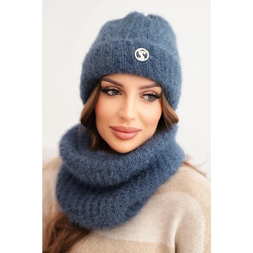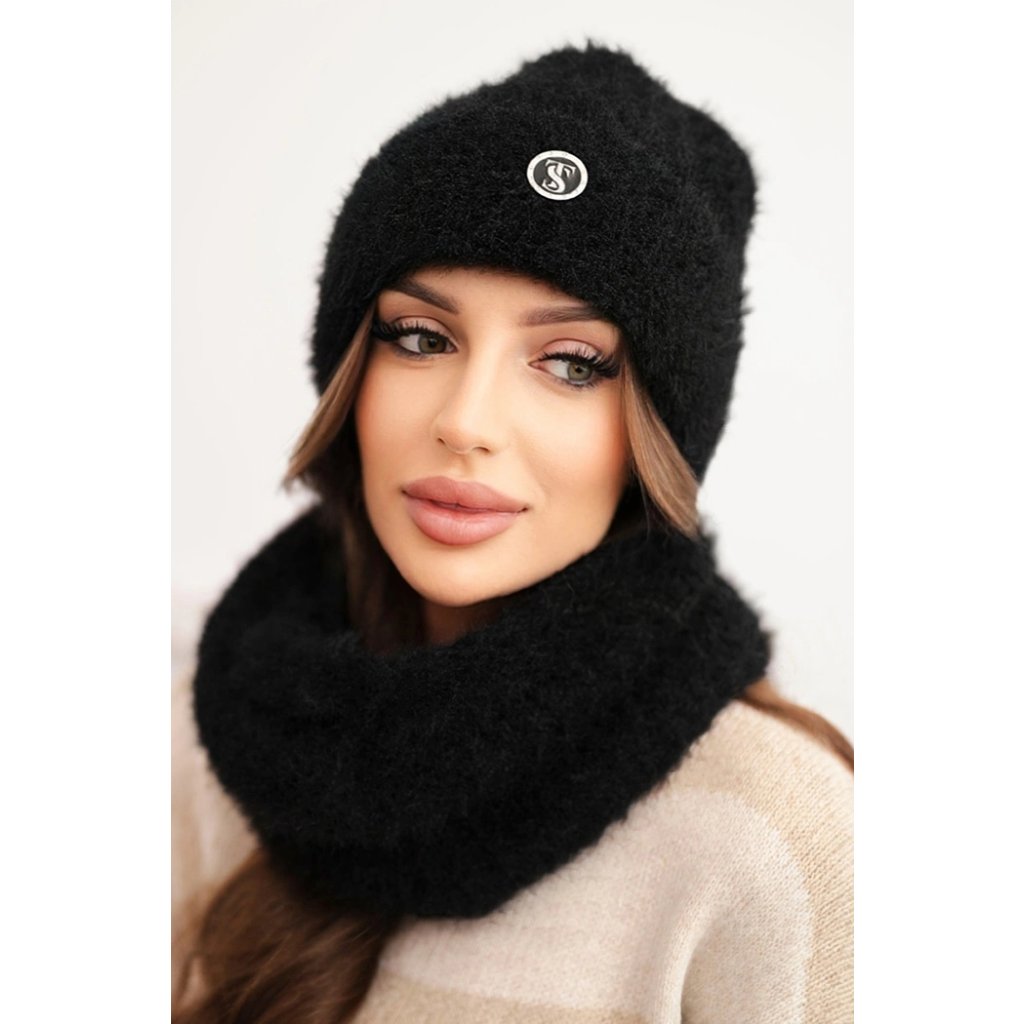 Dámska súprava čiapky a šálu zimná nadýchaná s ozdobným emblémom