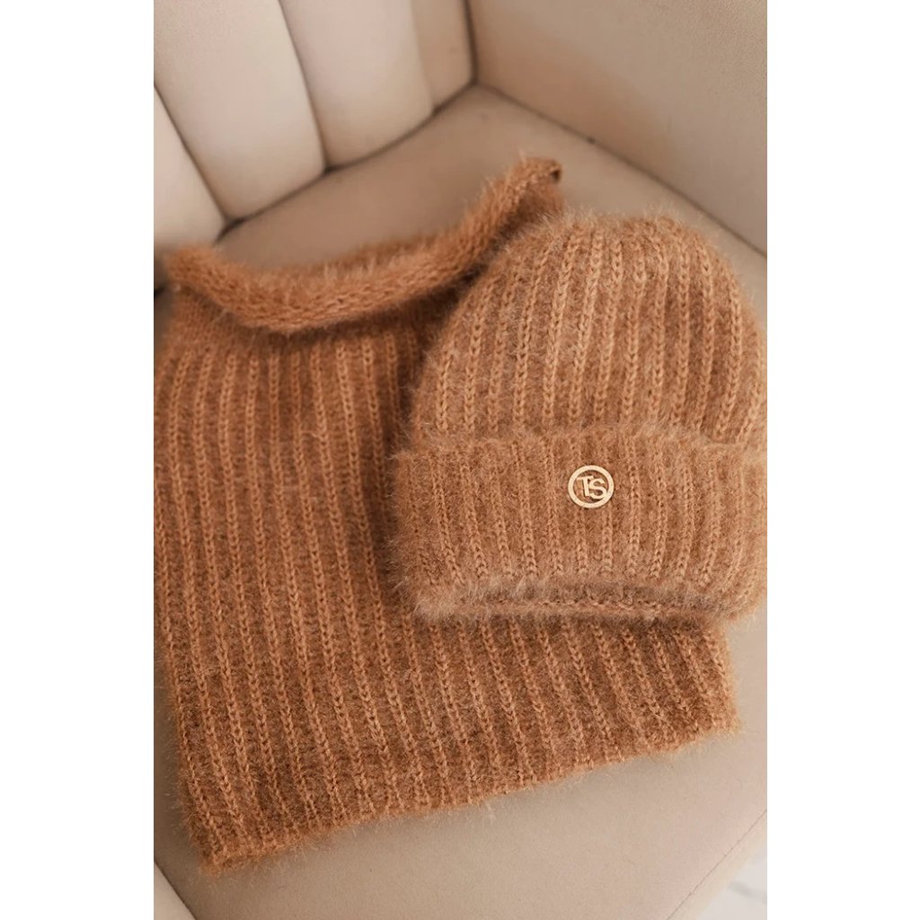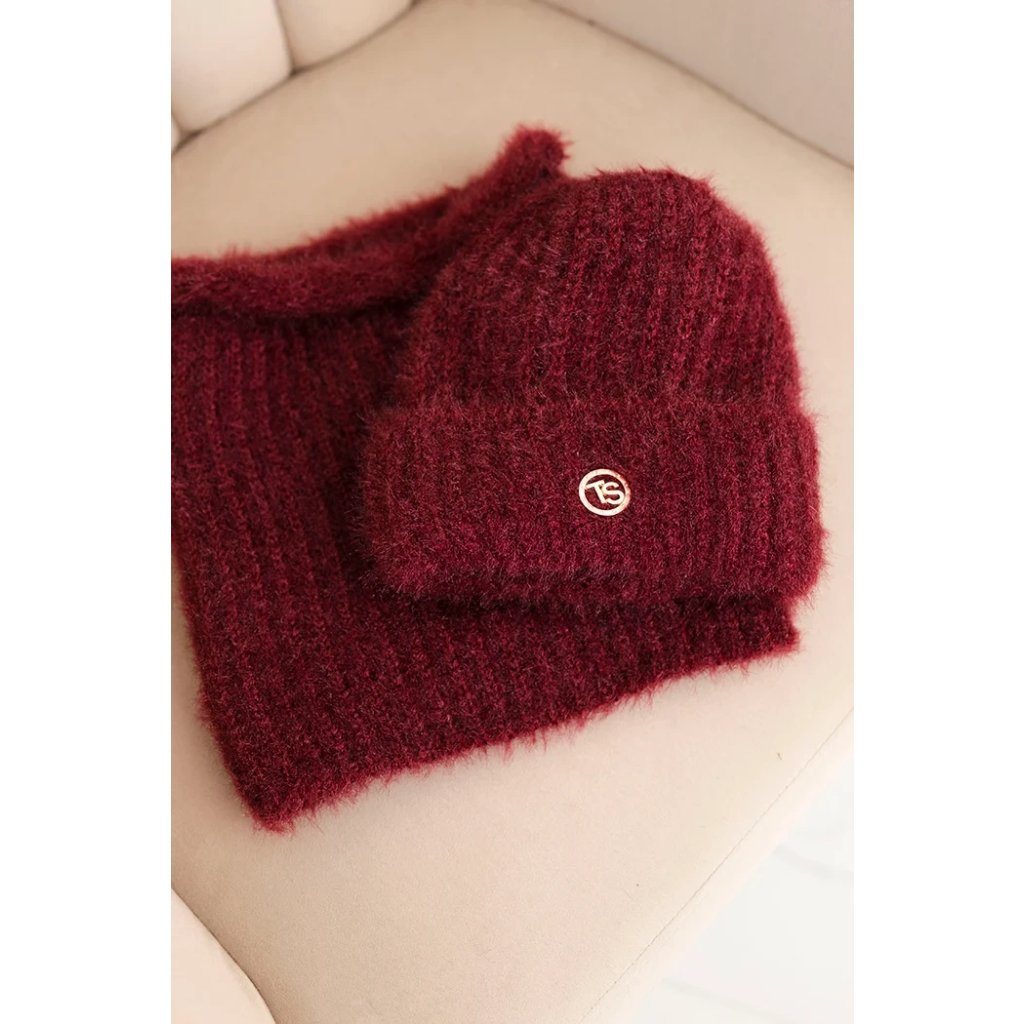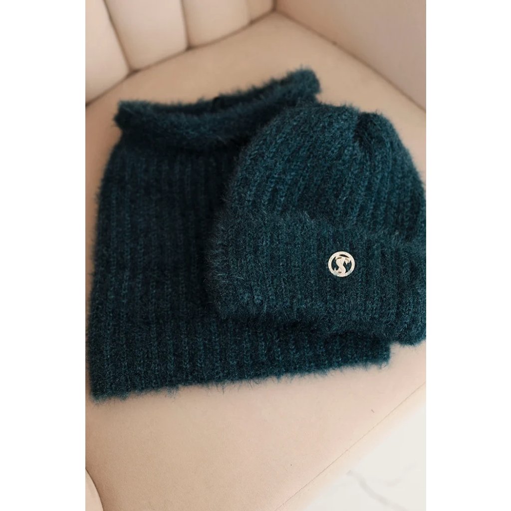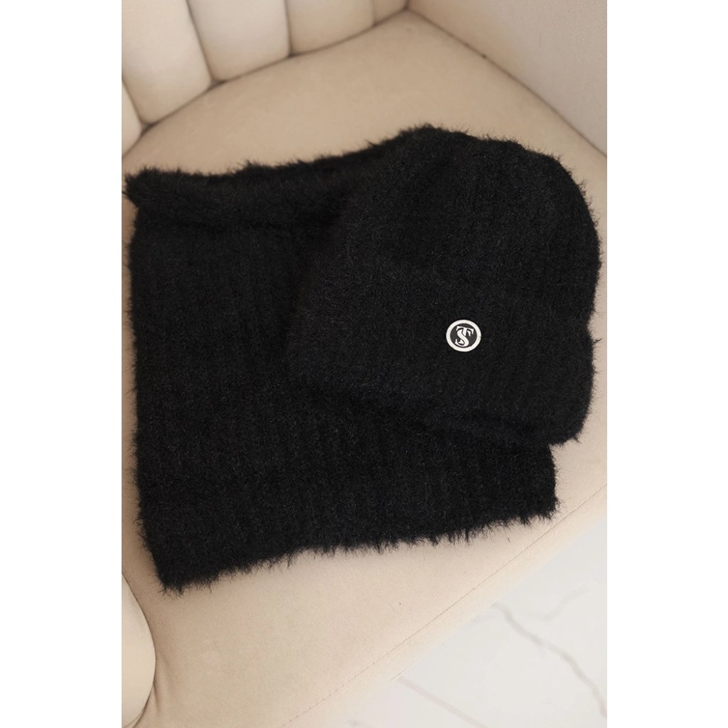 Dámska súprava čiapky a šálu zimná nadýchaná s ozdobným emblémom