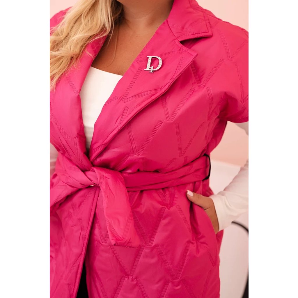 Štýlová, prešívaná dámska vesta s opaskom je ponukou pre ženy, ktoré si cenia eleganciu spojenú s pohodlím. Model s klasickým golierom a dekoratívnou brošňou „D” krásne zvýrazňuje siluetu vďaka priloženému opasku, ktorý je možné regulovať v páse. Prešívaný materiál s geometrickým vzorom dodáva celku moderný charakter a dĺžka po kolená zaisťuje ochranu a komfort v chladnejších dňoch.
