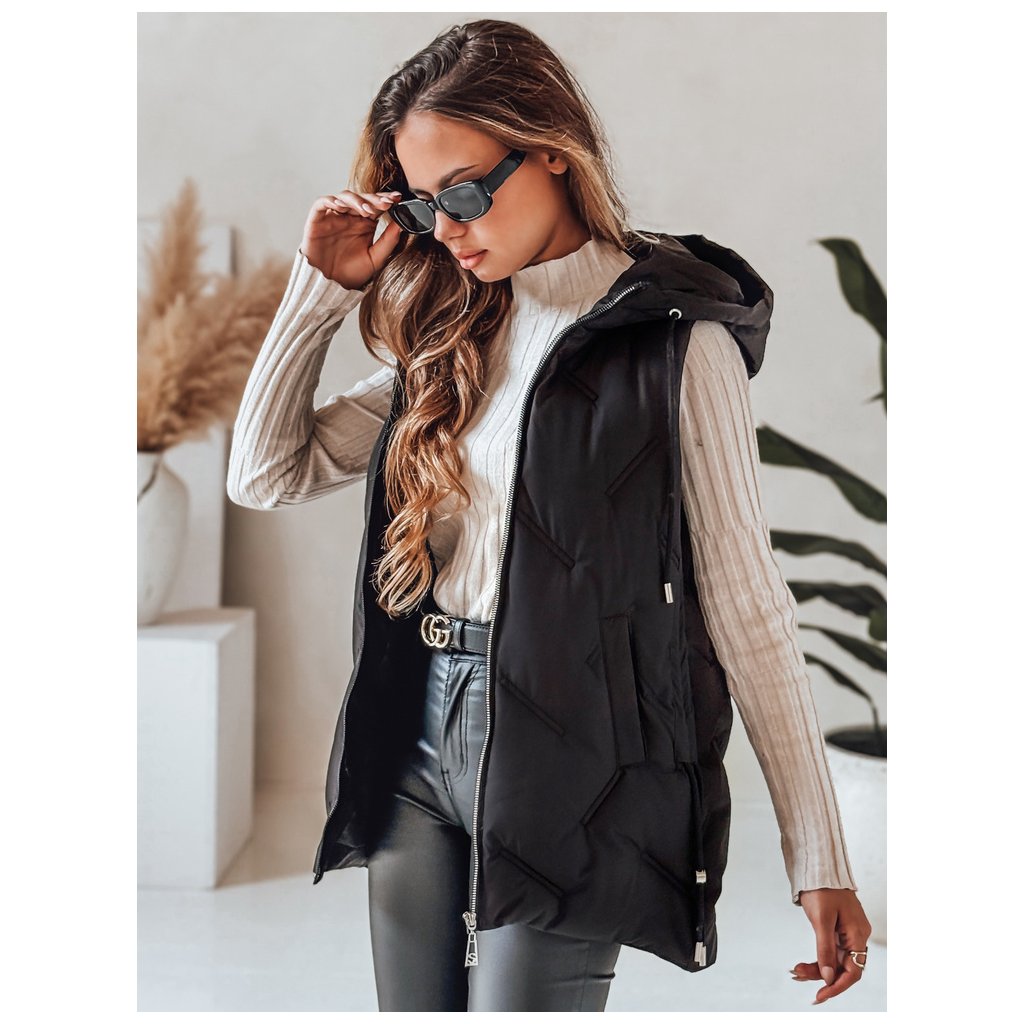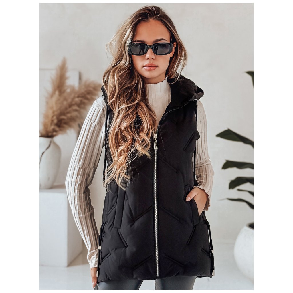 Dámska vesta. Zapínanie na zips. Pevná kapucňa. Dve vonkajšie vrecká. Sťahovacie šnúrky po stranách a na kapucni. Farba: Čierna. Zloženie: 100% polyester. Miery modelky: