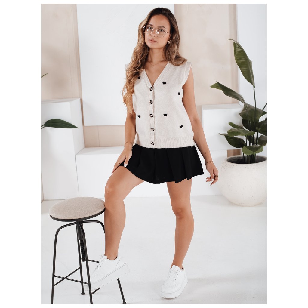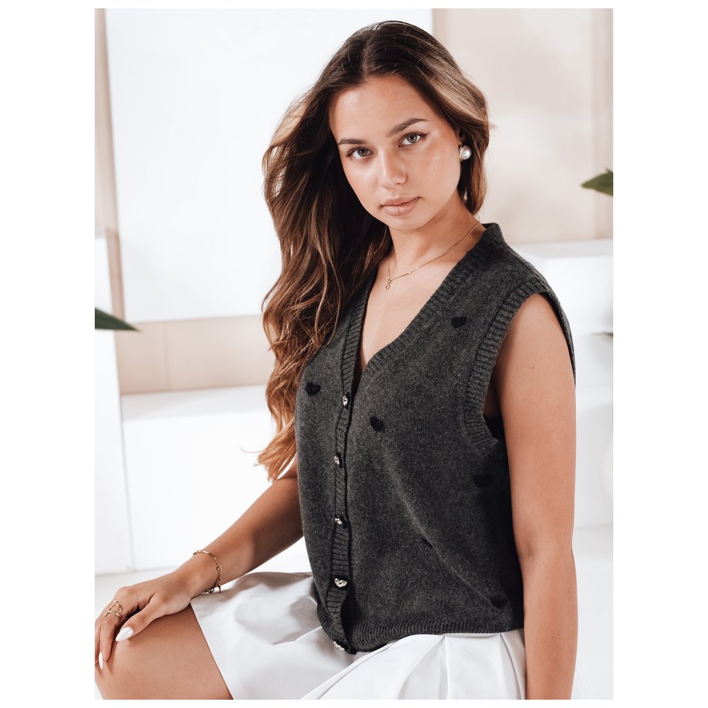 Tento sveter bez rukávov s výstrihom do V a ozdobnými gombíkmi v tvare srdca je ženský kúsok s mäkkou pletenou štruktúrou. Ľahká tkanina s nádychom viskózy zaisťuje pohodlie a lichotivý strih. Ideálne na nosenie samostatne alebo ako vrstva cez košeľu.