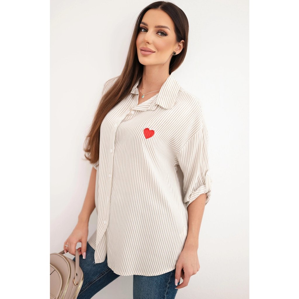 Táto dámska košeľa je ideálnou kombináciou klasiky a dievčenského šarmu! Vyrobená z vysoko kvalitnej bavlny s prídavkom elastanu, zaisťuje nielen pohodlie pri nosení, ale aj krásne sedenie na postave. Subtílny pruhovaný vzor a vyšívané červené srdiečko na prsiach jej dodávajú originalitu a ľahkosť.