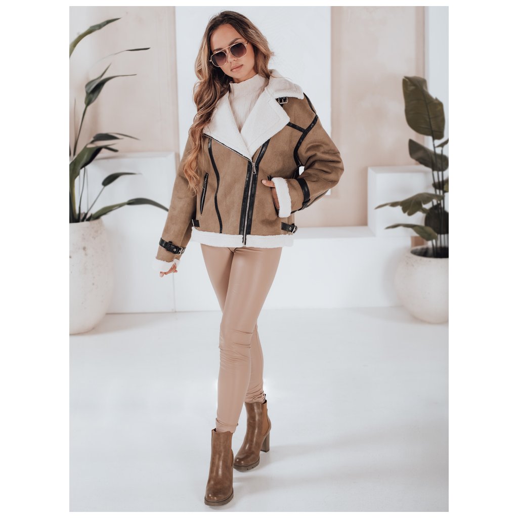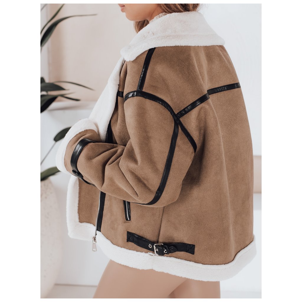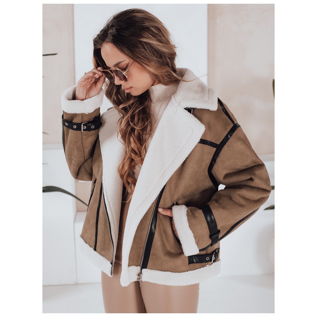 Tento módny, voľný strih kabáta z ovčej kože je perfektnou voľbou pre chladné dni. Semišová textúra a kontrastná kožušina dodávajú kabátu charakter, zatiaľ čo pruhované detaily podčiarkujú jeho moderný vzhľad.
