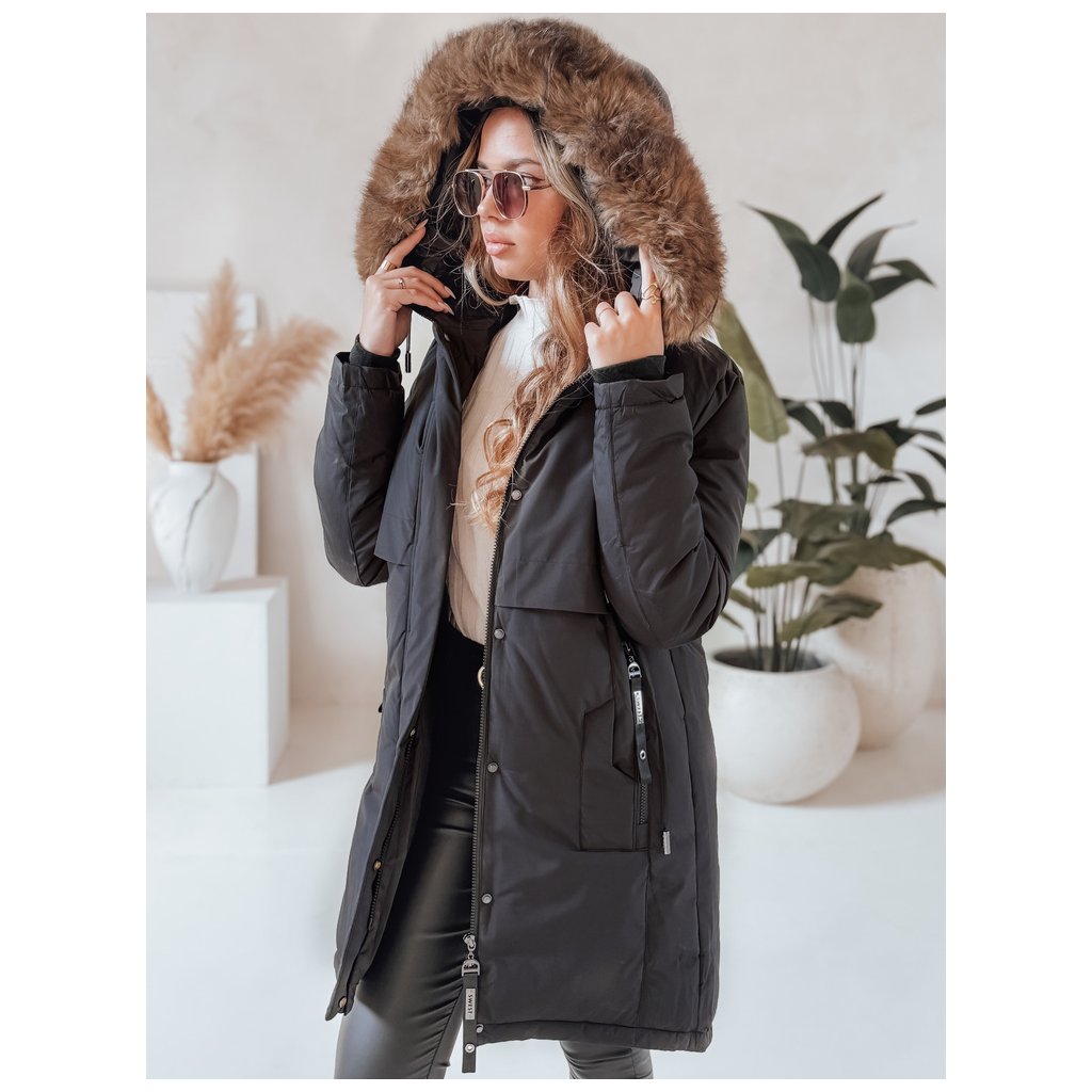 - Dámska zimná bunda. Zapínanie na zips a cvok. Pevná kapucňa. Odnímateľný kožušinový lem. Dve vonkajšie vrecká na zips. Sťahovacia šnúrka v páse. Farba: Čierna. Zloženie: 100% polyester. Miery modelky: