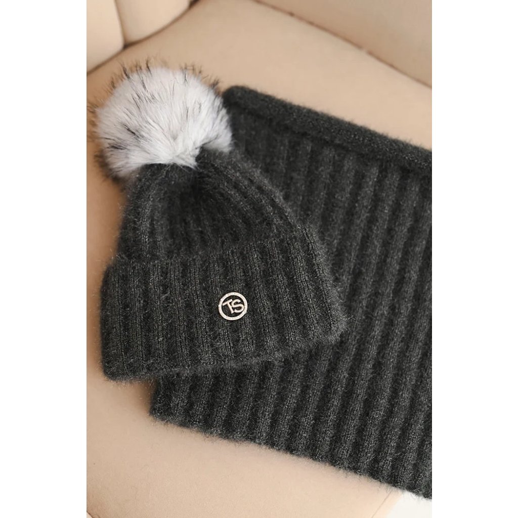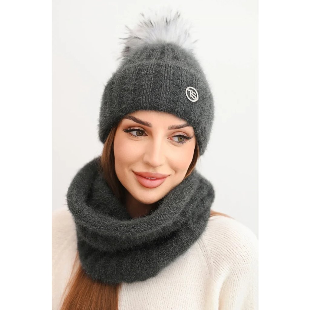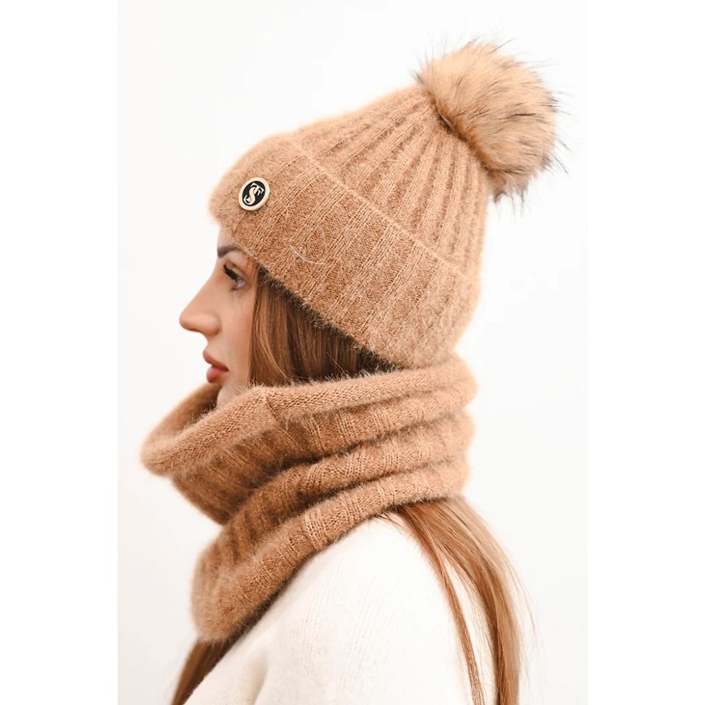Štýlová a praktická zimná súprava pre ženy – čiapka s efektným veľkým brmbolcom a mäkký nákrčník. Vyrobené z príjemného na dotyk, nadýchaného úpletu s jemným leskom. Zaisťuje tepelný komfort a módny vzhľad v chladných dňoch.