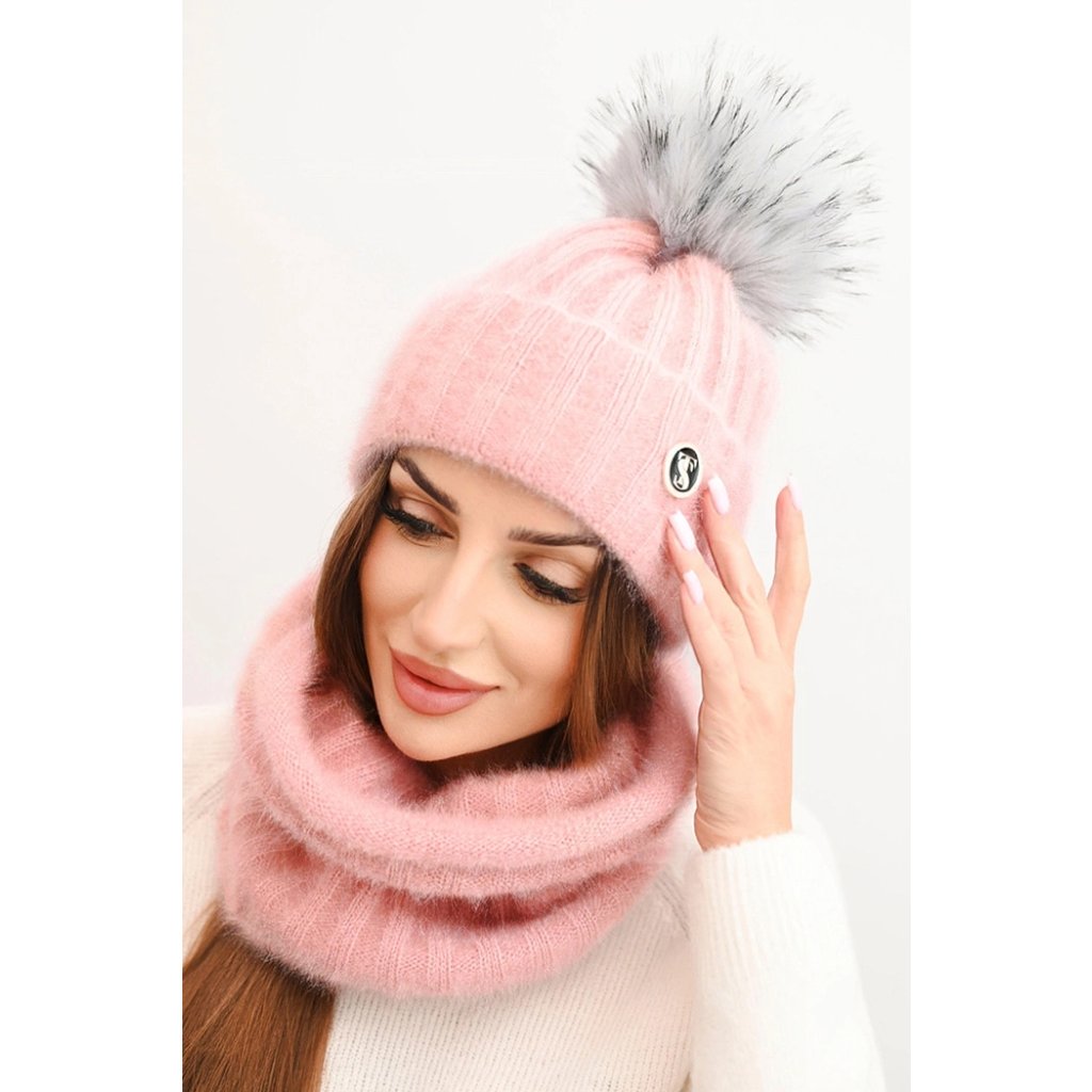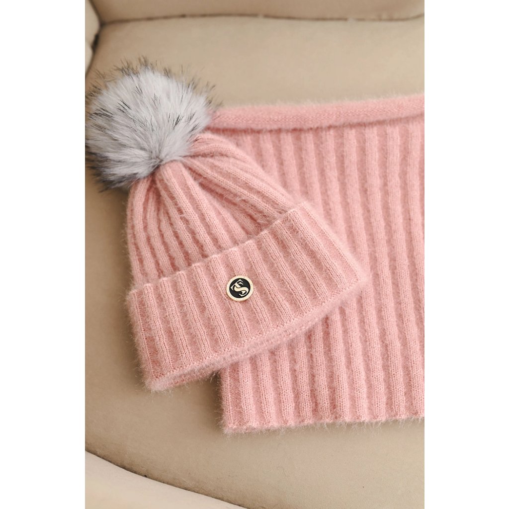 Štýlová a praktická zimná súprava pre ženy – čiapka s efektným veľkým brmbolcom a mäkký nákrčník. Vyrobené z príjemného na dotyk, nadýchaného úpletu s jemným leskom. Zaisťuje tepelný komfort a módny vzhľad v chladných dňoch.