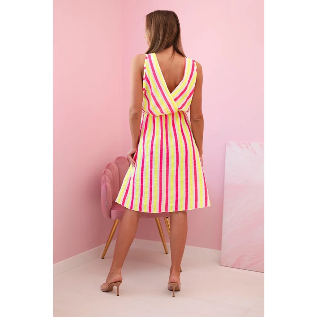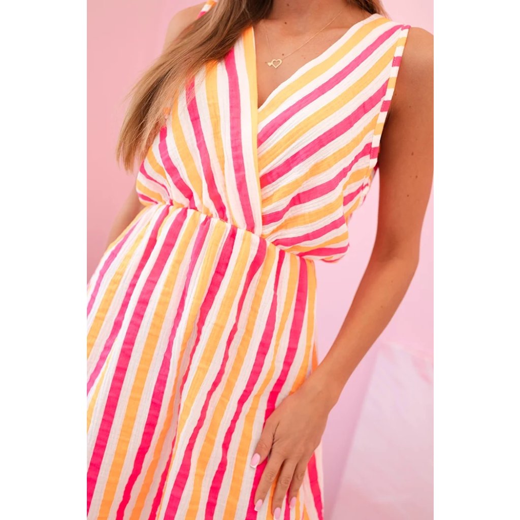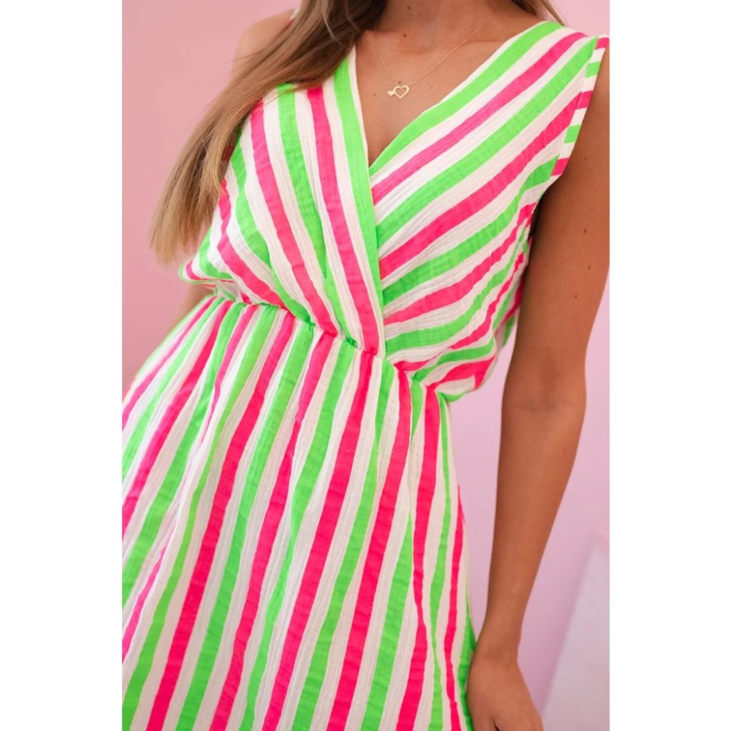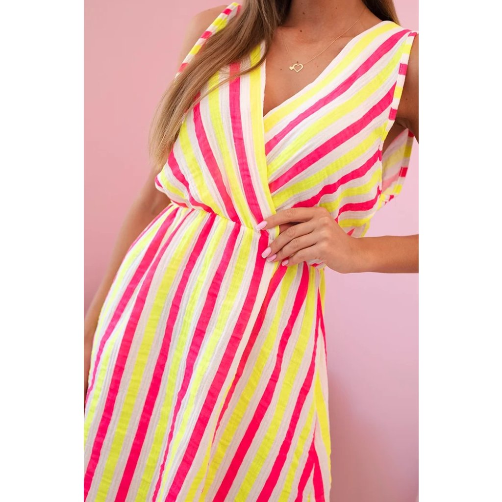 Tieto dámske šaty s farebnými pruhmi sú ideálnou voľbou na teplé letné dni. Ušité zo 100% prírodnej bavlny poskytujú nielen priedušnosť, ale aj vysoký komfort nosenia. Prekladaný výstrih krásne zvýrazní poprsie a mierne rozšírený spodný diel dodá postave ľahkosť a dievčenský pôvab. Šaty sú skvelé na každodenné nosenie, prechádzku po pláži, letné stretnutie s priateľmi alebo dovolenku. Voľný strih a elastický pás zaisťujú pohodlie a prispôsobenie rôznym postavám. Zvislé pruhy v energetických farbách opticky zoštíhľujú postavu a priťahujú pohľady.