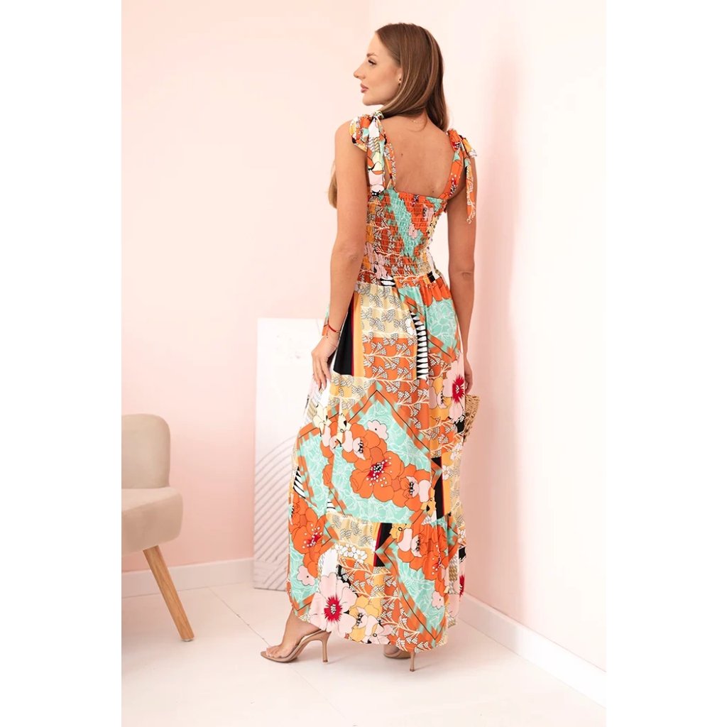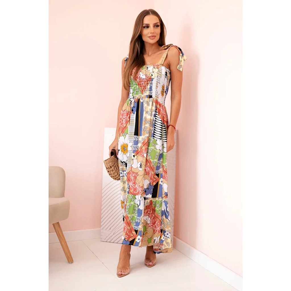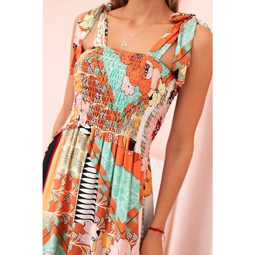 Výnimočné dámske maxi šaty so širokými zaväzovacími ramienkami sú ideálnou voľbou na slnečné dni! Zaujmú pestrou kvetinovou potlačou, ktorá priťahuje pozornosť a dodáva letný nádych každému outfitu. Horná časť šiat je zakončená elastickým riasením, vďaka čomu sa perfektne prispôsobí postave a zaisťuje pohodlie aj skvelý vzhľad. Dlhá, voľne splývajúca sukňa dodáva ľahkosť a krásne sa pohybuje pri chôdzi. Skvelé na dovolenku, prechádzky po pláži, záhradné párty alebo letné stretnutia s priateľmi.