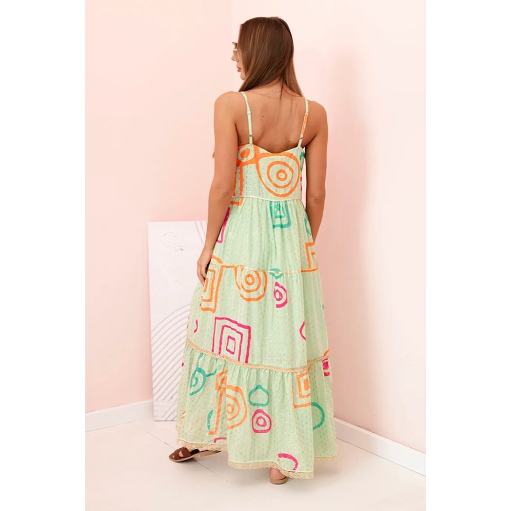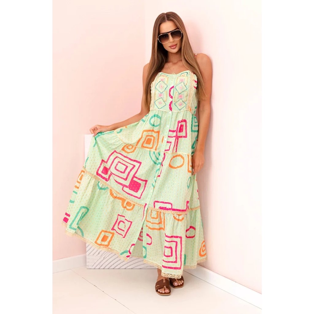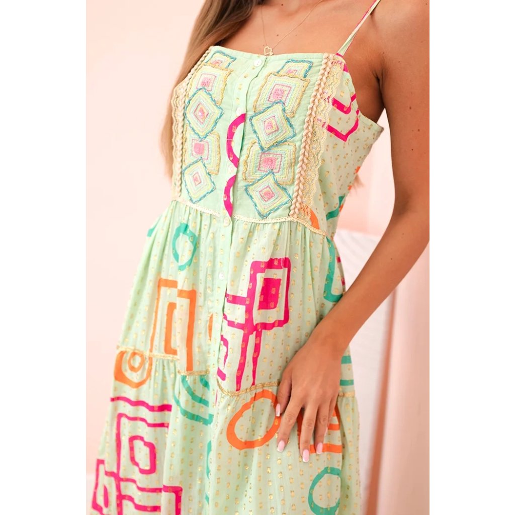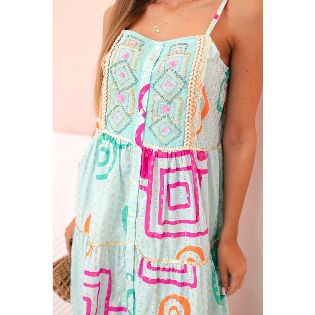 Tieto dámske šaty na ramienka sú ideálnou voľbou na letné dni, keď chcete vyzerať štýlovo a cítiť sa pohodlne. Vyrobené zo 100 % ľahkej, priedušnej bavlny, očaria farebným geometrickým vzorom v štýle boho a jemnou výšivkou v hornej časti. Ľahko rozšírený strih dodáva postave ľahkosť a tenké ramienka odhaľujú ramená, čo z nich robí perfektnú voľbu na dovolenku, prechádzky alebo letné stretnutia s priateľmi.