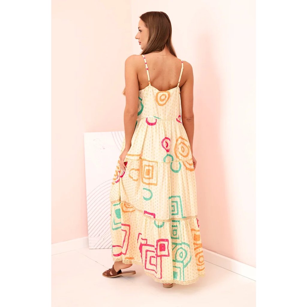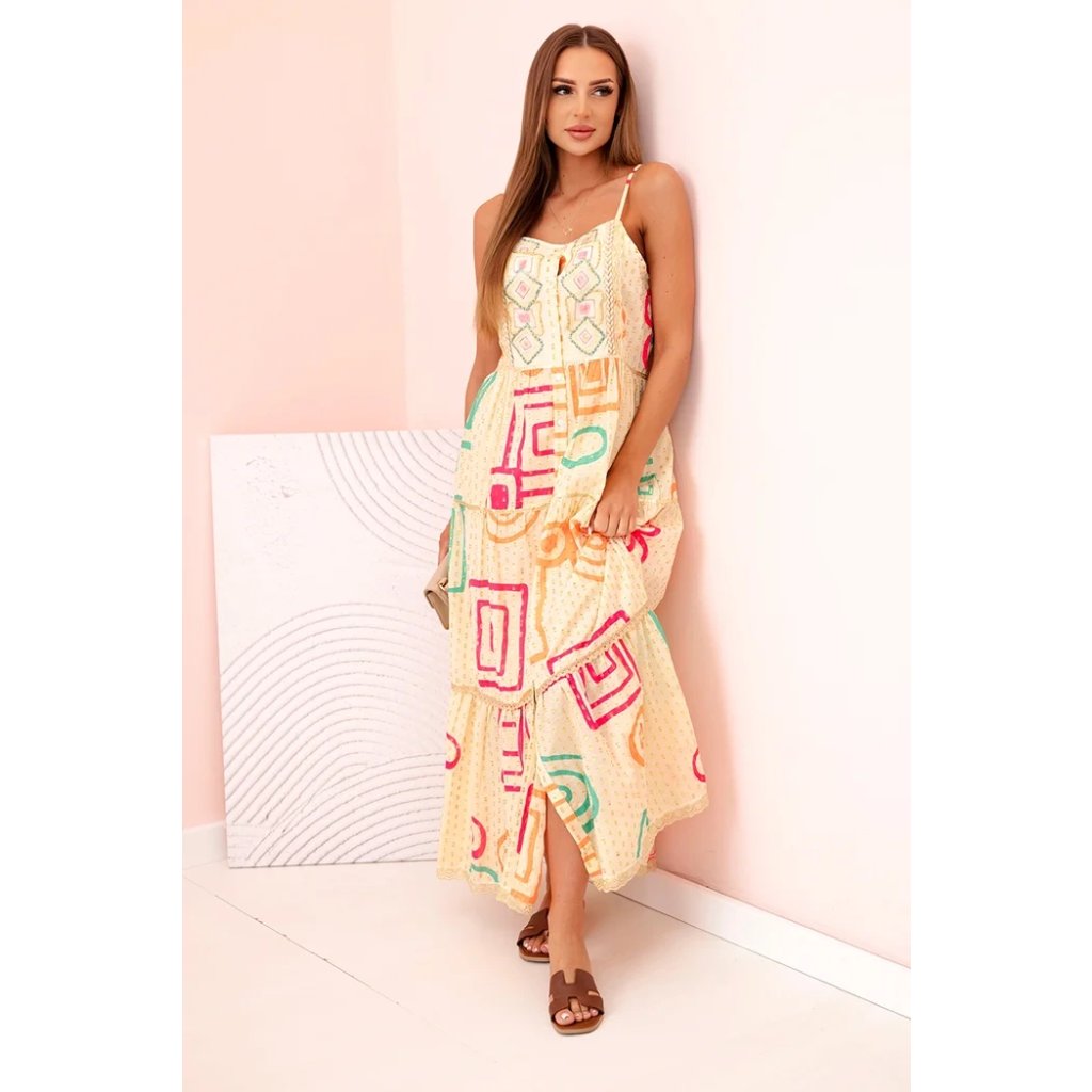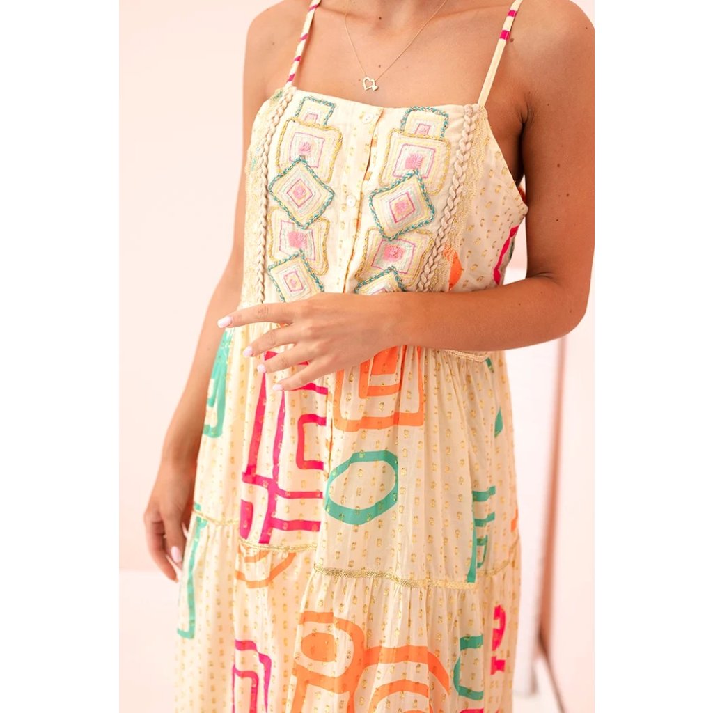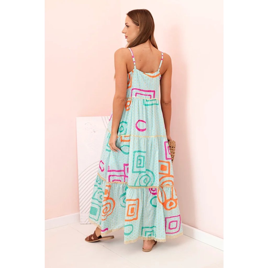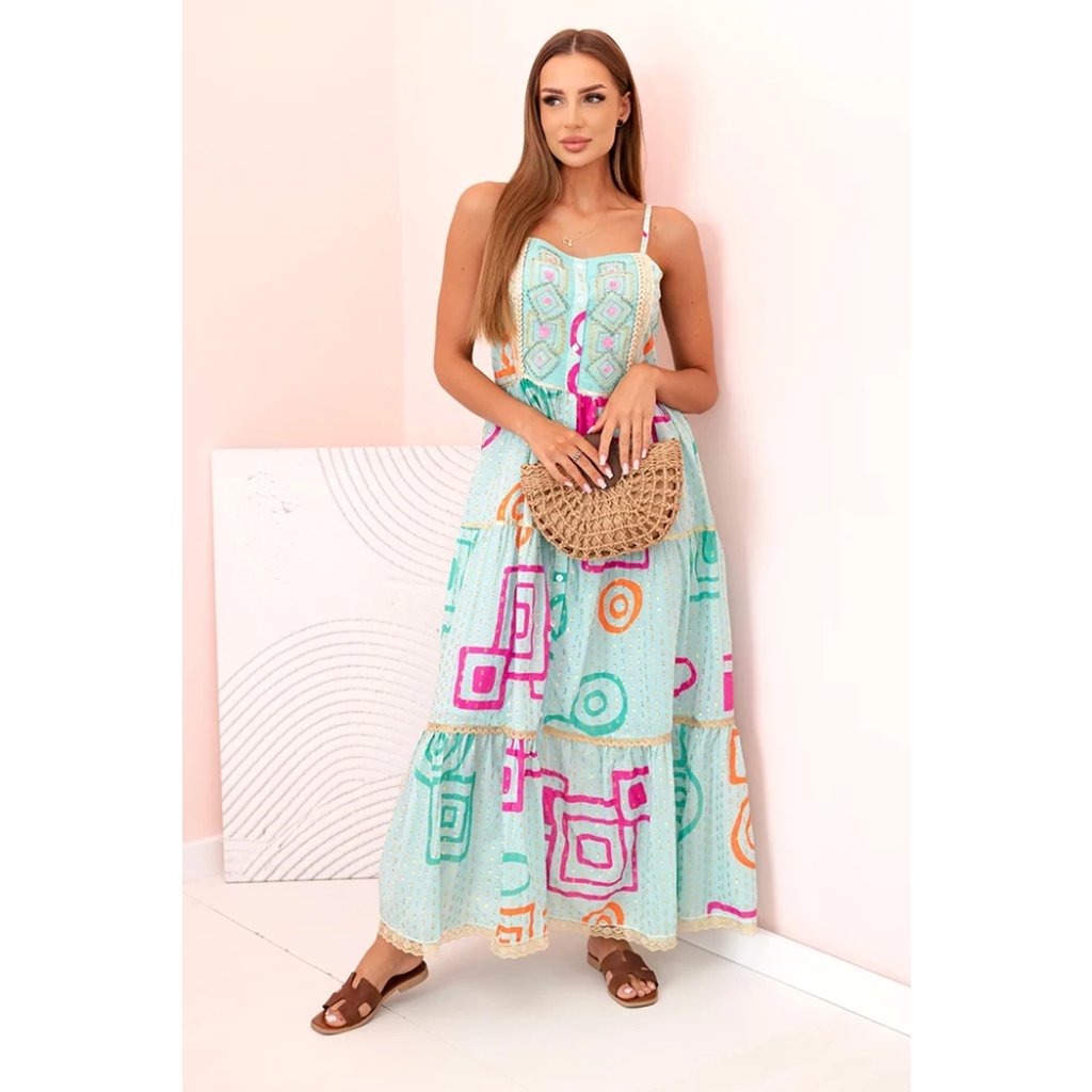 Tieto dámske šaty na ramienka sú ideálnou voľbou na letné dni, keď chcete vyzerať štýlovo a cítiť sa pohodlne. Vyrobené zo 100 % ľahkej, priedušnej bavlny, očaria farebným geometrickým vzorom v štýle boho a jemnou výšivkou v hornej časti. Ľahko rozšírený strih dodáva postave ľahkosť a tenké ramienka odhaľujú ramená, čo z nich robí perfektnú voľbu na dovolenku, prechádzky alebo letné stretnutia s priateľmi.