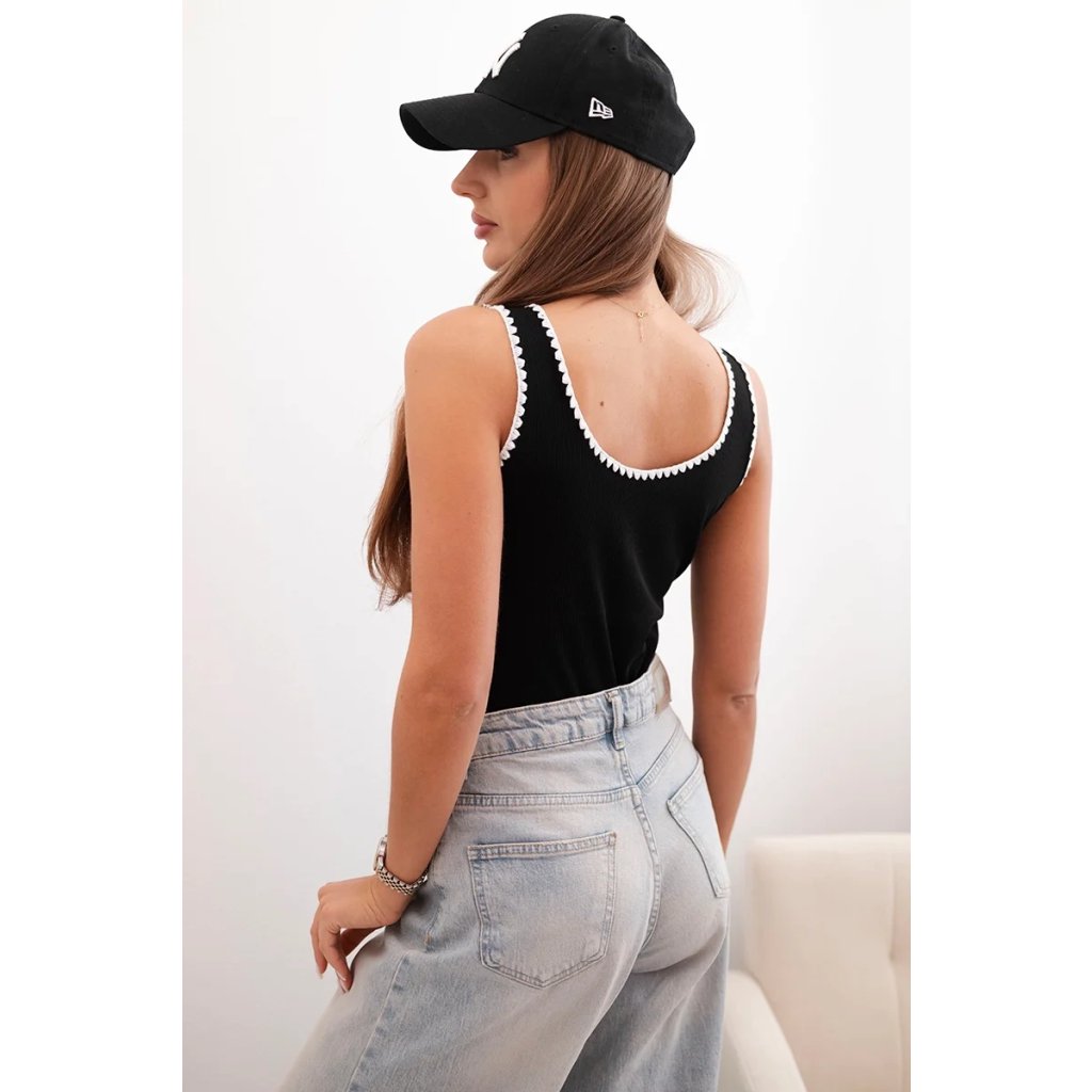 Štýlové dámske body z mäkkého a elastického materiálu s jemnou rebrovanou štruktúrou. Model so širokými ramienkami, zaobleným výstrihom a jemnými ozdobnými okrajmi, ktoré mu dodávajú ženský šarm. Telo sa dokonale prispôsobí postave, zvýrazní siluetu a zároveň poskytuje celodenné pohodlie. Perfektne sa hodí k džínsom, sukniam alebo pod sako - je vhodná na každodenné aj elegantné nosenie.
