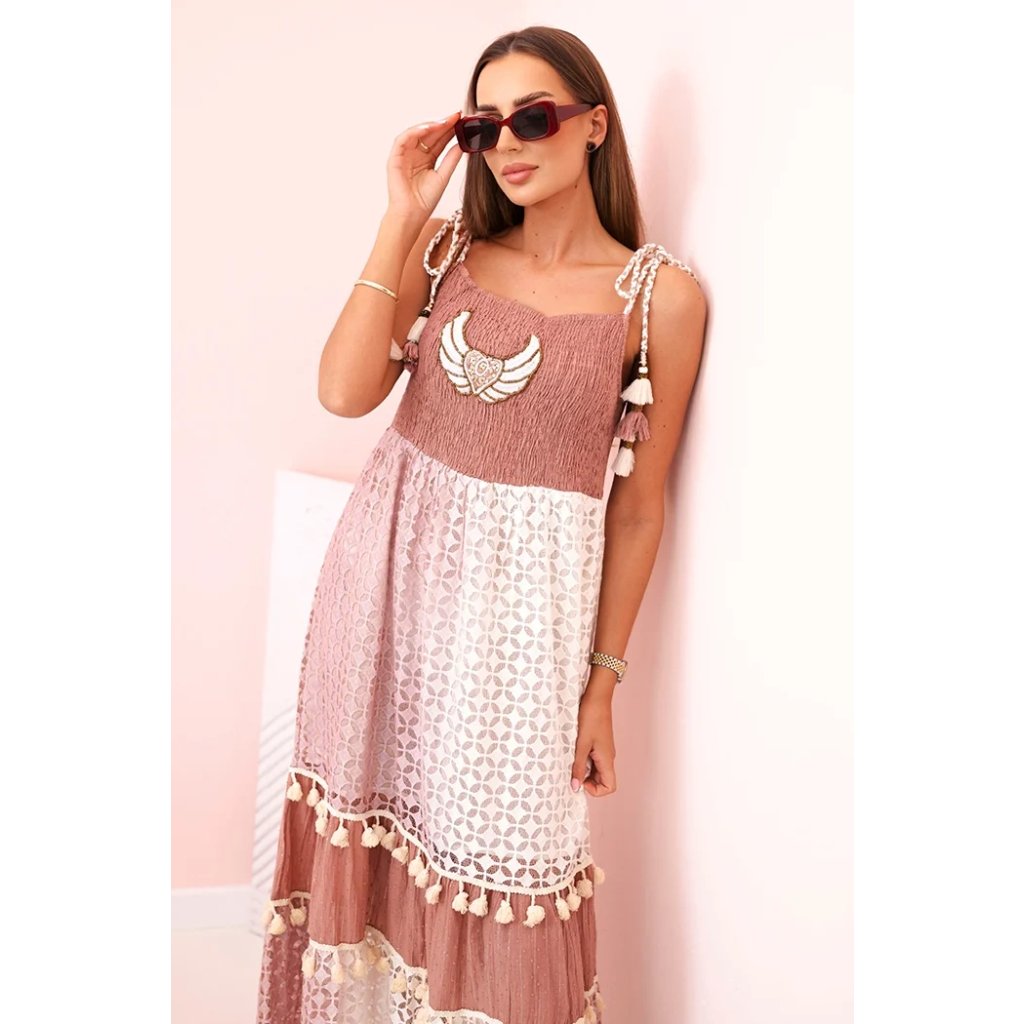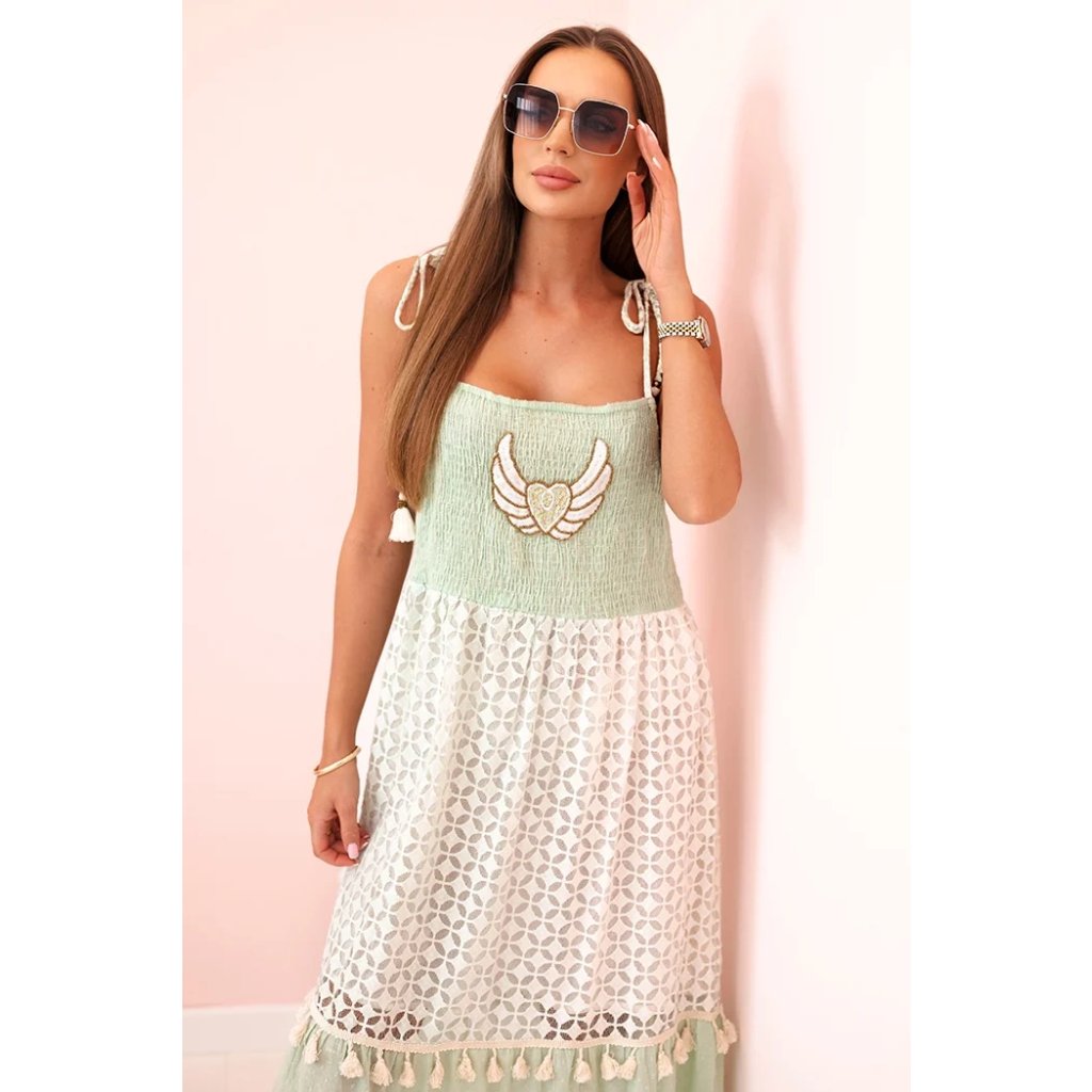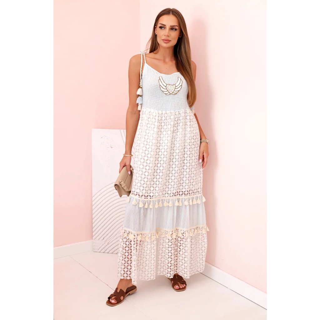Tieto dámske šaty v boho štýle sú skvelou voľbou na teplé dni, keď chcete vyzerať žensky, ležérne a štýlovo. Sú vyrobené zo 100 % bavlny, čo zaručuje pohodlie a priedušnosť počas celého dňa. Vrchnú časť šiat zdobí výšivka v tvare krídla a ozdobné strapcové šnúrky na ramienkach, ktoré modelu dodávajú jedinečný charakter. Spodná časť z jemnej čipky s geometrickým vzorom, pretkaná volánmi so strapcami, zdôrazňuje ľahkosť a romantický štýl. Ideálna voľba na letné prechádzky, dovolenku alebo festivaly. Šaty vyzerajú skvele so sandálmi, espadrilkami alebo papučami. Veľkosť je univerzálna a padne dámam s veľkosťou S, M alebo L.