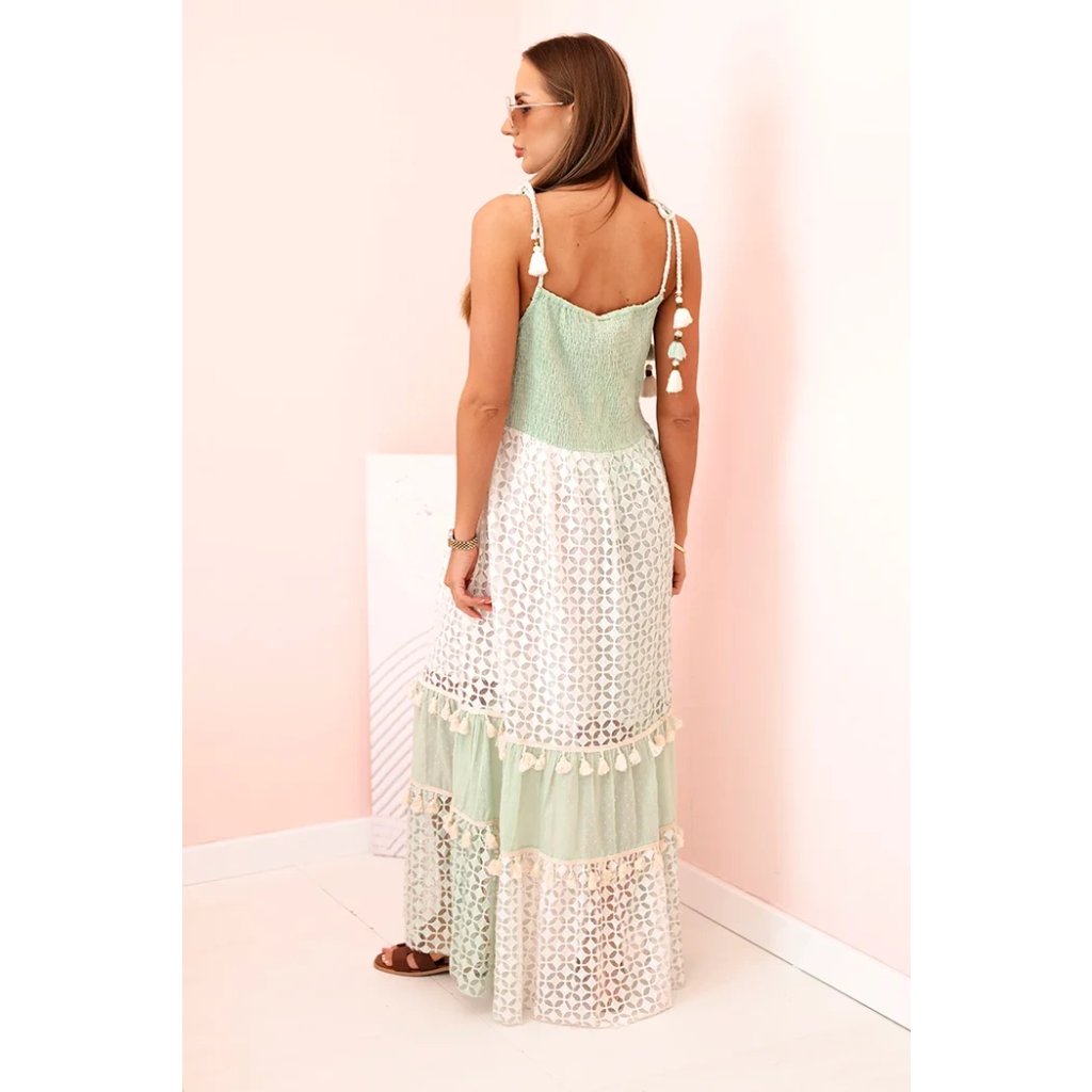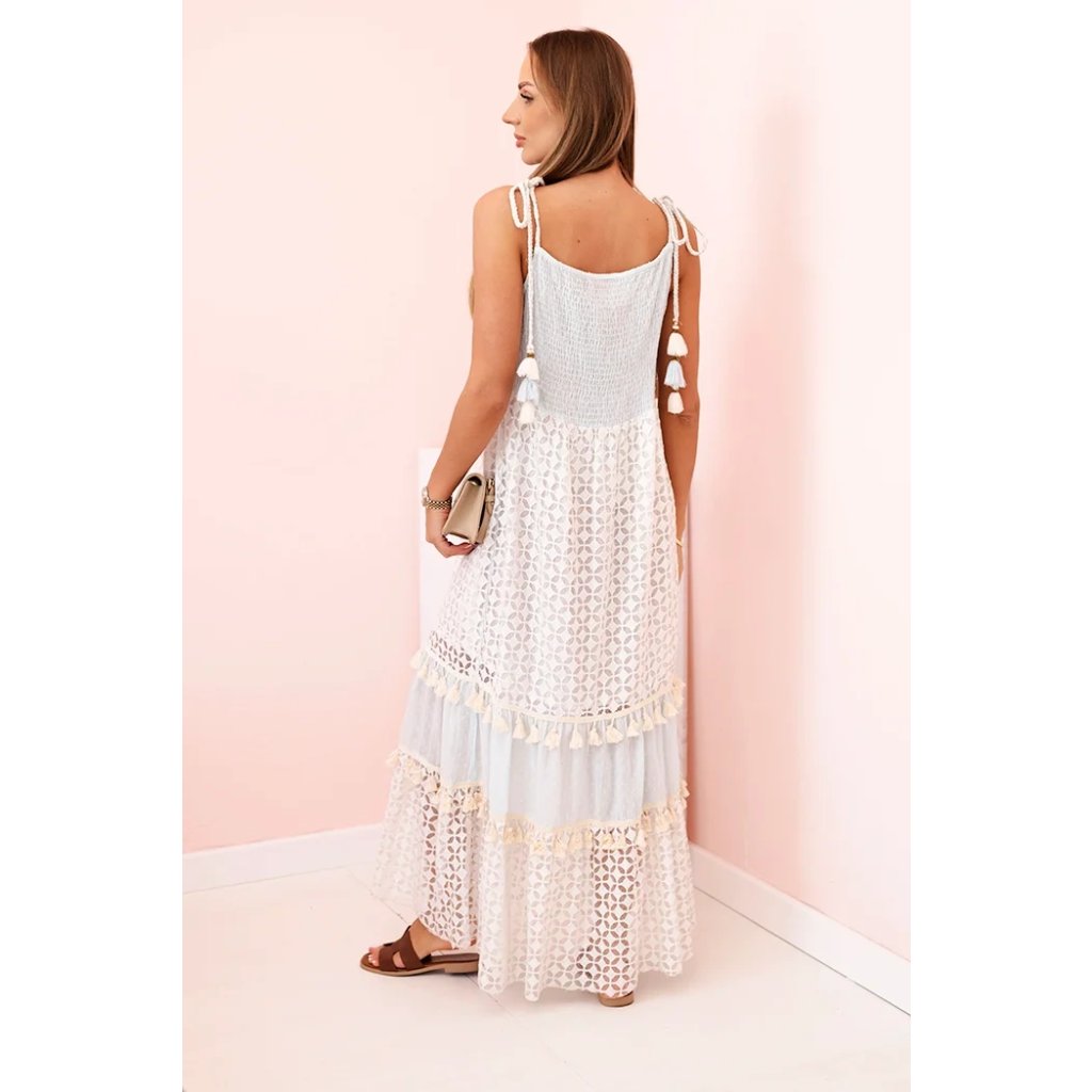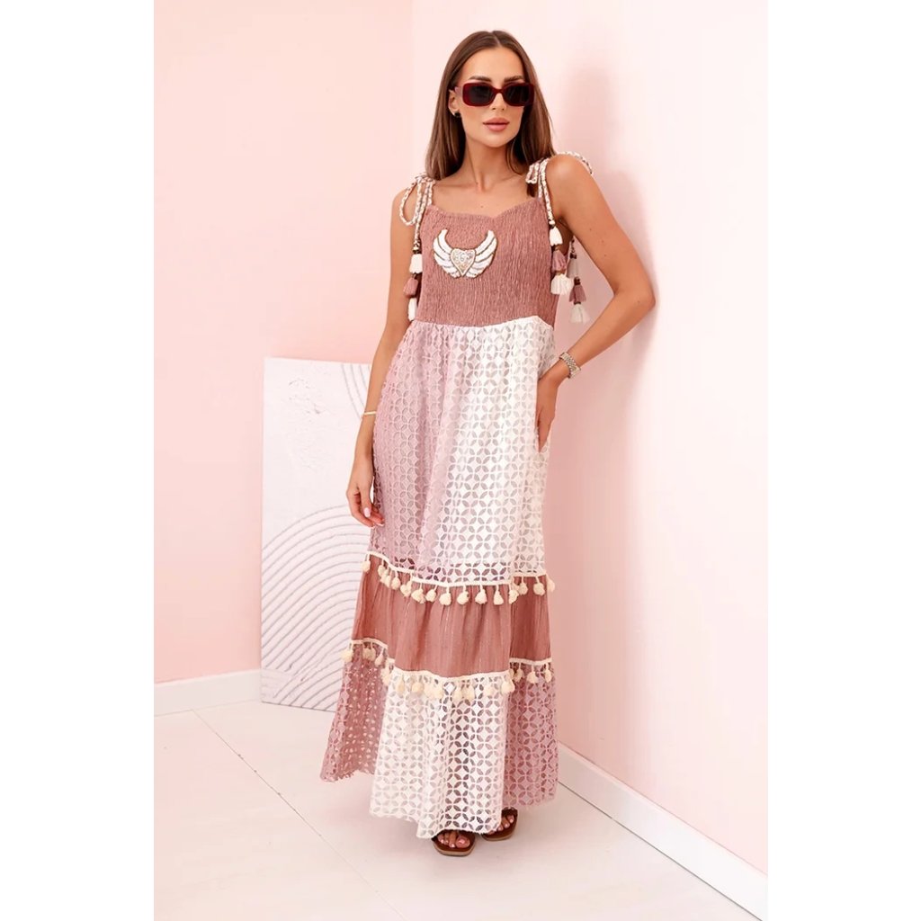 Tieto dámske šaty v boho štýle sú skvelou voľbou na teplé dni, keď chcete vyzerať žensky, ležérne a štýlovo. Sú vyrobené zo 100 % bavlny, čo zaručuje pohodlie a priedušnosť počas celého dňa. Vrchnú časť šiat zdobí výšivka v tvare krídla a ozdobné strapcové šnúrky na ramienkach, ktoré modelu dodávajú jedinečný charakter. Spodná časť z jemnej čipky s geometrickým vzorom, pretkaná volánmi so strapcami, zdôrazňuje ľahkosť a romantický štýl. Ideálna voľba na letné prechádzky, dovolenku alebo festivaly. Šaty vyzerajú skvele so sandálmi, espadrilkami alebo papučami. Veľkosť je univerzálna a padne dámam s veľkosťou S, M alebo L.