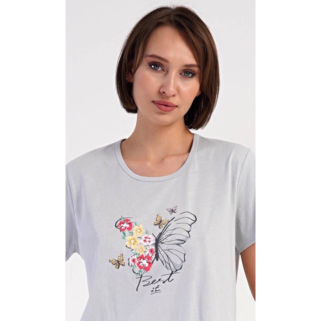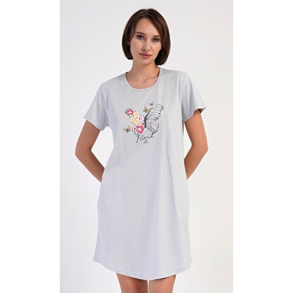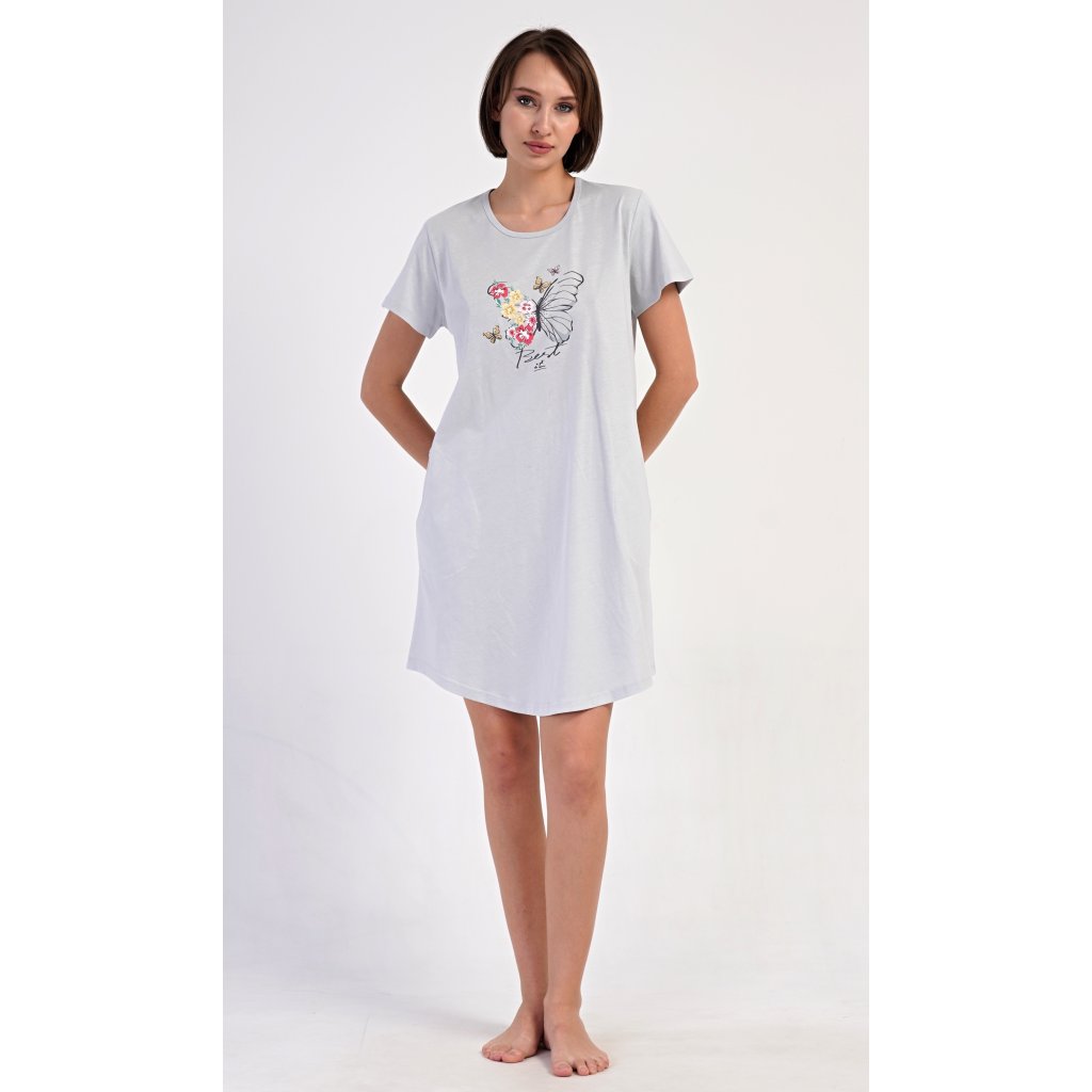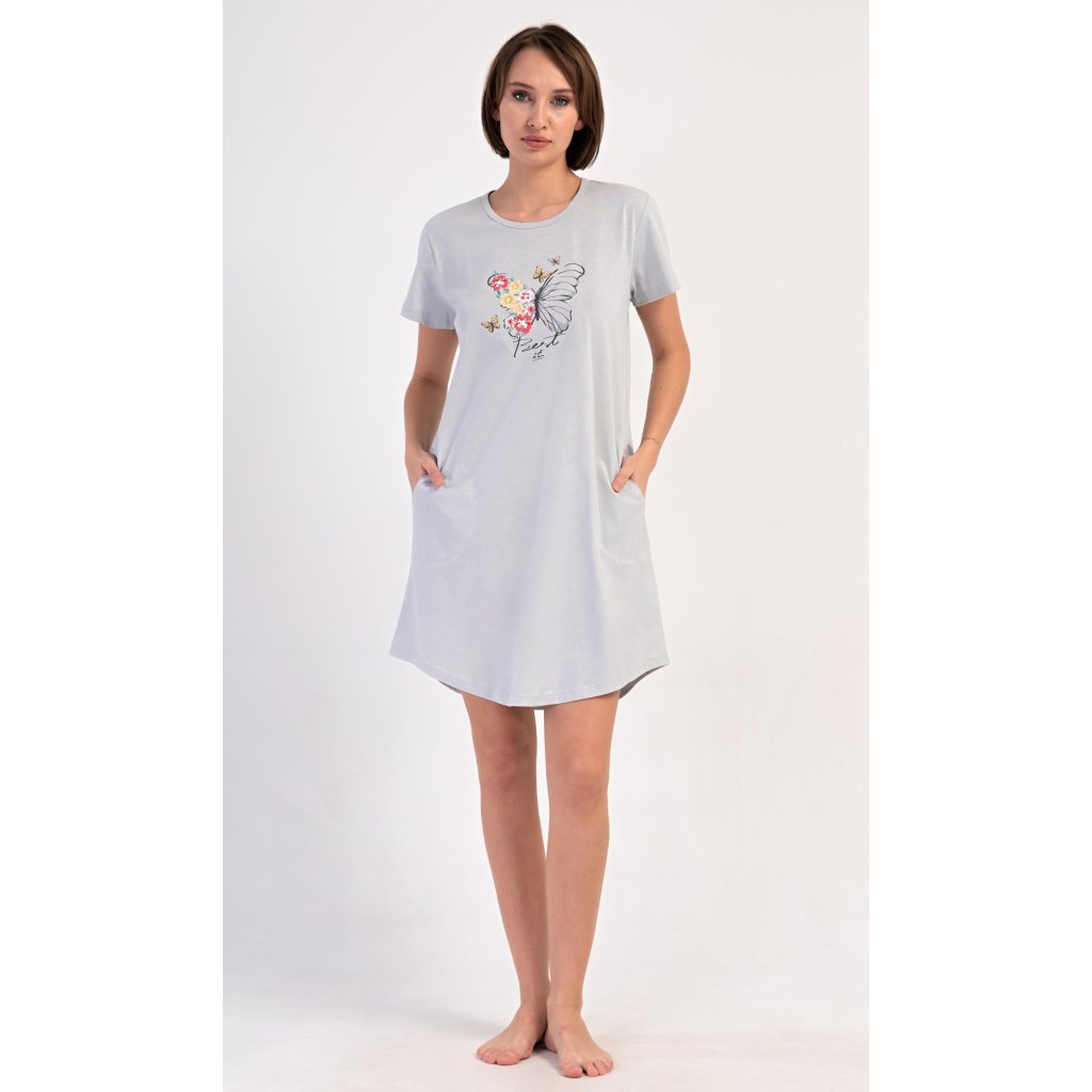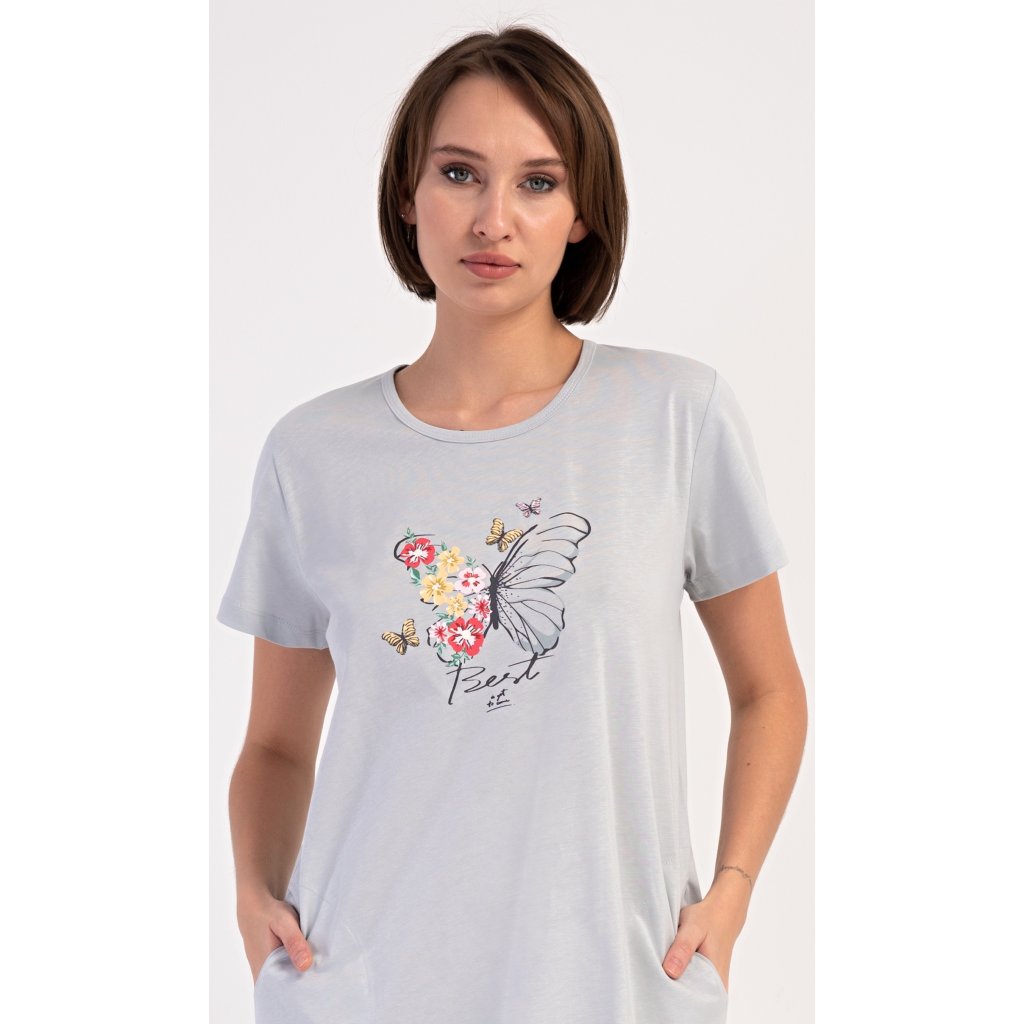 Dámske bavlnené domáce šaty s krátkym rukávom Amelia. Domáce jednofarebné šaty s okrúhlym výstrihom a vreckami zdobí na hrudi obrázok motýľa a kvetov. Použitý bavlnený materiál je príjemný a pružný na dotyk. Šaty sú pohodlné, vhodné na spanie aj každodenné nosenie.