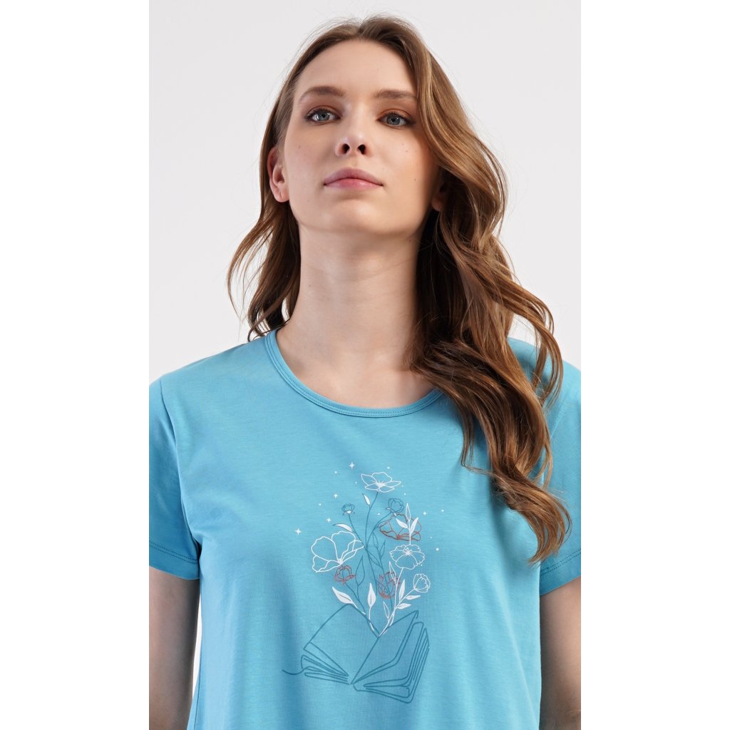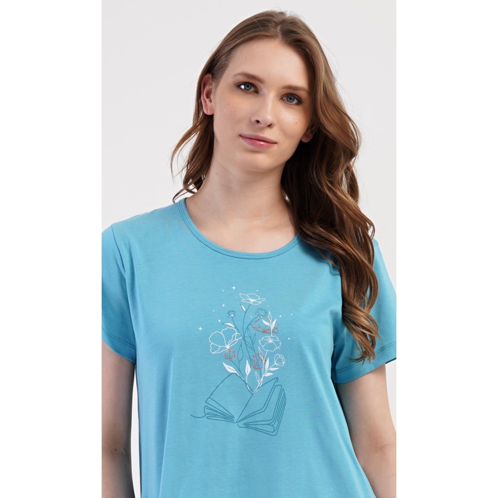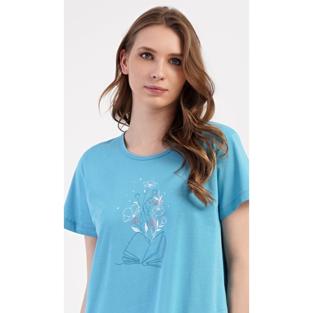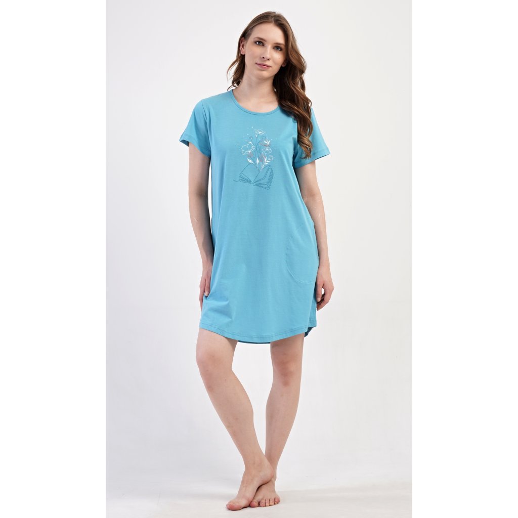 Dámske bavlnené domáce šaty s krátkym rukávom Book. Domáce jednofarebné šaty s okrúhlym výstrihom a vreckami zdobí na hrudi obrázok knihy a kvetov. Použitý bavlnený materiál je príjemný a pružný na dotyk. Šaty sú pohodlné, vhodné na spanie aj každodenné nosenie.