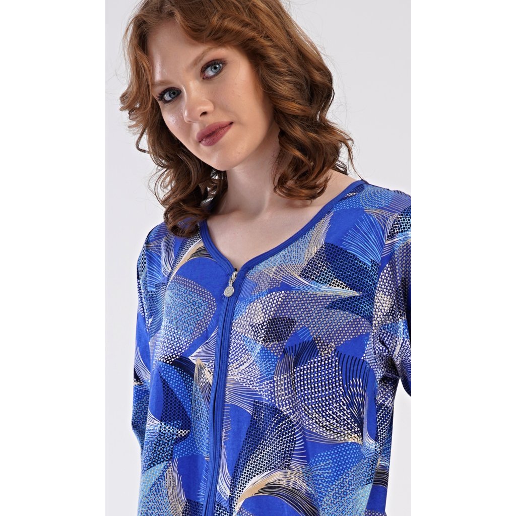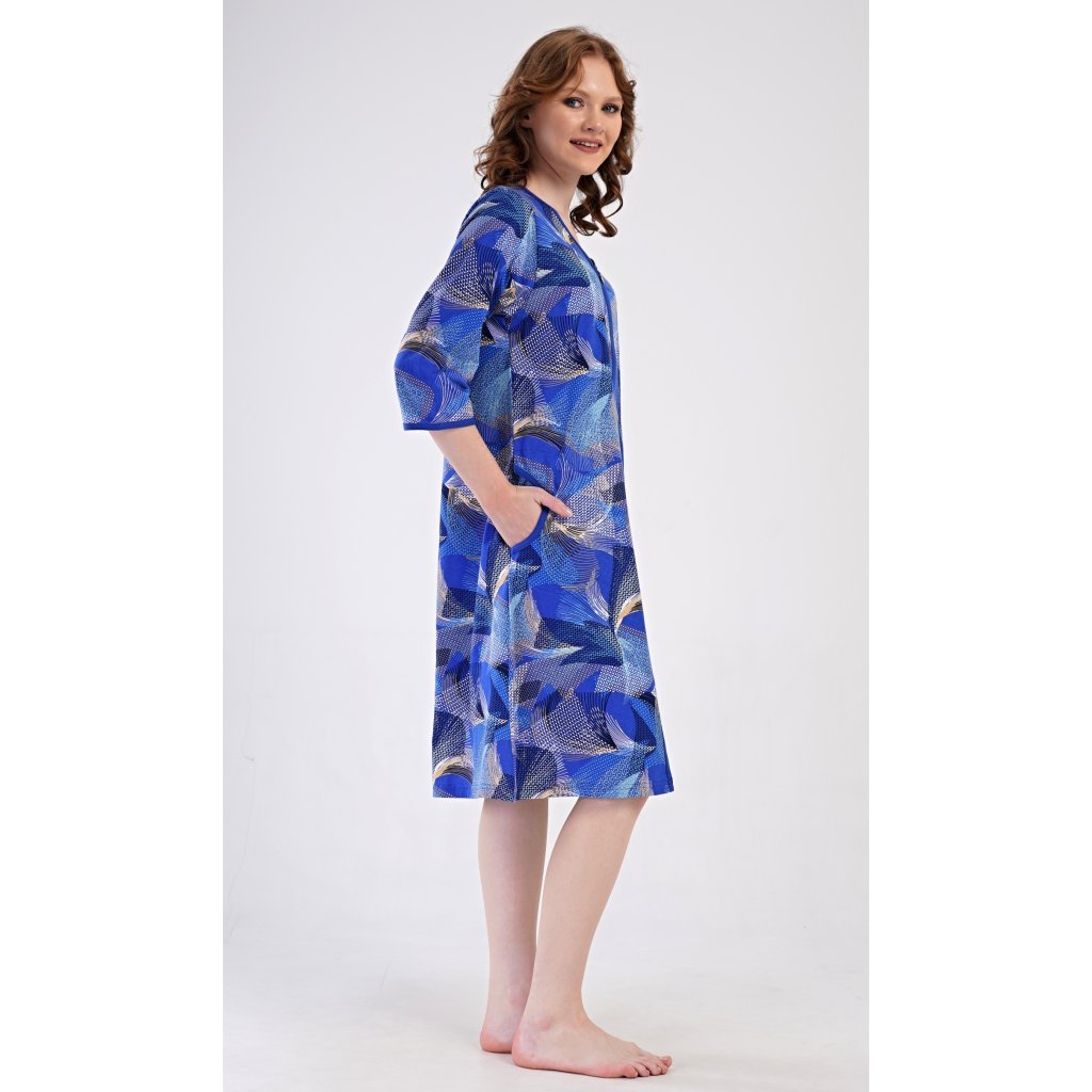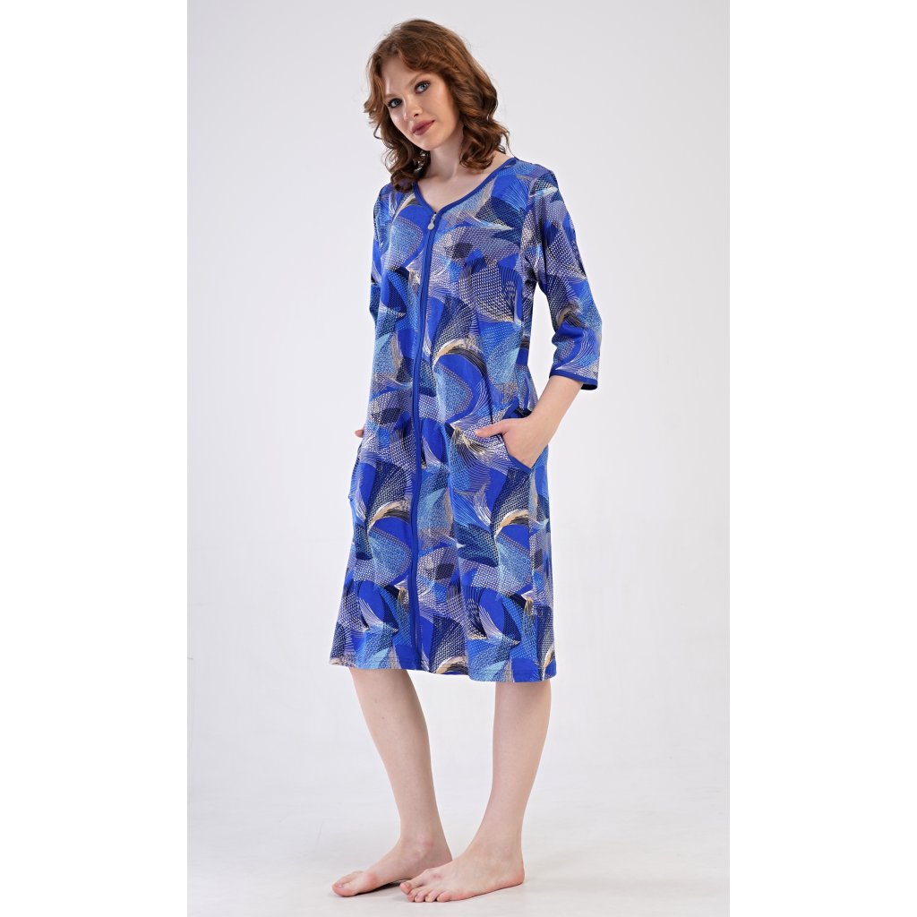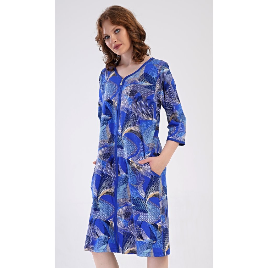 Dámske bavlnené domáce šaty s trojštvrťovým rukávom Eliza. Pohodlné šaty bez zapínania v príjemnej dĺžke pod kolená využijete takmer na všetky voľnočasové aktivity. Majú praktické vrecká a zapínanie na zips. Šaty sú potlačené geometrickými vzormi. Použitý bavlnený materiál je príjemný a pružný na dotyk.