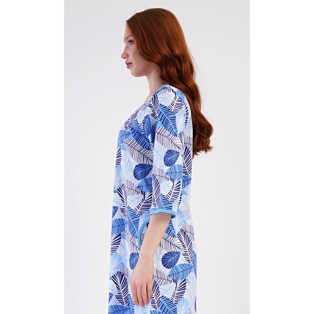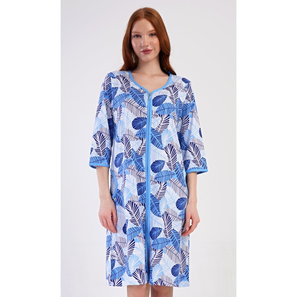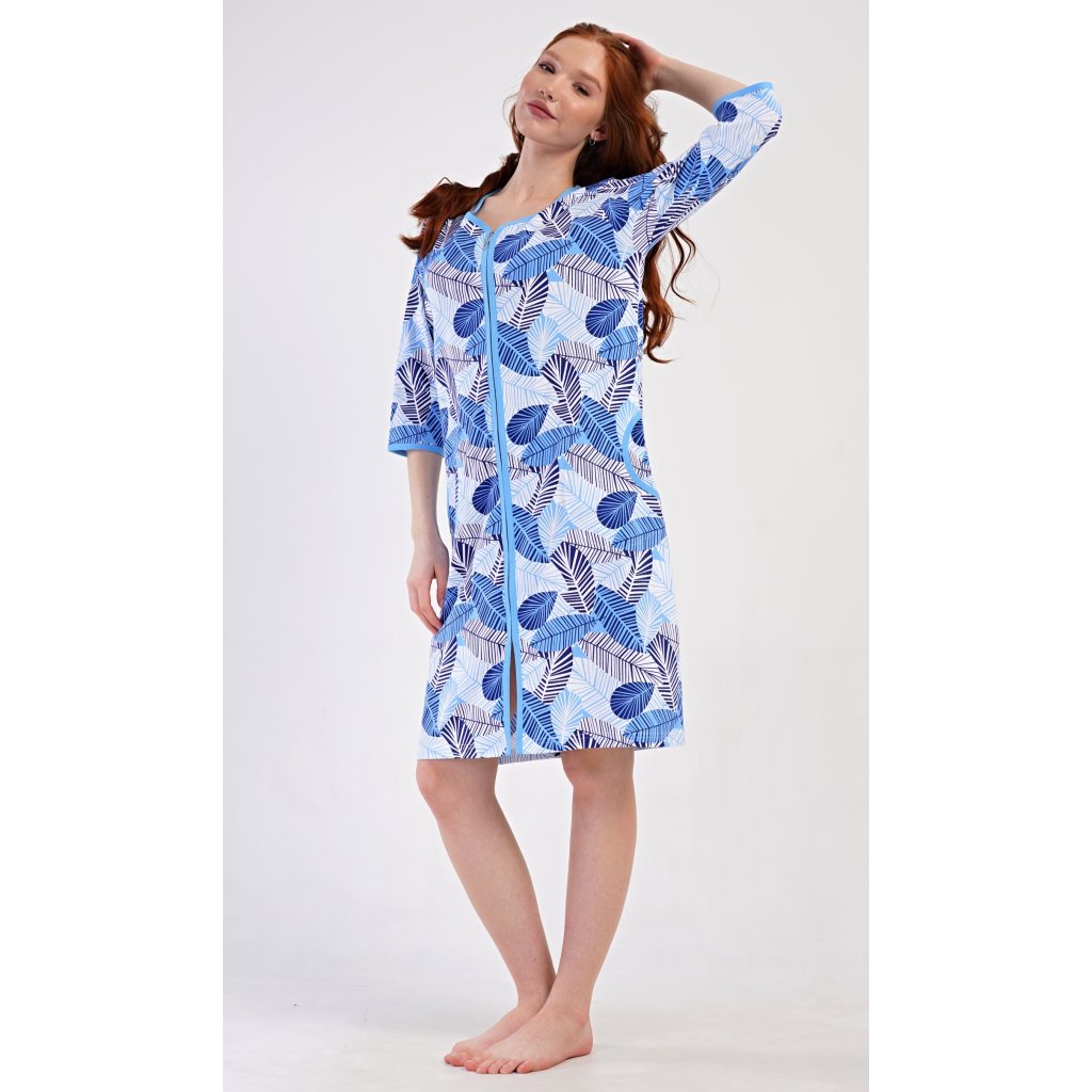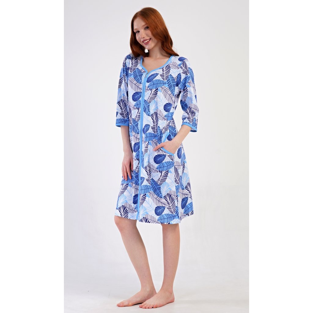 Dámske bavlnené domáce šaty s trojštvrťovým rukávom Julie. Pohodlné šaty bez zapínania v príjemnej dĺžke pod kolená využijete takmer na všetky voľnočasové aktivity. Majú praktické vrecká a zapínanie na zips. Šaty sú potlačené listami. Použitý bavlnený materiál je príjemný a pružný na dotyk.