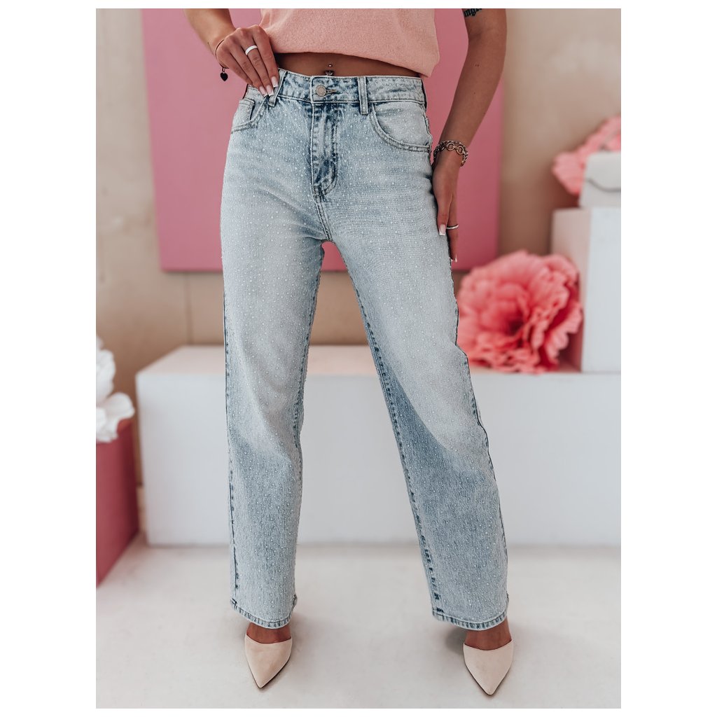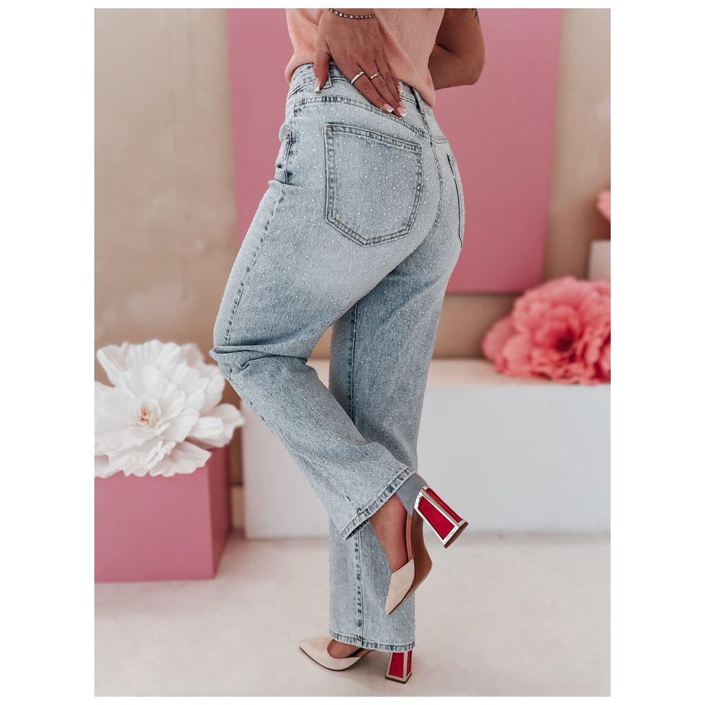 Módne džínsy s vysokým pásom a širokými nohavicami, ktoré kombinujú pohodlie s elegantným nádychom. Dekoratívne priehľadné diamanty dodávajú jemný trbliet, zatiaľ čo klasický strih opticky predlžuje nohavice. Majú zapínanie na gombík a zips a štyri tradičné vrecká, vďaka čomu sú pohodlné a štýlové na každú príležitosť.